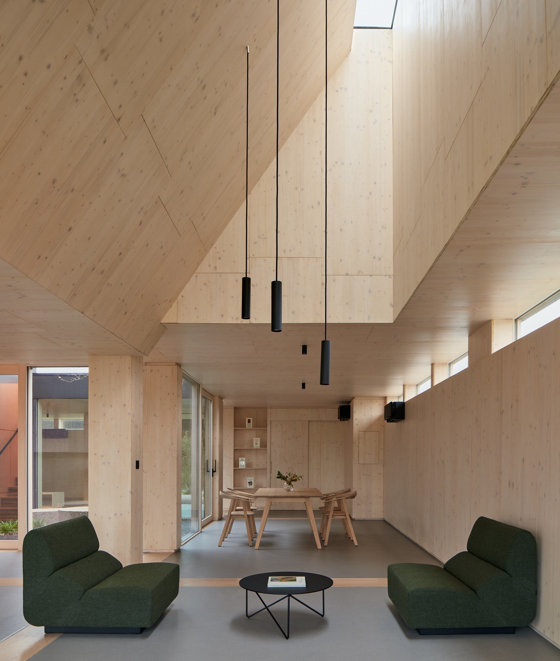 - Moduly budovy s pohyblivými tieneniami umožňujú dodatočnú hru so slnečným svetlom a asketické interiéry oteplené použitím drevených obkladov vytvárajú dobrý priestor pre ťažké rozhovory o chorobe a osobné úvahy.