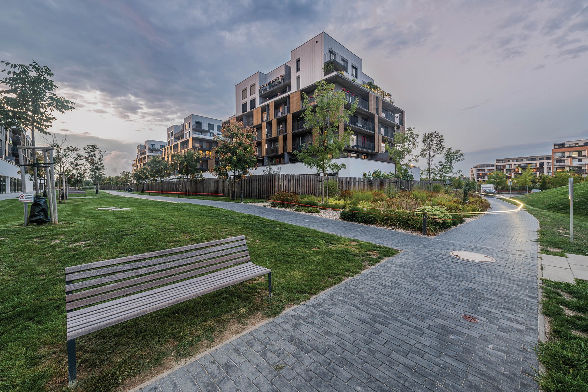 - Samotné obytné domy vykazujú kvalitné pôdorysné riešenia, vonkajšie terasy a loggie rozširujú každý bytový priestor o veľkorysé exteriérové plochy. Parkové priestory celej lokality doplnené priestormi pre deti a detským ihriskom a sústredené obchodné priestory pre posedenie pri káve či zmrzline na terase vytvorili rovnako výborné a v súčasnosti veľmi žiadané predpoklady pre intenzívny komunitný život.