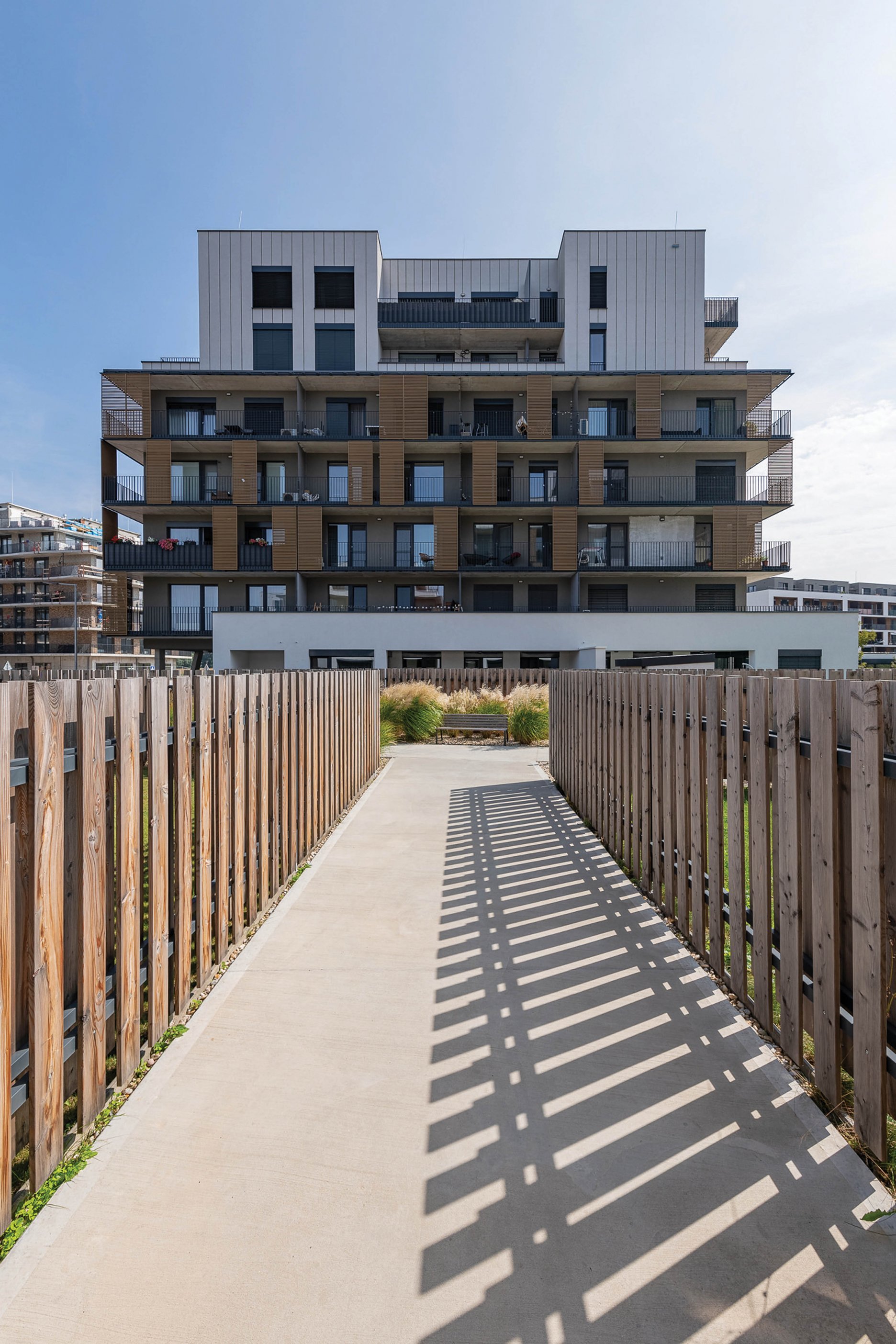 - Porota ocenila predovšetkým prácu s verejným a poloverejným priestorom obytného súboru. Mierka a výška korunných ríms, použité materiály fasád predovšetkým prírodného charakteru i riešenie „susedských“ predzáhradiek evokuje príjemne obytné mestské prostredie.