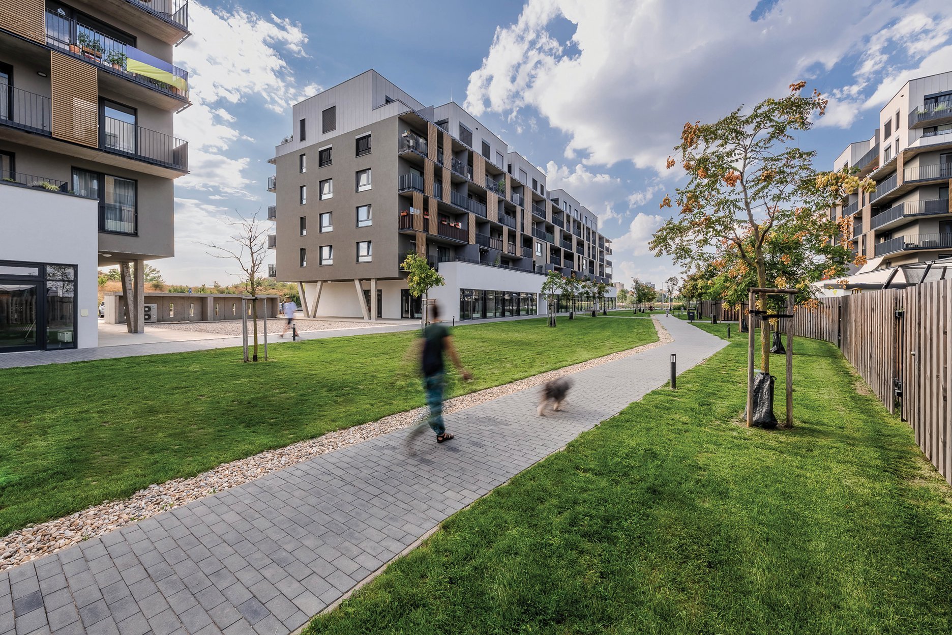 - Zručne bolo využité realizovanie vysokej zelene od strany verejných ciest až po nízku zeleň Samotné obytné domy vykazujú kvalitné pôdorysné riešenia, vonkajšie terasy a loggie rozširujú každý bytový priestor o veľkorysé exteriérové plochy. Parkové priestory celej lokality doplnené priestormi pre deti a detským ihriskom a sústredené obchodné priestory pre posedenie pri káve či zmrzline na terase vytvorili rovnako výborné a v súčasnosti veľmi žiadané predpoklady pre intenzívny komunitný život.