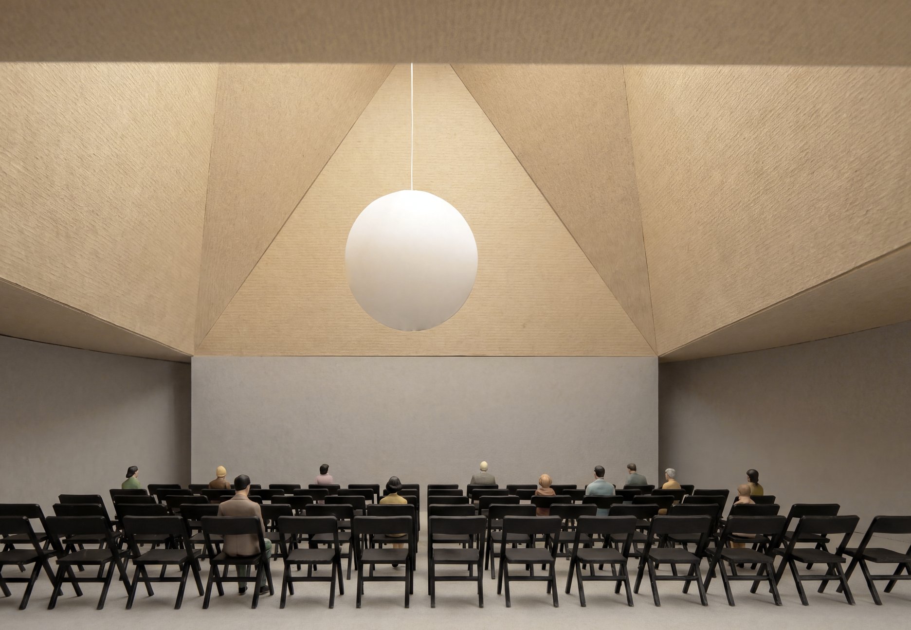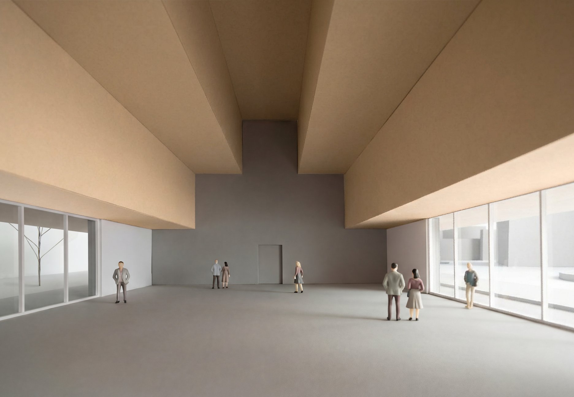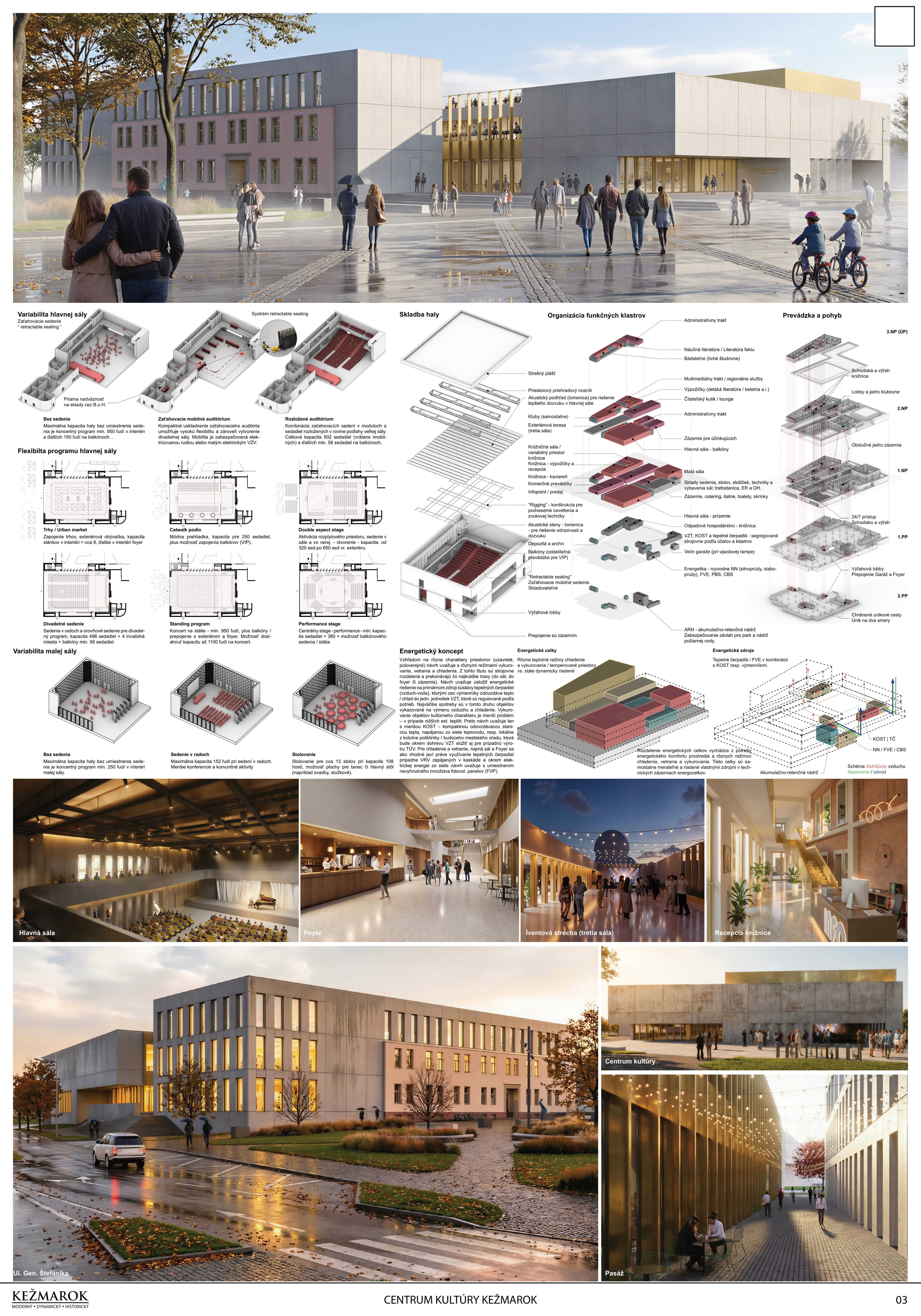 Formálne riešenie sa vyznačuje čitateľnou súdobou architektúrou, ktorá rešpektuje okolie a nesnaží sa o falošný historizmus. Jadrom dispozičného riešenia je vnútorné kríženie ťažiskových priestorov, ktoré prináša vysokú mieru otvárateľnosti a priestorovej variability. Tento striktný a racionálny systém však v praxi prináša zásadné prevádzkové úskalia. Priestorová kompozícia problematizuje vzťah medzi malou a veľkou sálou, čím medzi nimi vzniká nežiaduca vizuálna a funkčná rivalita. Kompaktná hmota s krížovou dispozíciou navodzuje skôr pocit tranzitného komunikačného uzla než plnohodnotného a pokojného pobytového priestoru. Porota tiež vnímala riziká spojené s akustikou, intimitou a fungovaním jednotlivých sál, keďže viacnásobné vstupy zo všetkých strán a nadmerná variabilita môžu v konečnom dôsledku generovať množstvo prevádzkových obmedzení a kompromisov pri súbežnom konaní podujatí. Uvedené kompromisy sa premietajú aj do foyeru, ktorý vo svojej polohe nedokáže naraz plnohodnotne obslúžiť obe sály.