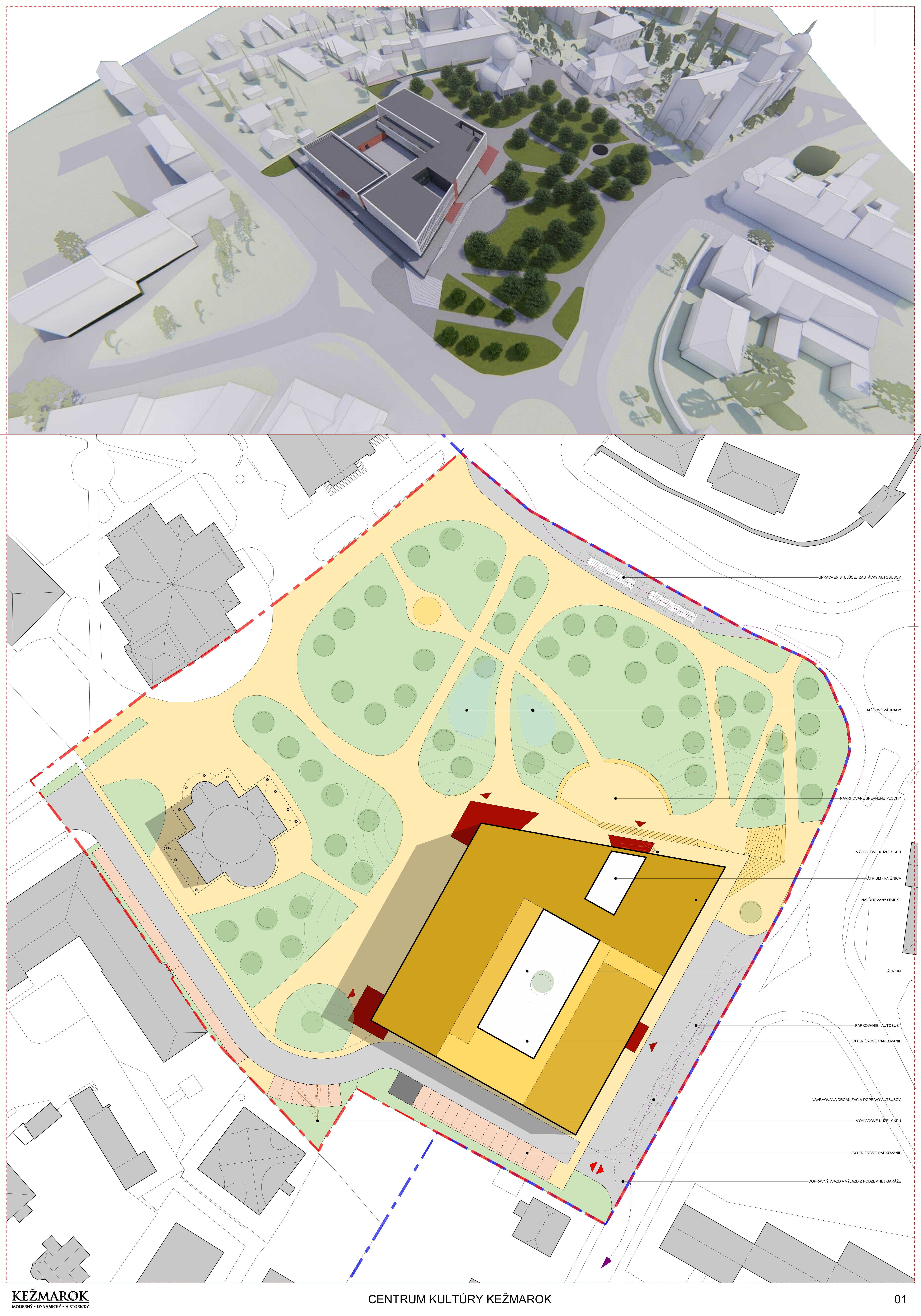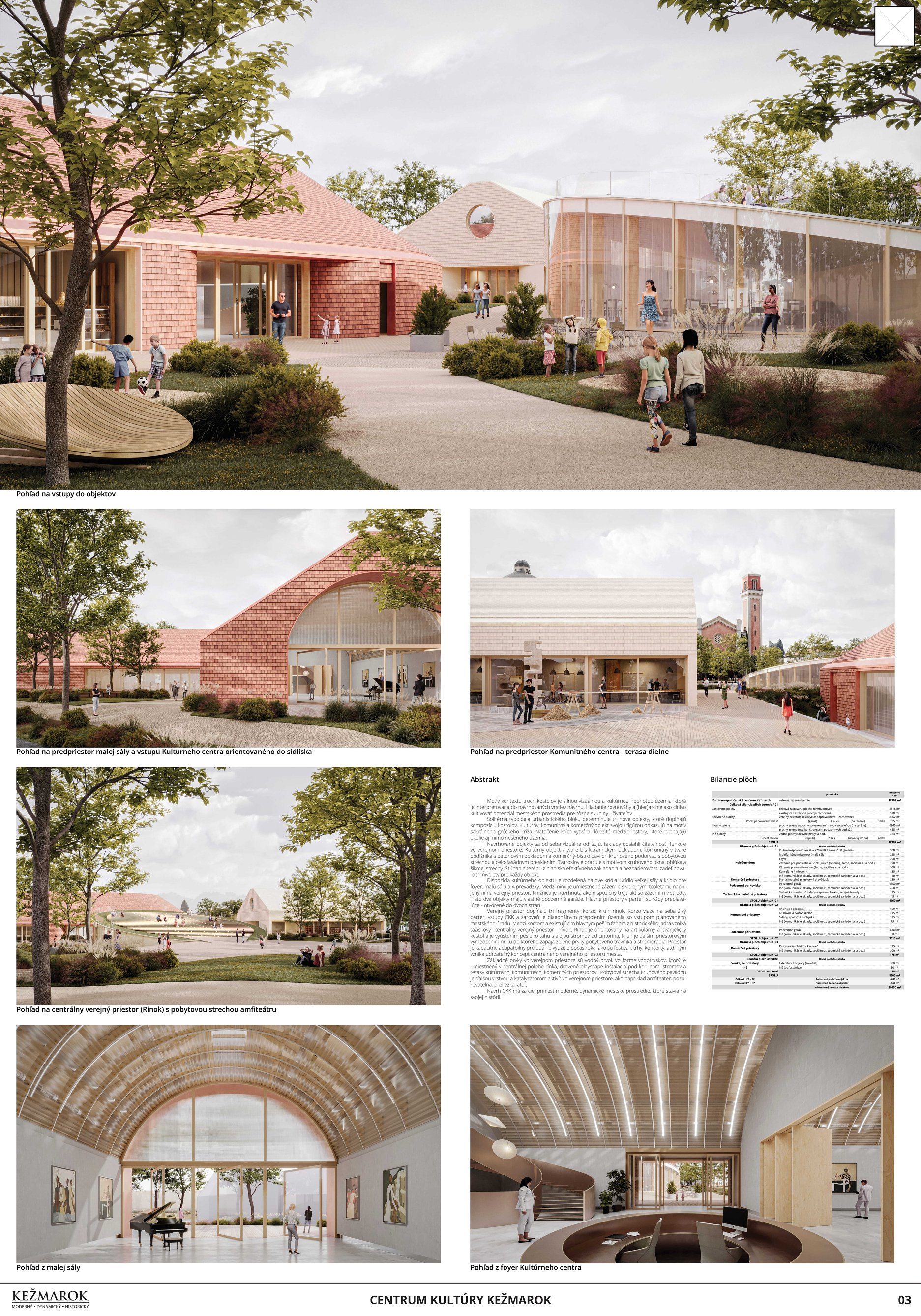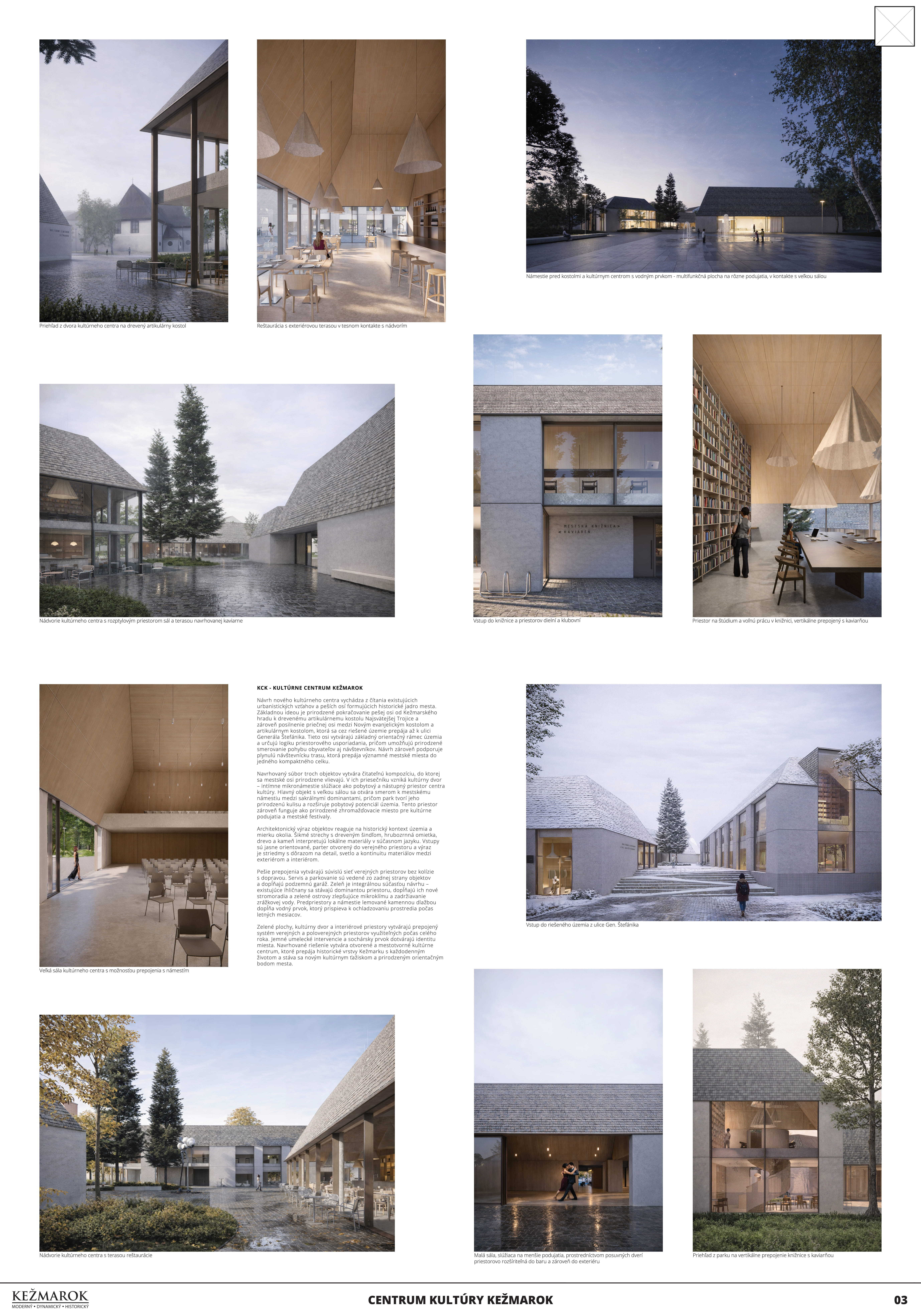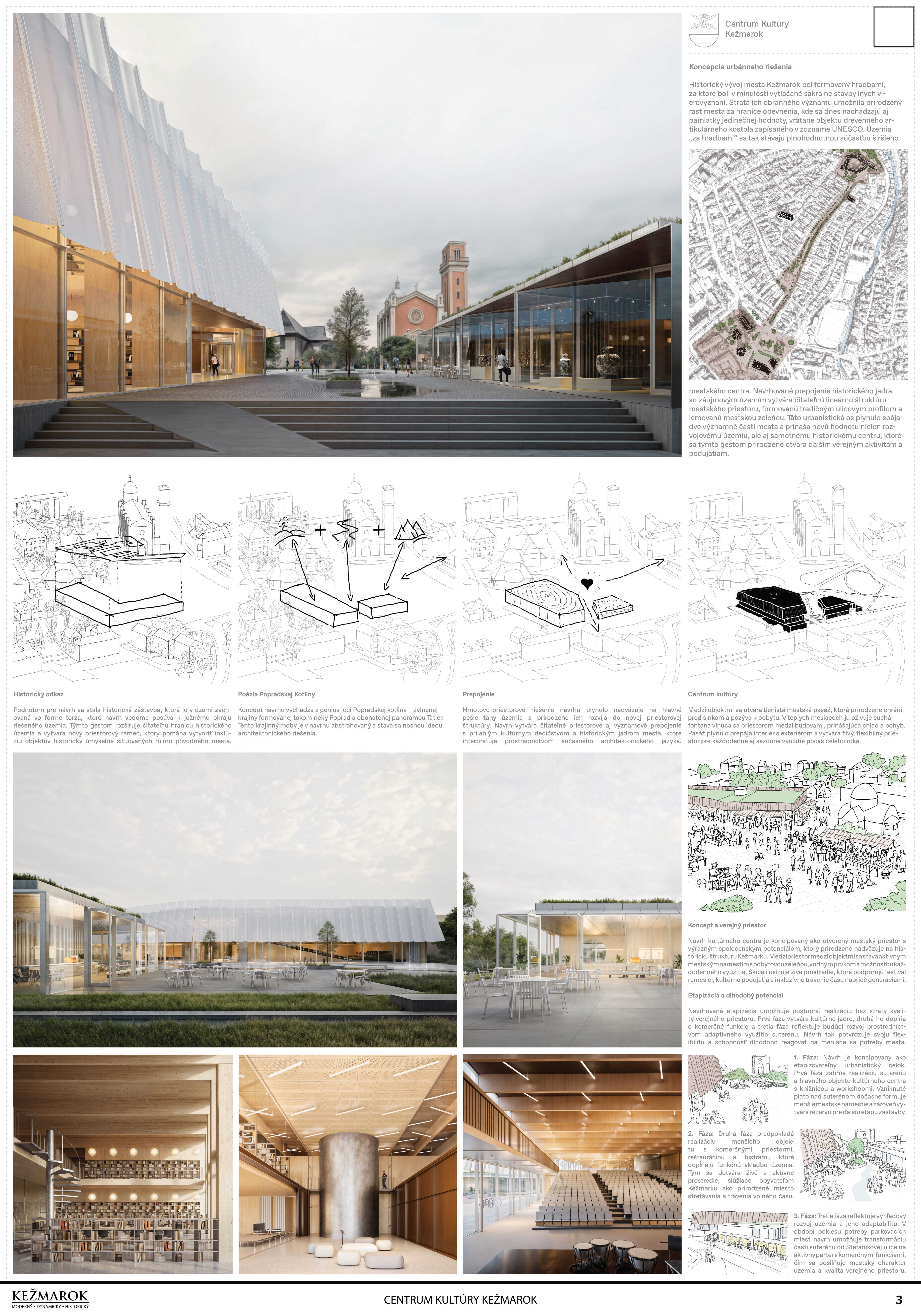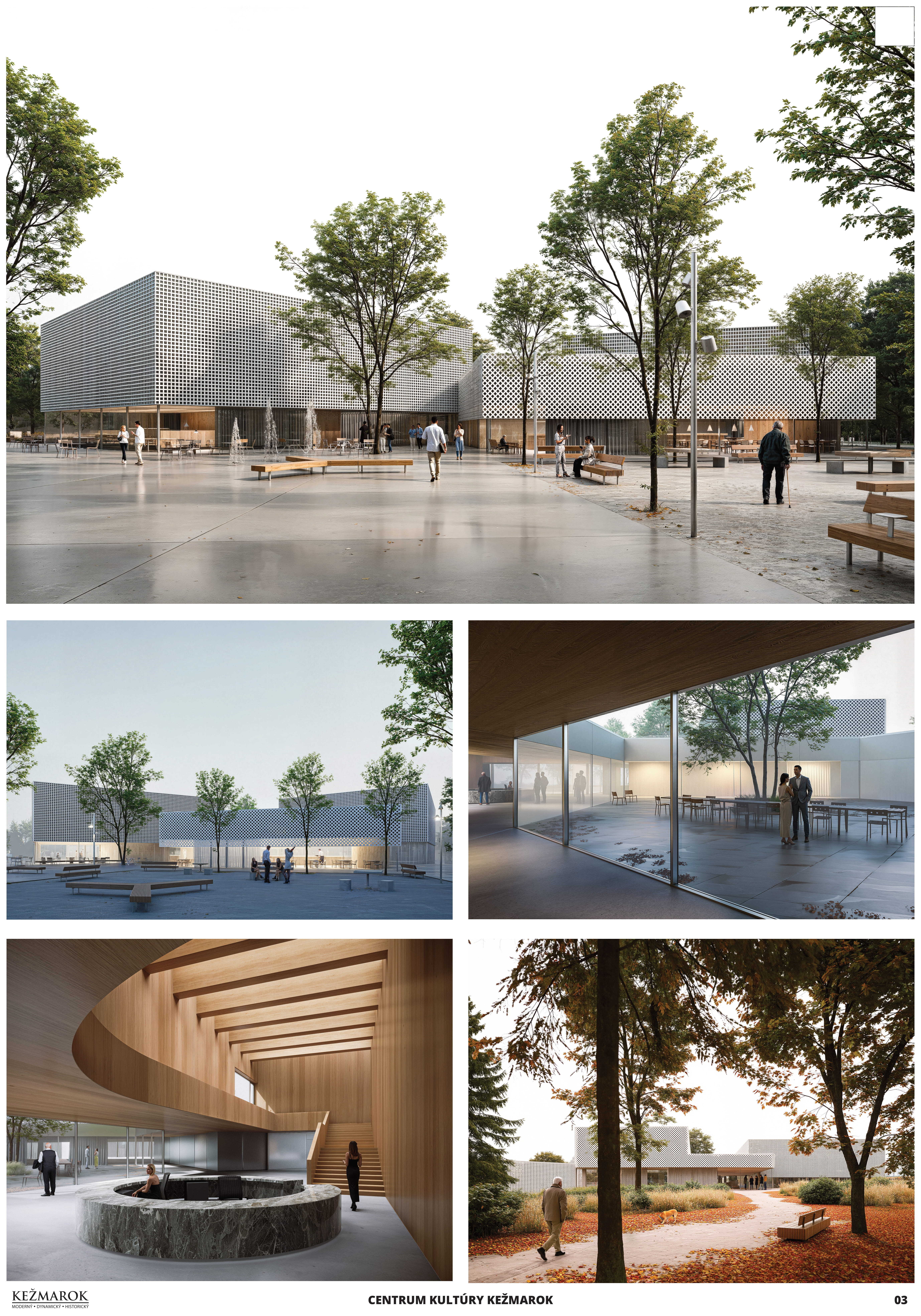 Slovo poroty a zhodnotenie súťaže: Hľadanie podoby nového centra kultúry v Kežmarku je témou, ktorá ďaleko presahuje samotnú stavbu. Ide o rozhodovanie o budúcej podobe významného verejného priestoru v bezprostrednom kontakte s historickými vrstvami mesta, sakrálnymi dominantami a pamiatkovo citlivým prostredím. Porota preto mimoriadne oceňuje, že mesto Kežmarok sa rozhodlo riešiť túto úlohu formou architektonickej súťaže, teda transparentným a odborne zodpovedným spôsobom, ktorý umožňuje porovnať široké spektrum prístupov a vybrať riešenie s najvyššou mierou kvality.