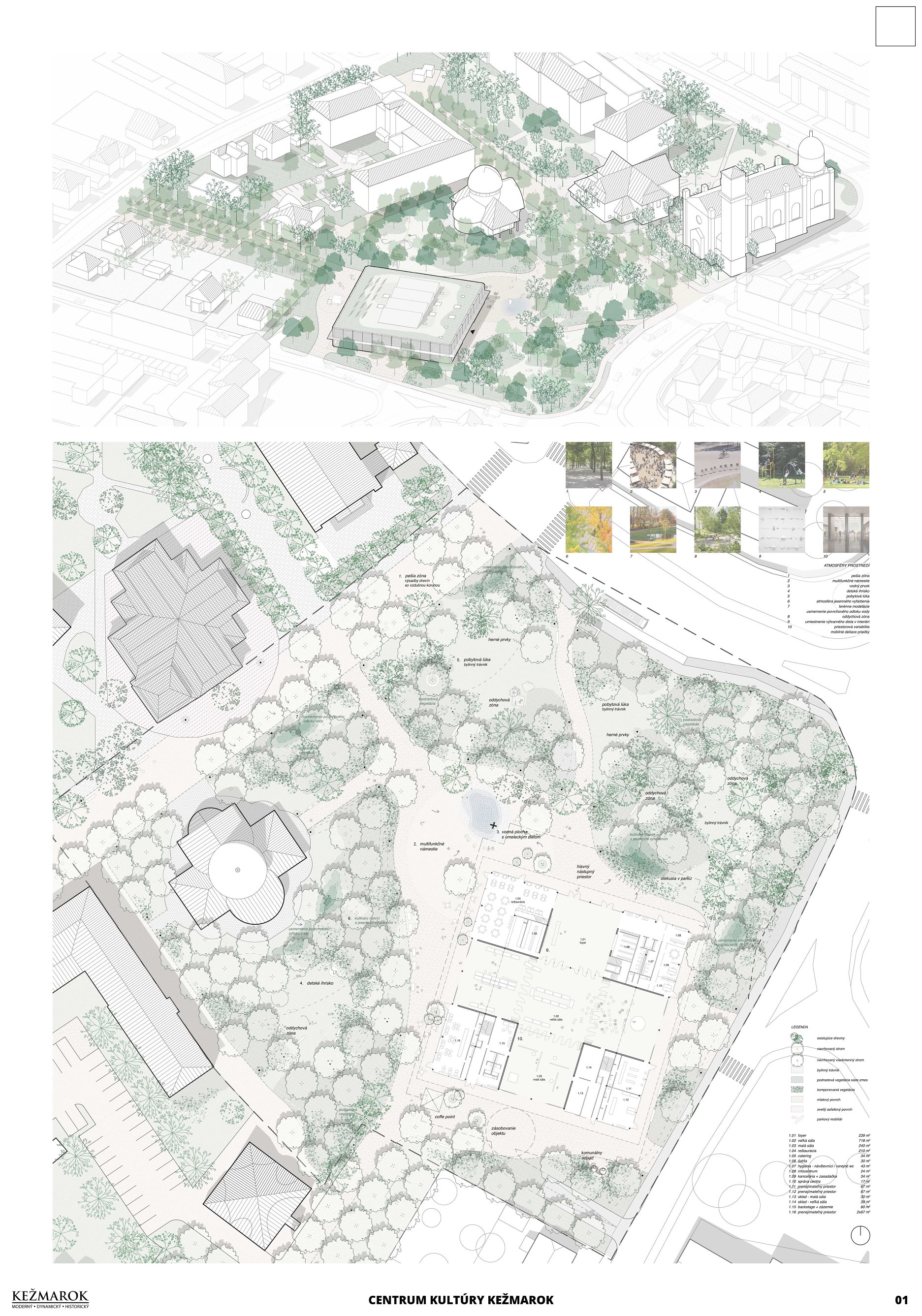 Prístup k exteriérovým plochám je koncepčne založený na vytvorení rozsiahleho zjednocujúceho priestoru, ktorý prepája novú architektúru s historickým kontextom. Veľká dláždená plocha však vizuálne zrovnoprávňuje všetky objekty bez dodatočnej vegetačnej artikulácie, čo si v ďalšom stupni žiada prehodnotenie proporcie a mierky námestia vo vzťahu k monumentalite a pamiatkovej hodnote priľahlých chrámov. Zvolená koncepcia drevín a prvkov vo verejnom priestore pôsobí v lokálnom kontexte Kežmarku nejednoznačne. Porota celkovo vníma krajinno-architektonickú vrstvu tohto návrhu ako podcenenú, avšak s priestorom na dopracovanie. Návrh by mal zvážiť doplnenie vegetačných plôch priamo v priestore námestia a adekvátne prehodnotenie výsadby.