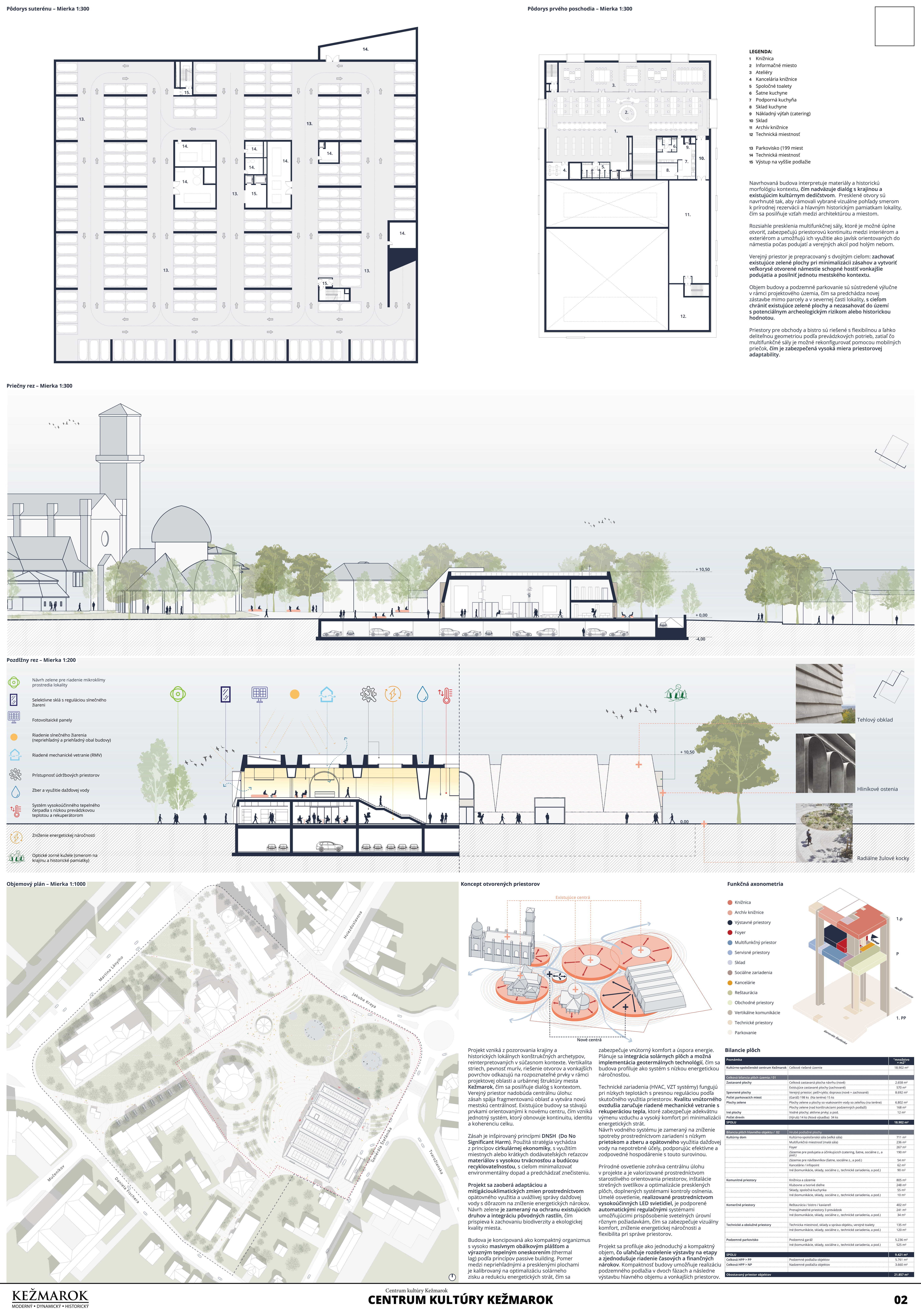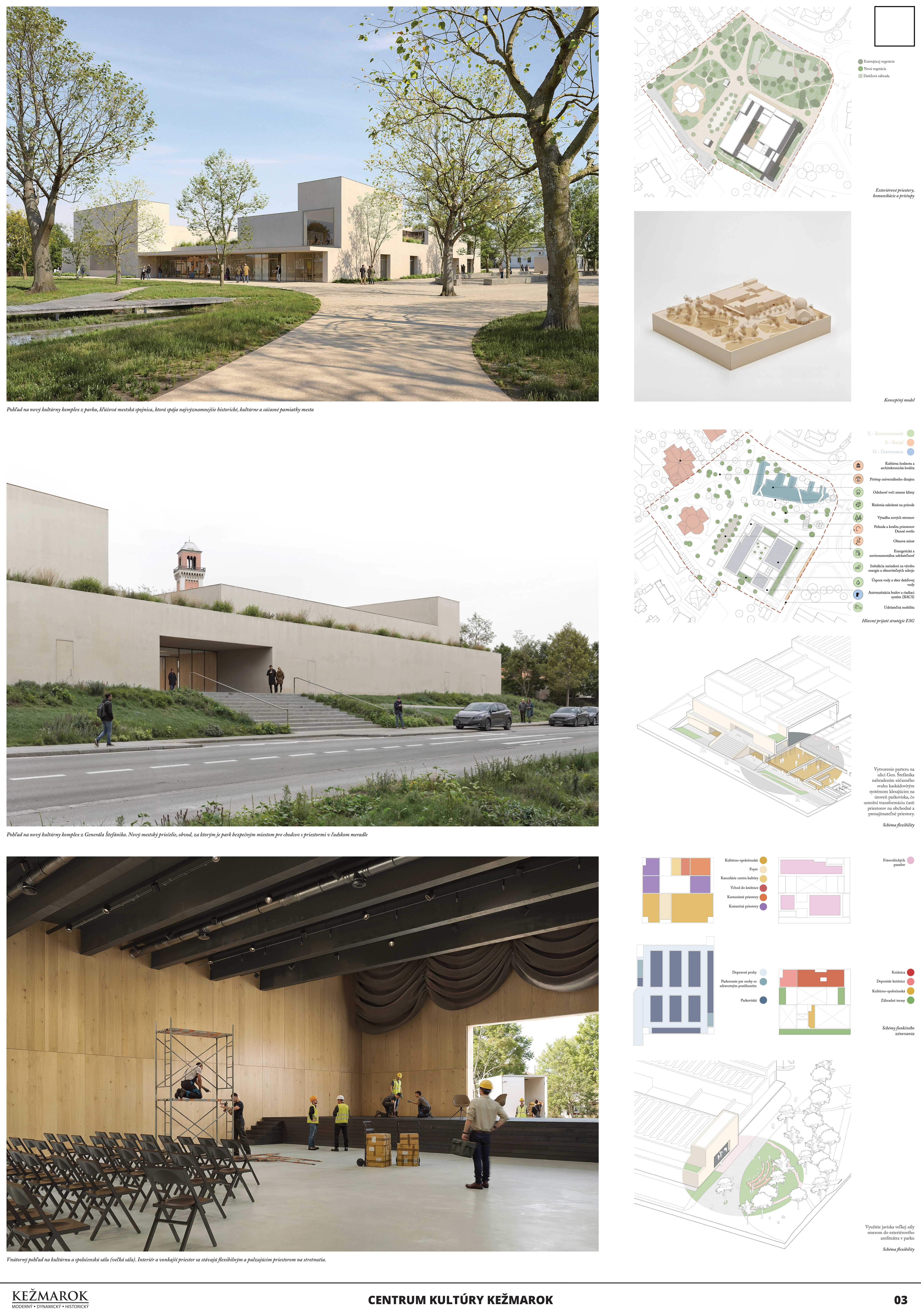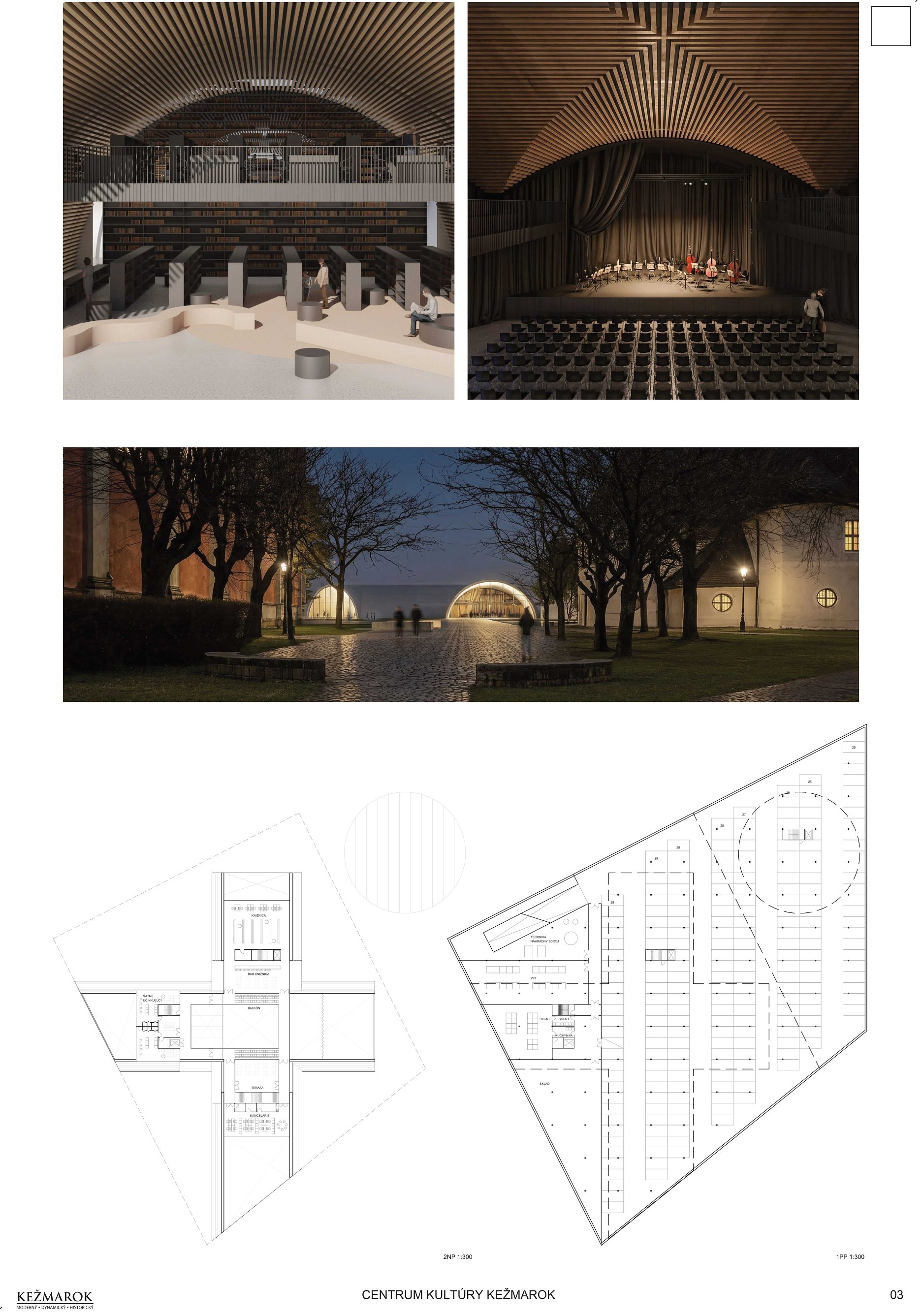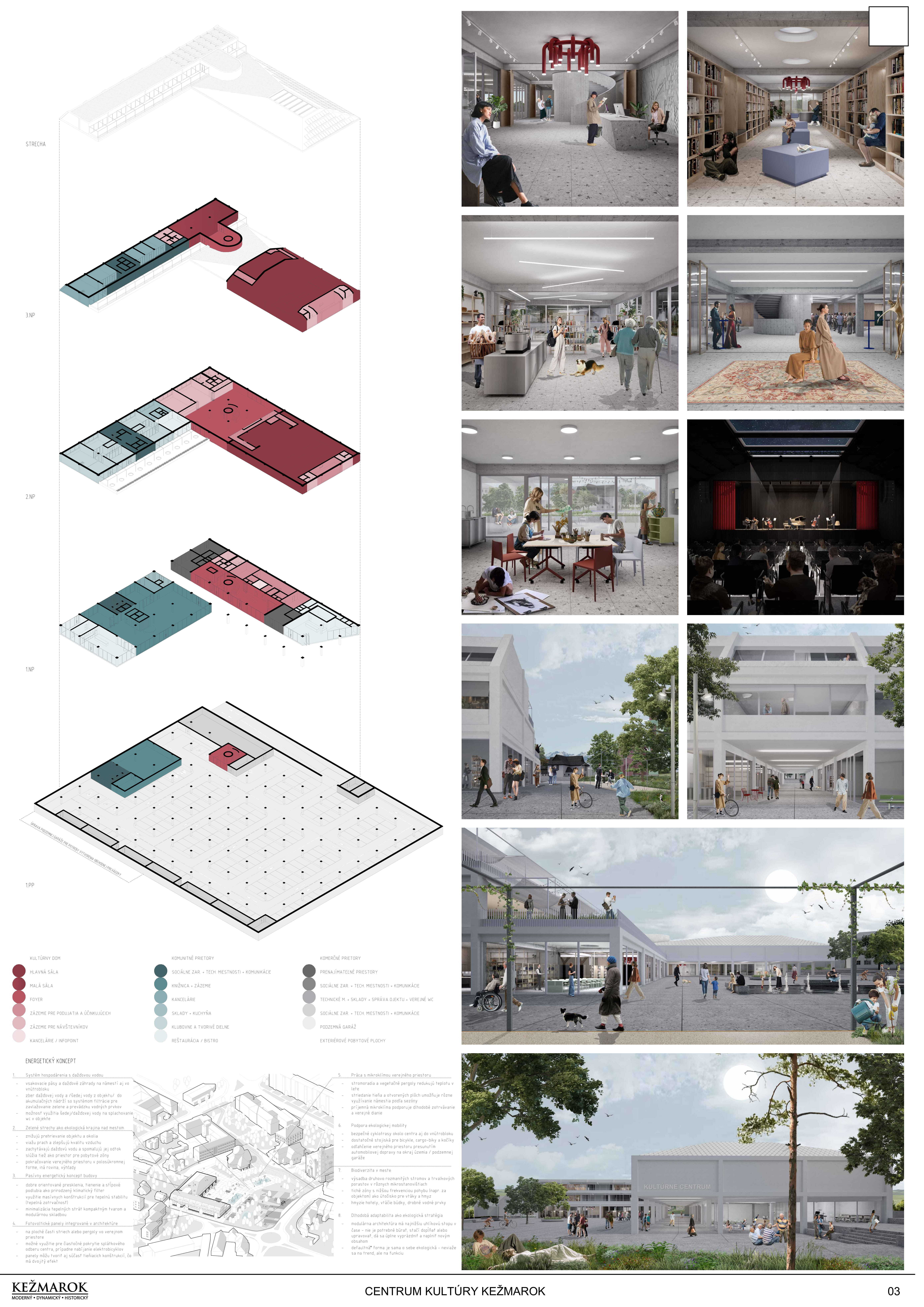 Z architektonického hľadiska ide o rafinované a neokázalé dielo s mnohými skrytými kvalitami. Silný súdobý, miestami až fascinujúci výraz objemu je vyvážený značnou mierou pokory a znakovou symbolikou, ktorá umne reinterpretuje tradičné formy. Veľkorysý podiel exteriérovej pergoly plynule prepája vnútorné a vonkajšie priestory. Prevádzková schéma je čitateľná: veľká sála, malá sála, knižnica a foyer sú integrované do kontinuálnej sekvencie verejných priestorov a doplnkové funkcie sú logicky situované aj do adaptovanej časti pôvodného internátu. Dispozičné riešenie racionalizuje priestorové nároky na kultúrne funkcie, čo sa prejavilo v menšej podlahovej ploche hlavnej sály v porovnaní s ostatnými návrhmi. Istá miera zoštíhlenia vybraných priestorov však nie je na úkor celkovej kvality a odporúčanej kapacity. Naopak, potvrdzuje úvahu, že priestorovo flexibilnejšie kapacity sú pre potreby Kežmarku vo výsledku udržateľnejšie a adekvátnejšie. Samotný priestor hlavnej sály však bude ešte vyžadovať doriešenie optimálnej krivky viditeľnosti a akustiky. Problematická však zostáva väzba vnútorných funkcií na parter a bežné fungovanie mestského prostredia – priestory sál orientované do námestia tvoria pre exteriér neaktívne fasády a umiestnenie reštauračnej časti mimo hlavného ťažiskového priestoru oslabuje inak sľubný potenciál pre oživenie agory.