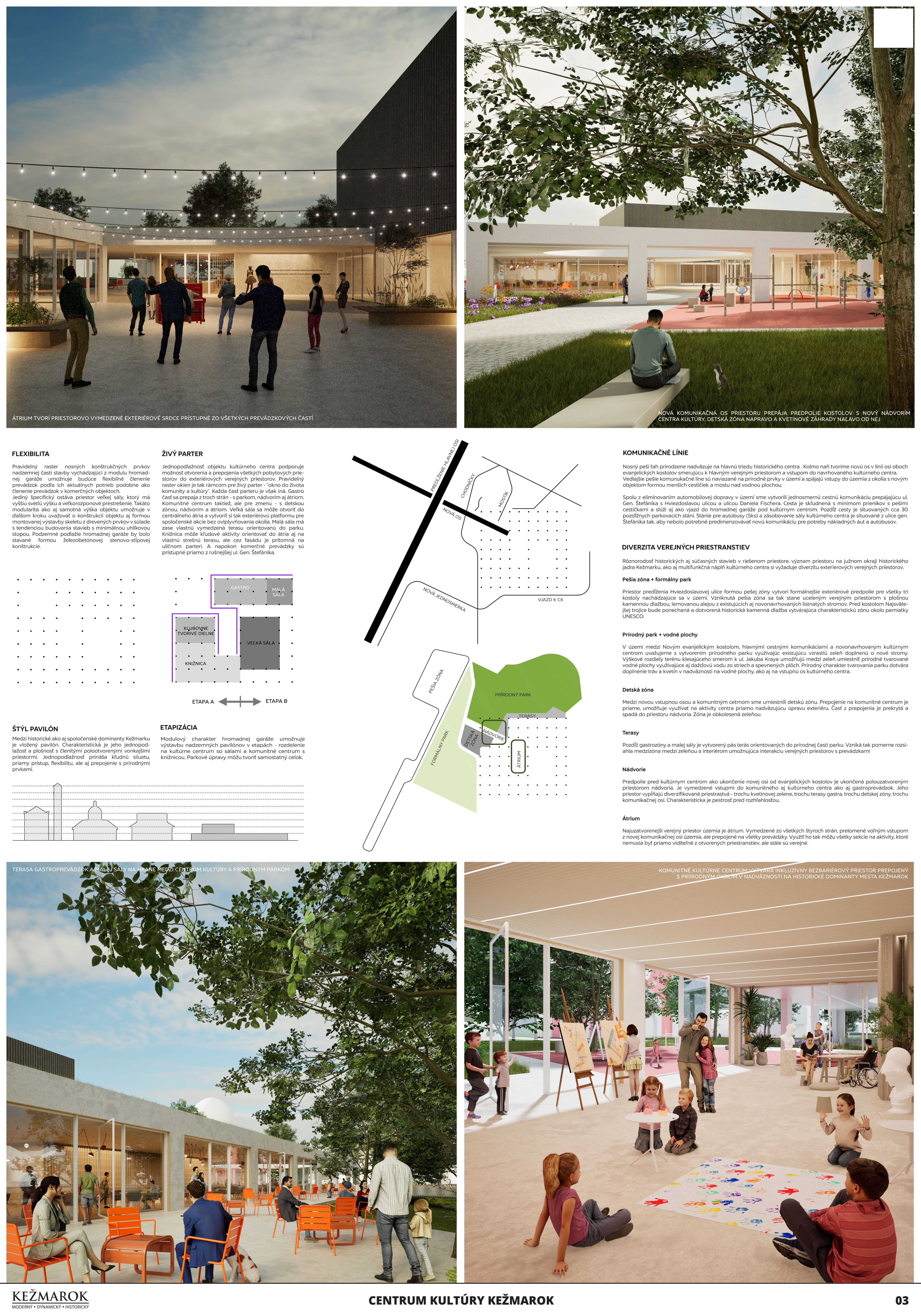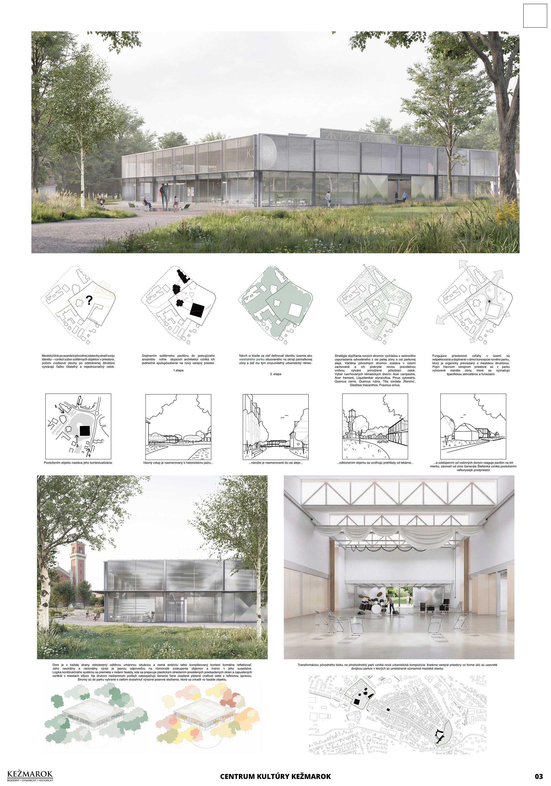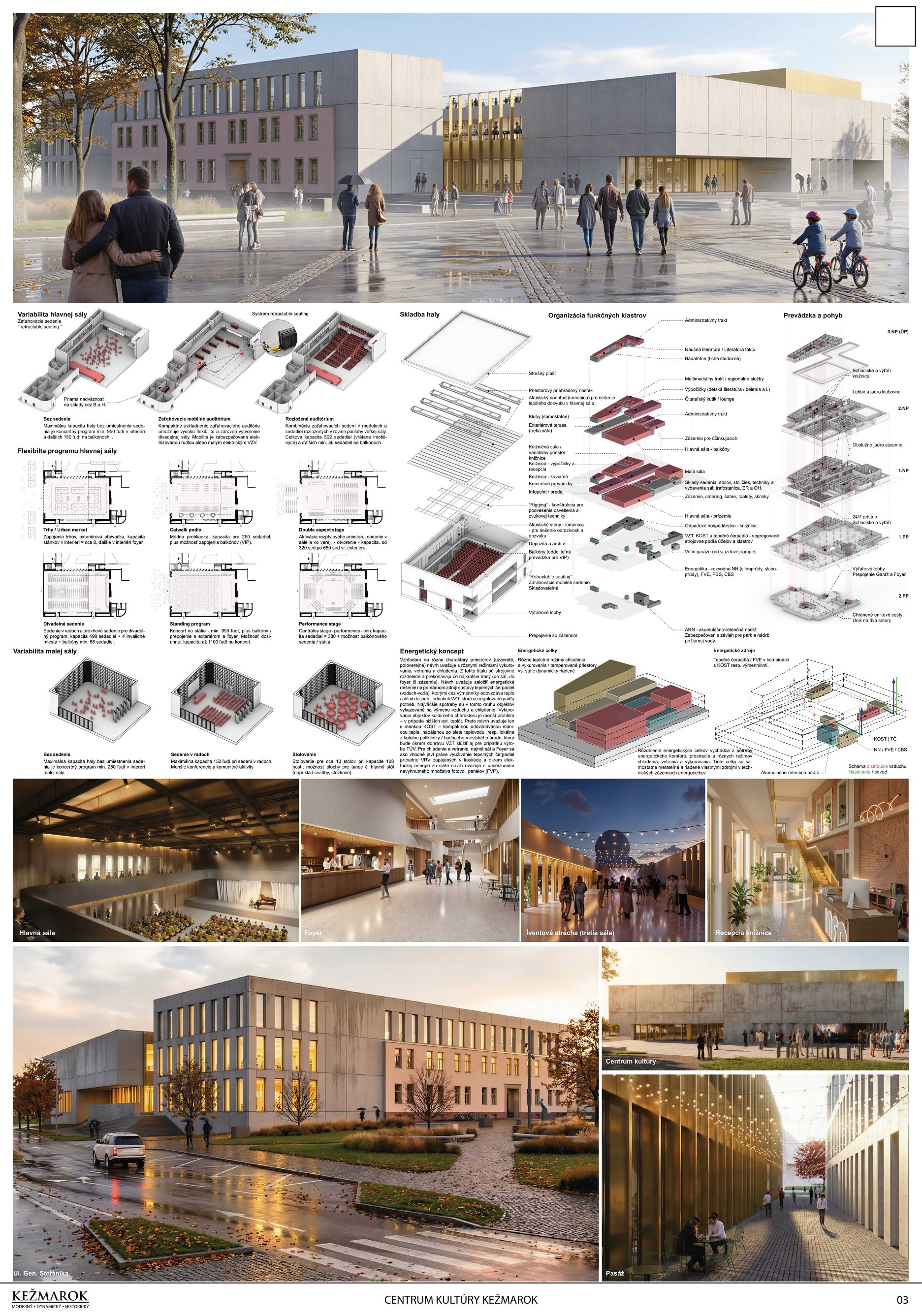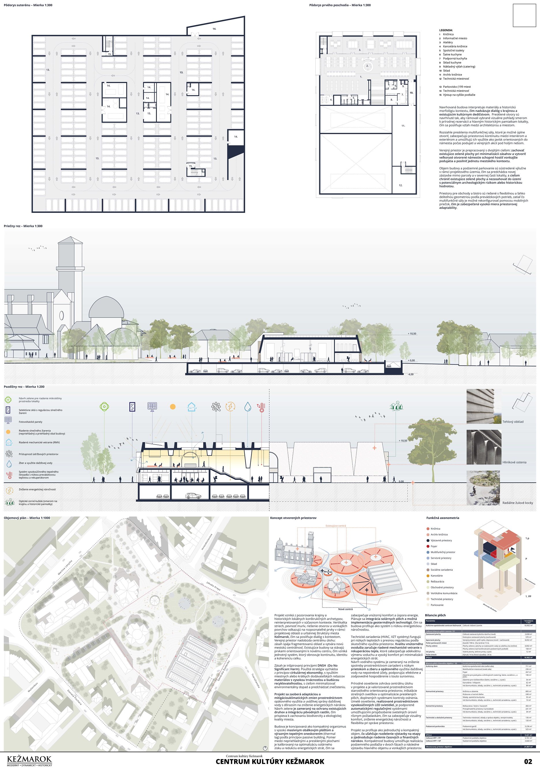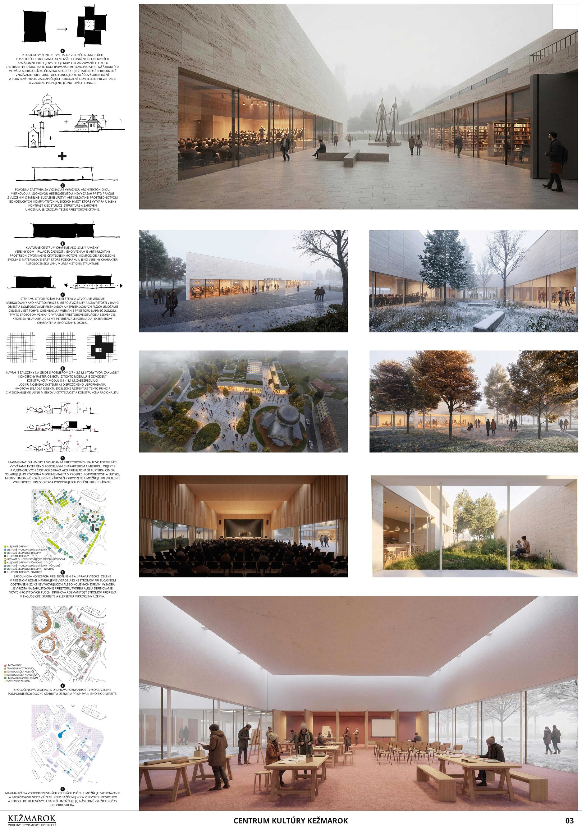 Z architektonického hľadiska ide o rafinované a neokázalé dielo s mnohými skrytými kvalitami. Silný súdobý, miestami až fascinujúci výraz objemu je vyvážený značnou mierou pokory a znakovou symbolikou, ktorá umne reinterpretuje tradičné formy. Veľkorysý podiel exteriérovej pergoly plynule prepája vnútorné a vonkajšie priestory. Prevádzková schéma je čitateľná: veľká sála, malá sála, knižnica a foyer sú integrované do kontinuálnej sekvencie verejných priestorov a doplnkové funkcie sú logicky situované aj do adaptovanej časti pôvodného internátu. Dispozičné riešenie racionalizuje priestorové nároky na kultúrne funkcie, čo sa prejavilo v menšej podlahovej ploche hlavnej sály v porovnaní s ostatnými návrhmi. Istá miera zoštíhlenia vybraných priestorov však nie je na úkor celkovej kvality a odporúčanej kapacity. Naopak, potvrdzuje úvahu, že priestorovo flexibilnejšie kapacity sú pre potreby Kežmarku vo výsledku udržateľnejšie a adekvátnejšie. Samotný priestor hlavnej sály však bude ešte vyžadovať doriešenie optimálnej krivky viditeľnosti a akustiky. Problematická však zostáva väzba vnútorných funkcií na parter a bežné fungovanie mestského prostredia – priestory sál orientované do námestia tvoria pre exteriér neaktívne fasády a umiestnenie reštauračnej časti mimo hlavného ťažiskového priestoru oslabuje inak sľubný potenciál pre oživenie agory.