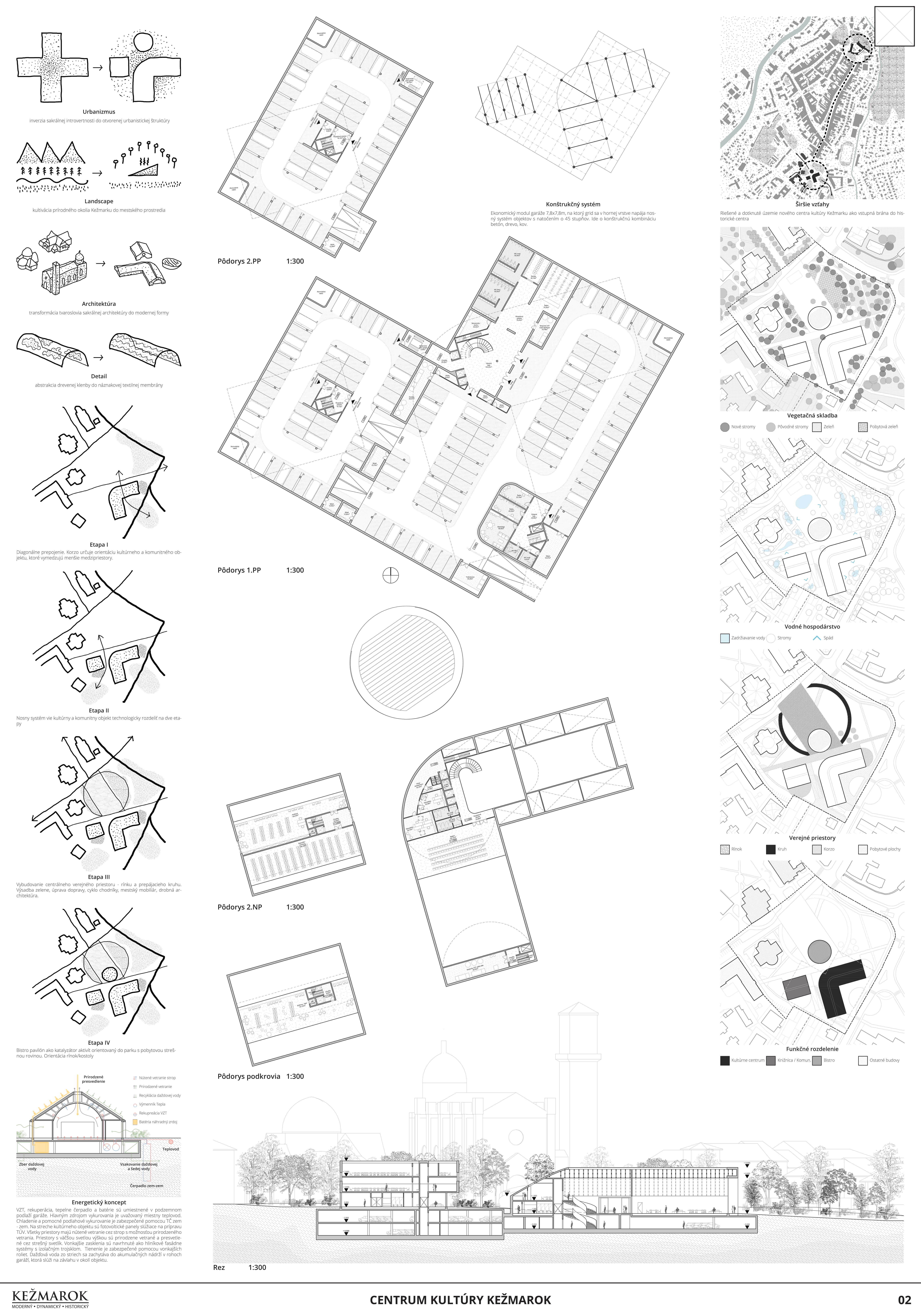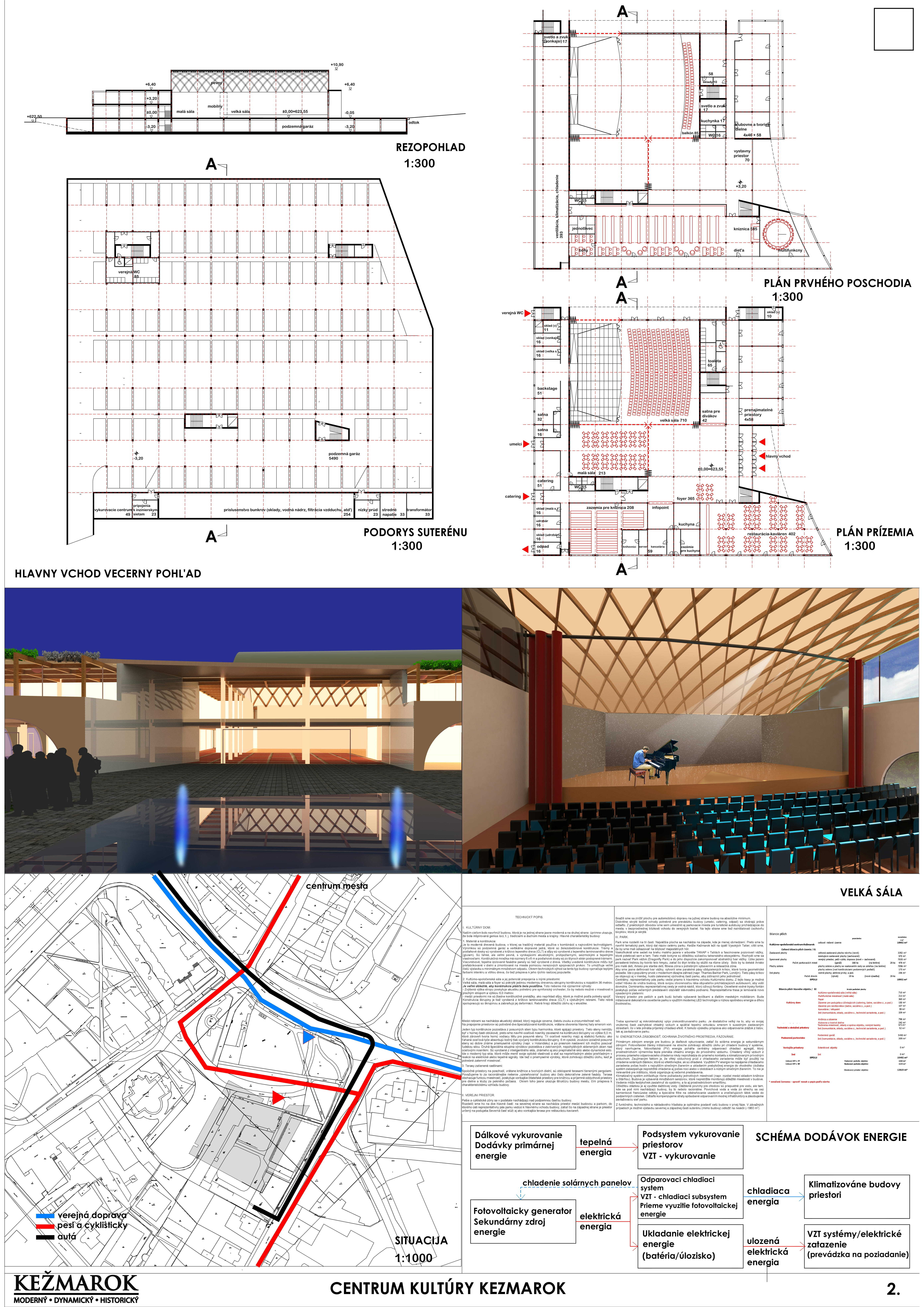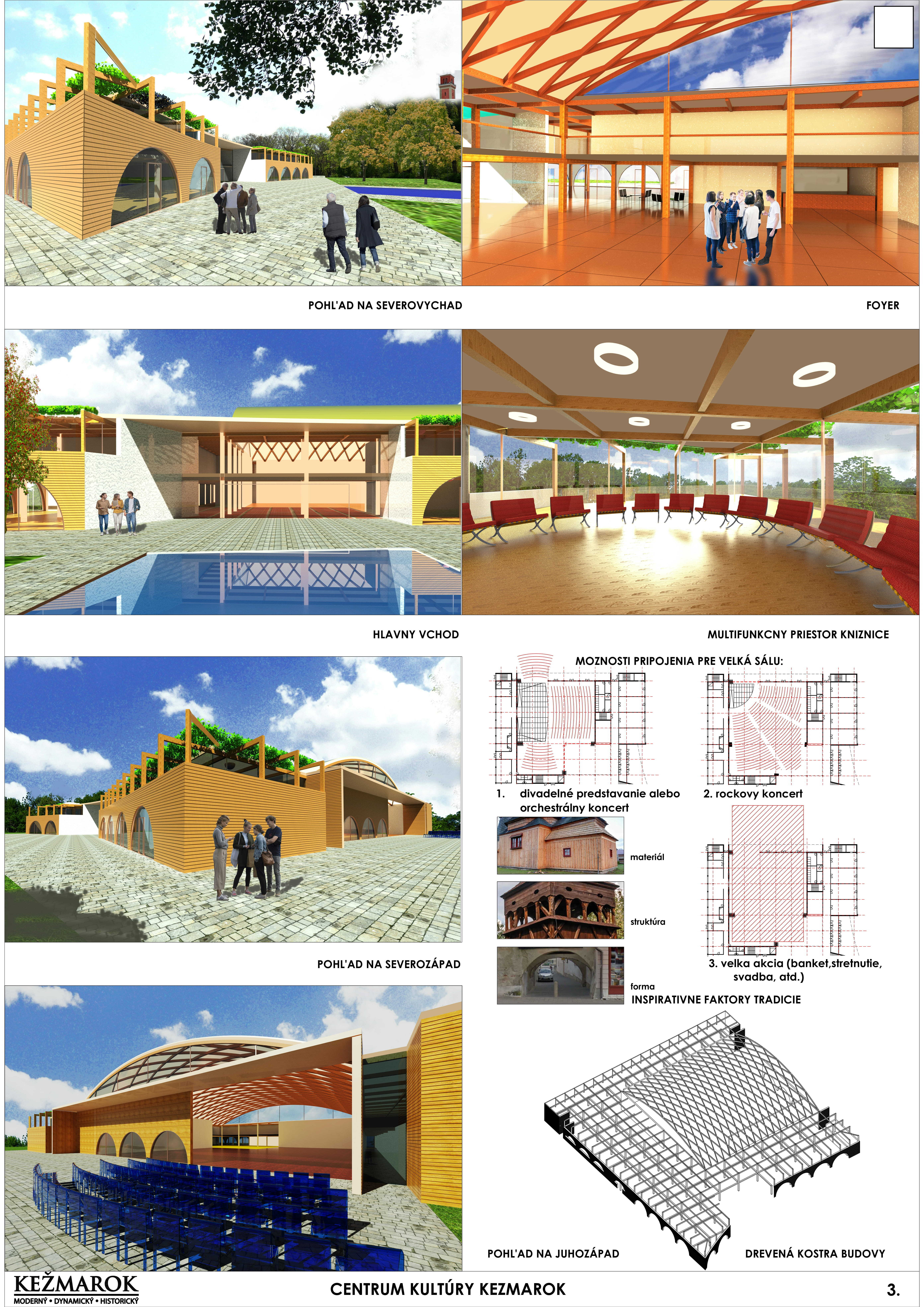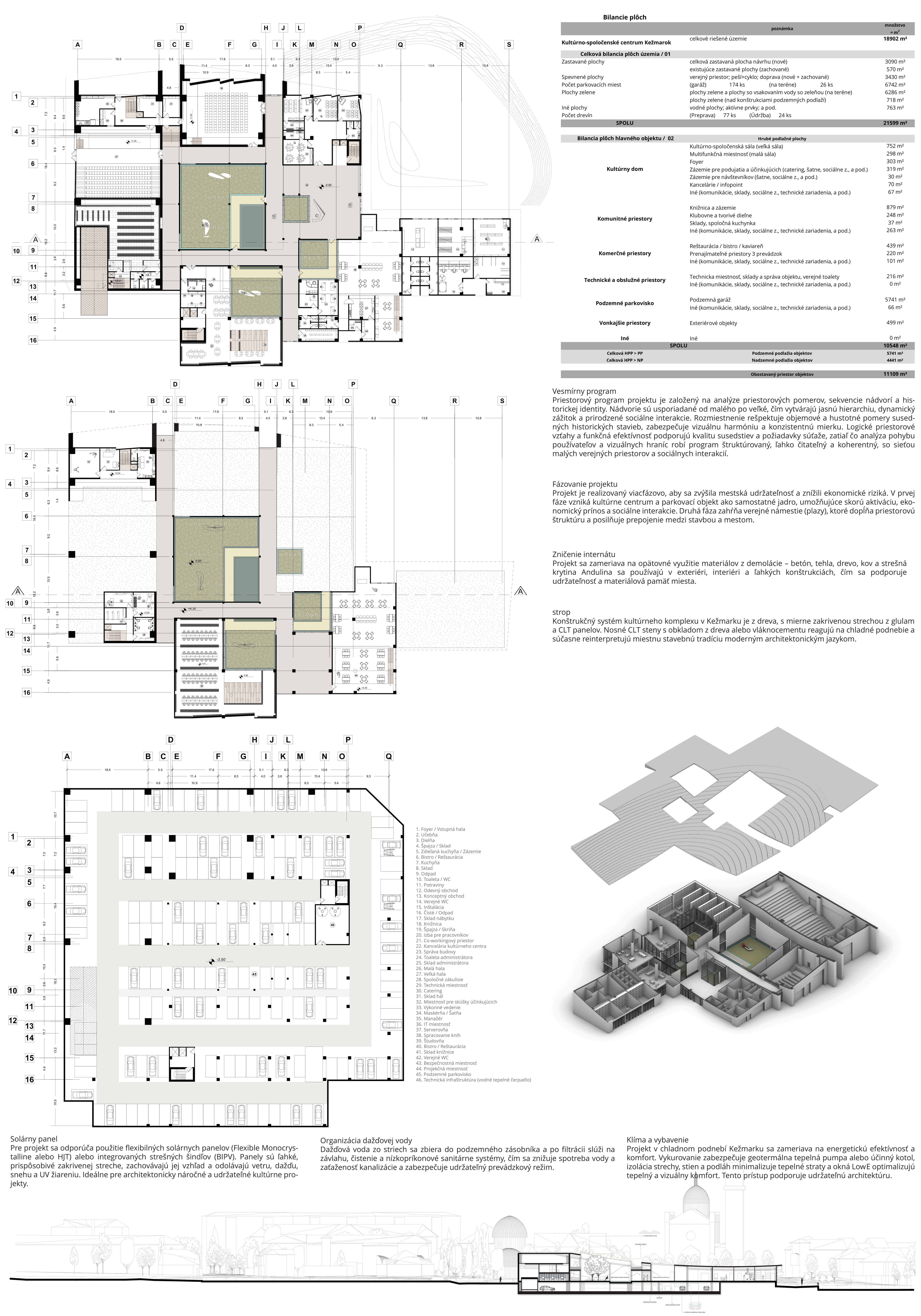 Z architektonického hľadiska ide o rafinované a neokázalé dielo s mnohými skrytými kvalitami. Silný súdobý, miestami až fascinujúci výraz objemu je vyvážený značnou mierou pokory a znakovou symbolikou, ktorá umne reinterpretuje tradičné formy. Veľkorysý podiel exteriérovej pergoly plynule prepája vnútorné a vonkajšie priestory. Prevádzková schéma je čitateľná: veľká sála, malá sála, knižnica a foyer sú integrované do kontinuálnej sekvencie verejných priestorov a doplnkové funkcie sú logicky situované aj do adaptovanej časti pôvodného internátu. Dispozičné riešenie racionalizuje priestorové nároky na kultúrne funkcie, čo sa prejavilo v menšej podlahovej ploche hlavnej sály v porovnaní s ostatnými návrhmi. Istá miera zoštíhlenia vybraných priestorov však nie je na úkor celkovej kvality a odporúčanej kapacity. Naopak, potvrdzuje úvahu, že priestorovo flexibilnejšie kapacity sú pre potreby Kežmarku vo výsledku udržateľnejšie a adekvátnejšie. Samotný priestor hlavnej sály však bude ešte vyžadovať doriešenie optimálnej krivky viditeľnosti a akustiky. Problematická však zostáva väzba vnútorných funkcií na parter a bežné fungovanie mestského prostredia – priestory sál orientované do námestia tvoria pre exteriér neaktívne fasády a umiestnenie reštauračnej časti mimo hlavného ťažiskového priestoru oslabuje inak sľubný potenciál pre oživenie agory.