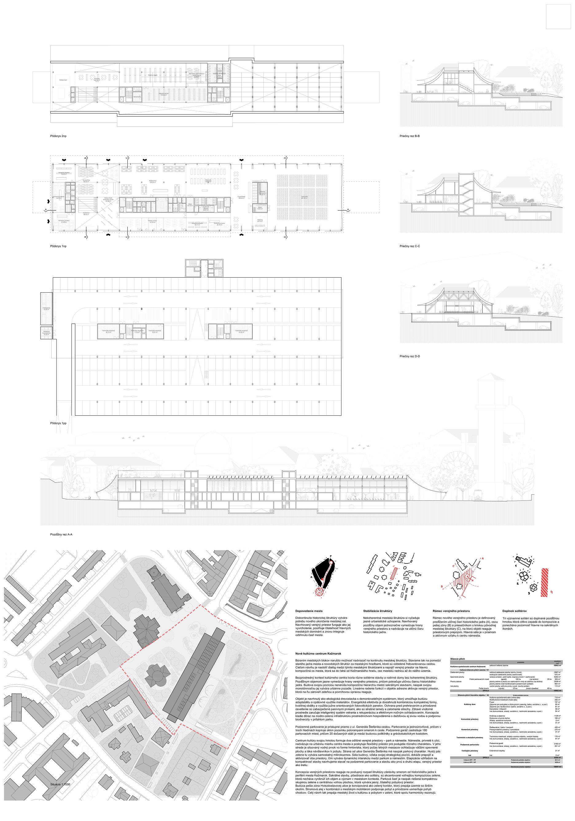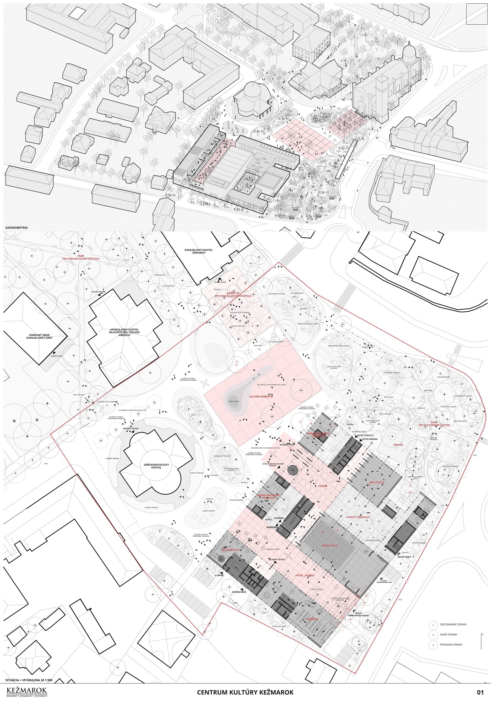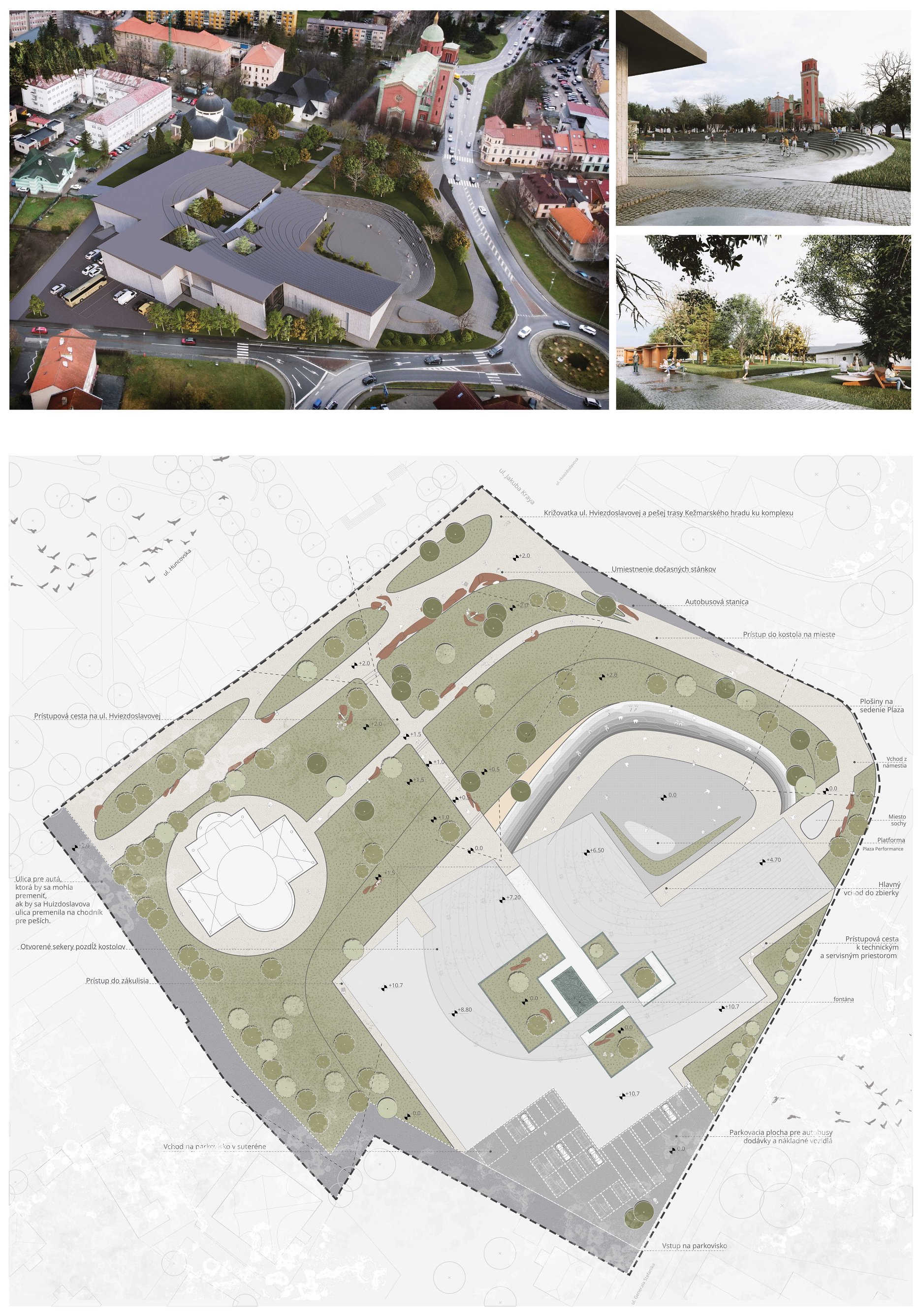 Víťazný návrh prináša do zložitého kontextu jasné a silné urbanistické gesto v podobe elementárnej lineárnej hmoty, ktorá definuje celkom nové ťažisko územia. Toto riešenie, koncipované v predĺžení osi Hviezdoslavovej ulice, vytvára mestskú agoru a definuje čitateľný rámec pre dvojicu existujúcich historických chrámov. Návrh si odvážne, no odôvodnene, dovolil vstúpiť aj do zón mimo odporúčaného stavebného obvodu. Nevytvára však nadrozmerný objem, preukazuje citlivosť voči okolitej zástavbe a vytvára architektonický výraz adekvátny pre danú typológiu kultúrnej a spoločenskej funkcie. Urbanistická línia má však aj svoje úskalia – do dominantnej polohy stavia gréckokatolícky chrám, čím kompozične čiastočne potláča vnímanie artikulárneho kostola. Hoci si návrh zvolil tému zachovania existujúcej substancie objektu internátu, dlhá línia novej hmoty do istej miery nabúrava logiku priečnej priepustnosti územia. Táto otázka je riešiteľná korekciou mierky predpolia a kompozíciou hrán námestia. Porota tiež vníma zásah do archeologicky citlivého územia, avšak pozitívne hodnotí, že návrh v miestach potenciálnych nálezov nerealizuje invazívnu spodnú stavbu. Prípadné zvýšené náklady na archeologický výskum sú tak vyvážené efektivitou menších nadzemných objemov. Utilitárne riešenie statickej dopravy túto efektivitu aj napriek svojej dvojpodlažnosti podporuje.