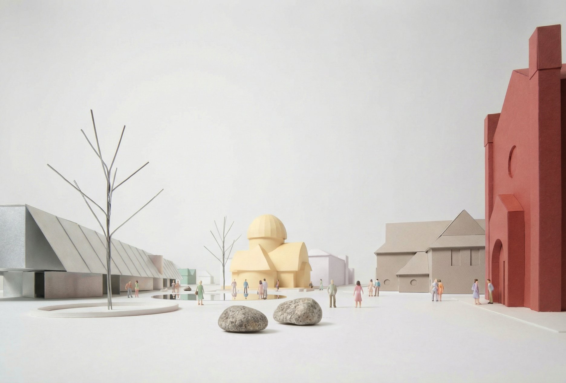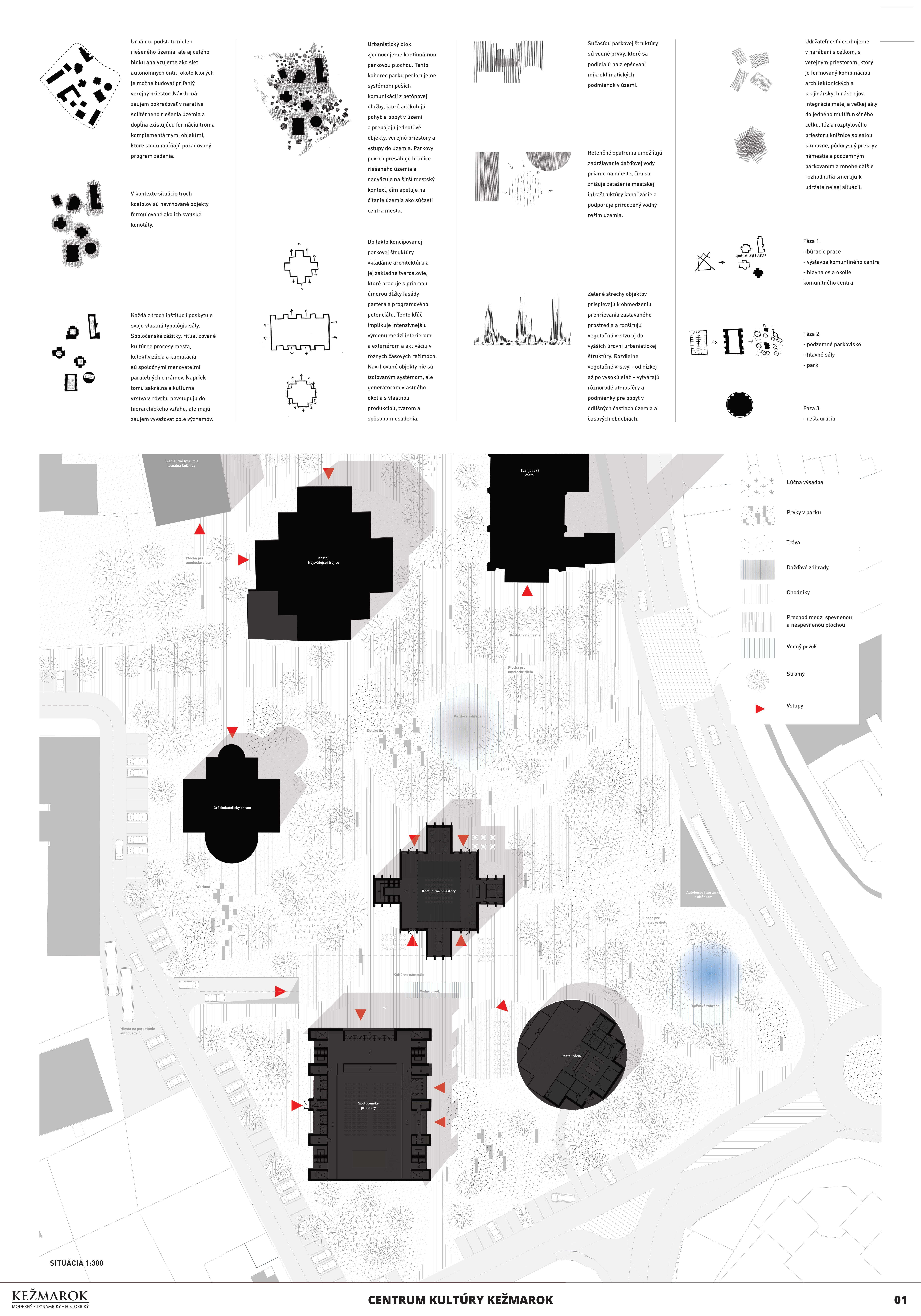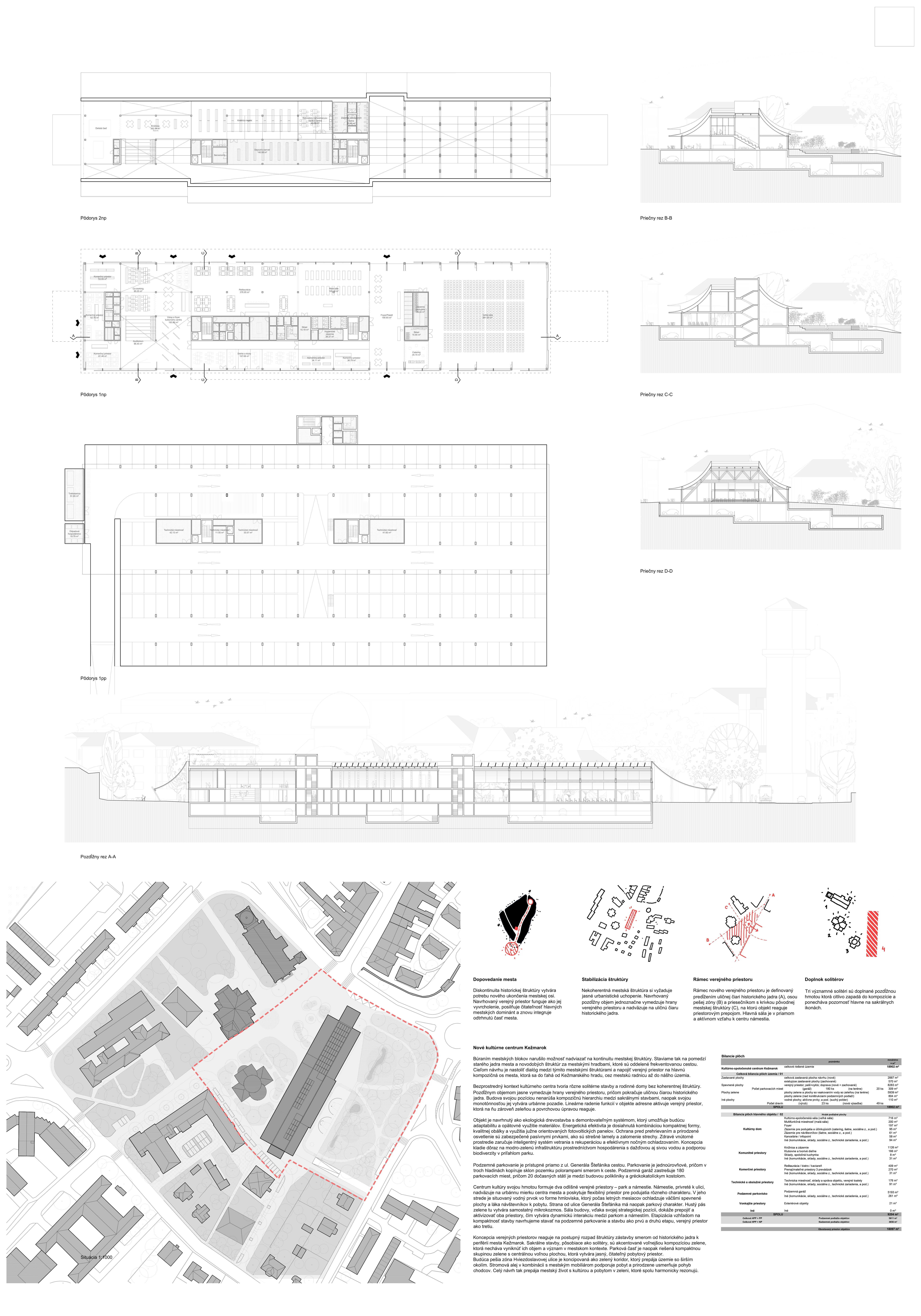 Víťazný návrh prináša do zložitého kontextu jasné a silné urbanistické gesto v podobe elementárnej lineárnej hmoty, ktorá definuje celkom nové ťažisko územia. Toto riešenie, koncipované v predĺžení osi Hviezdoslavovej ulice, vytvára mestskú agoru a definuje čitateľný rámec pre dvojicu existujúcich historických chrámov. Návrh si odvážne, no odôvodnene, dovolil vstúpiť aj do zón mimo odporúčaného stavebného obvodu. Nevytvára však nadrozmerný objem, preukazuje citlivosť voči okolitej zástavbe a vytvára architektonický výraz adekvátny pre danú typológiu kultúrnej a spoločenskej funkcie. Urbanistická línia má však aj svoje úskalia – do dominantnej polohy stavia gréckokatolícky chrám, čím kompozične čiastočne potláča vnímanie artikulárneho kostola. Hoci si návrh zvolil tému zachovania existujúcej substancie objektu internátu, dlhá línia novej hmoty do istej miery nabúrava logiku priečnej priepustnosti územia. Táto otázka je riešiteľná korekciou mierky predpolia a kompozíciou hrán námestia. Porota tiež vníma zásah do archeologicky citlivého územia, avšak pozitívne hodnotí, že návrh v miestach potenciálnych nálezov nerealizuje invazívnu spodnú stavbu. Prípadné zvýšené náklady na archeologický výskum sú tak vyvážené efektivitou menších nadzemných objemov. Utilitárne riešenie statickej dopravy túto efektivitu aj napriek svojej dvojpodlažnosti podporuje.