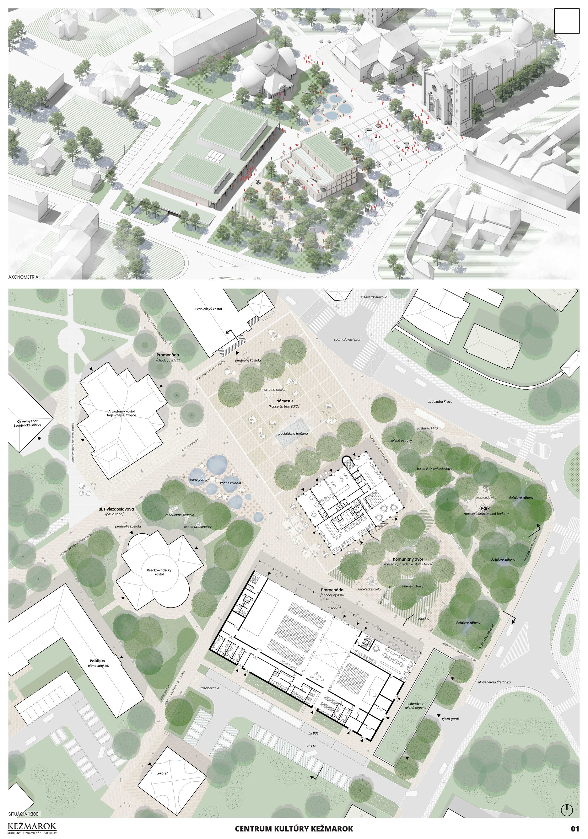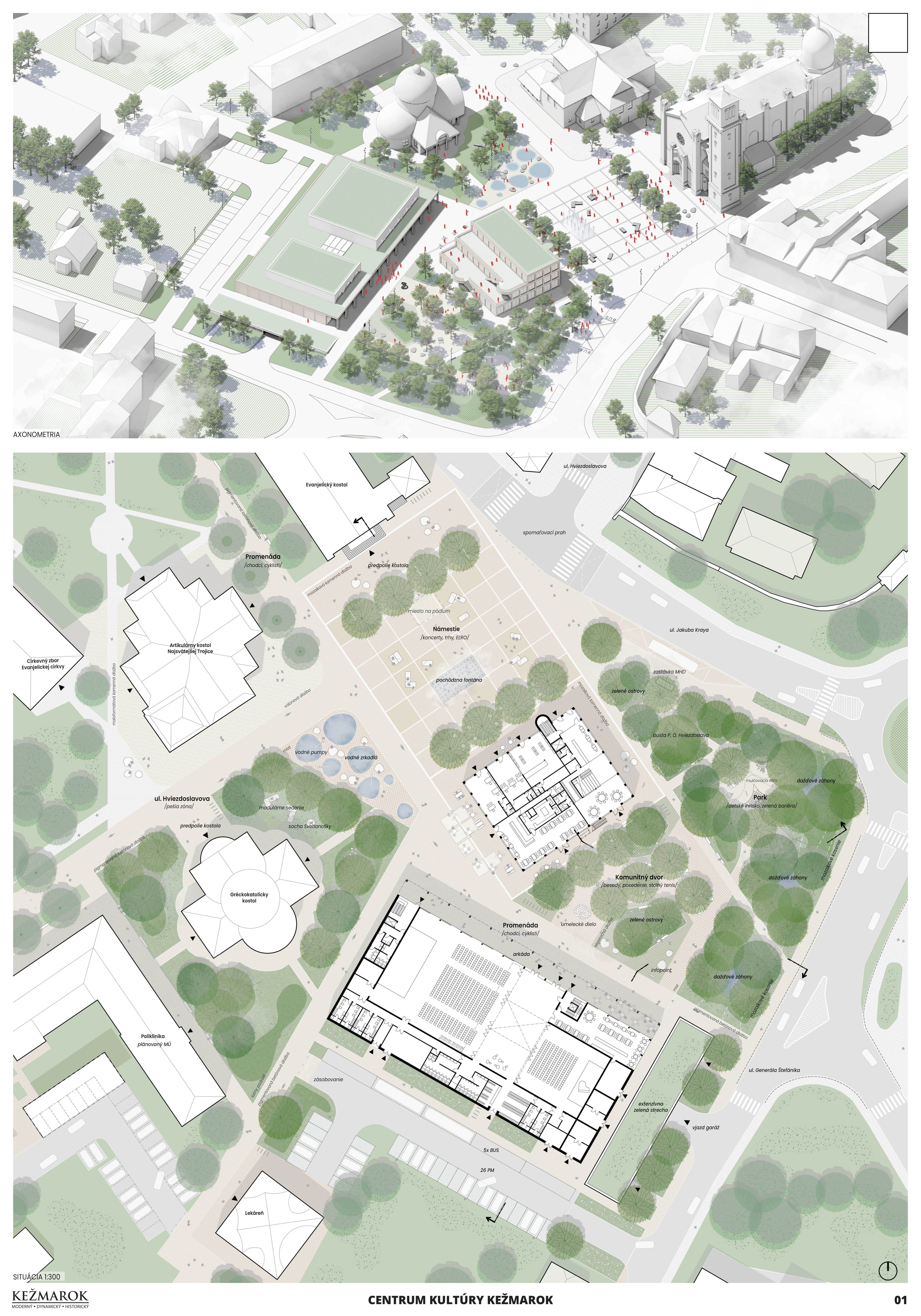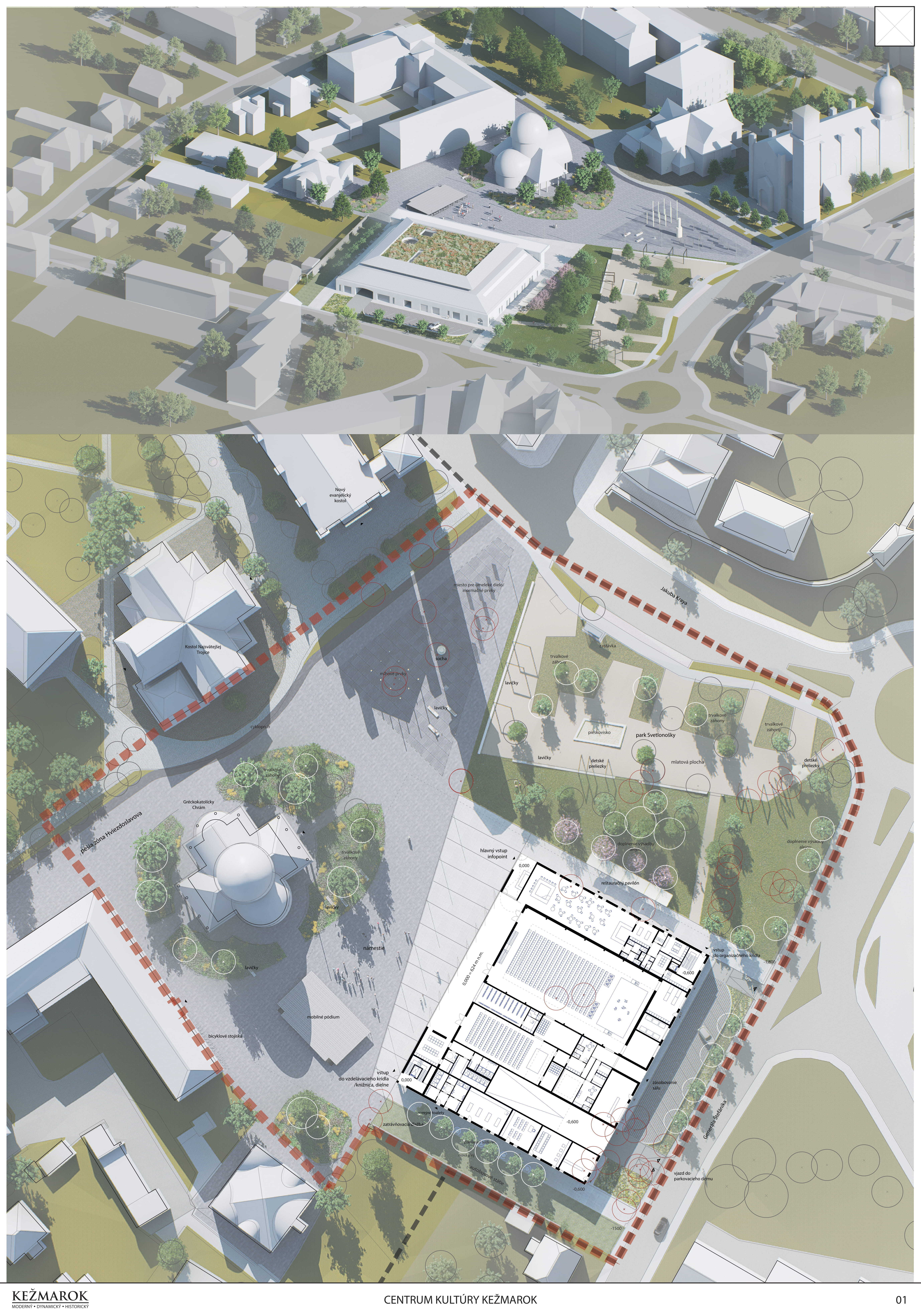 Súťažný návrh predstavuje kultivovaný mestotvorný koncept, ktorý sa vyznačuje čitateľnou mierkou a vecným zapojením do lokálneho kontextu. Porota oceňuje vytvorenie ústredného verejného priestoru s premyslenou priestorovou gradáciou, logickým navádzaním návštevníkov prostredníctvom stromoradia a definovaním veľkorysých rozptylových plôch pred jednotlivými vstupmi. Priestorová koncepcia je systematicky orientovaná k historickým chrámom, pričom nová hmota ambiciózne a primerane dotvára priestorové pozadie pre gréckokatolícky kostol. Pozitívne je hodnotené prevádzkové uchopenie parteru, priestorovo obohacujúci motív mestskej lodžie kultúrneho centra, ako aj vytvorenie jasne definovaných mikropriestorov rôznych kvalít. Prínosom je taktiež uvážlivé odklonenie statickej dopravy a zásobovania na okraj riešeného územia, vďaka čomu sa automobilová prevádzka nezaťahuje do ťažiskového verejného priestoru.