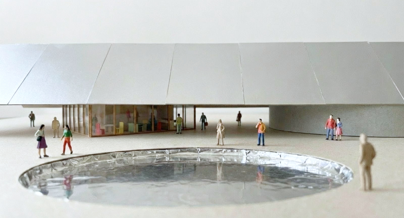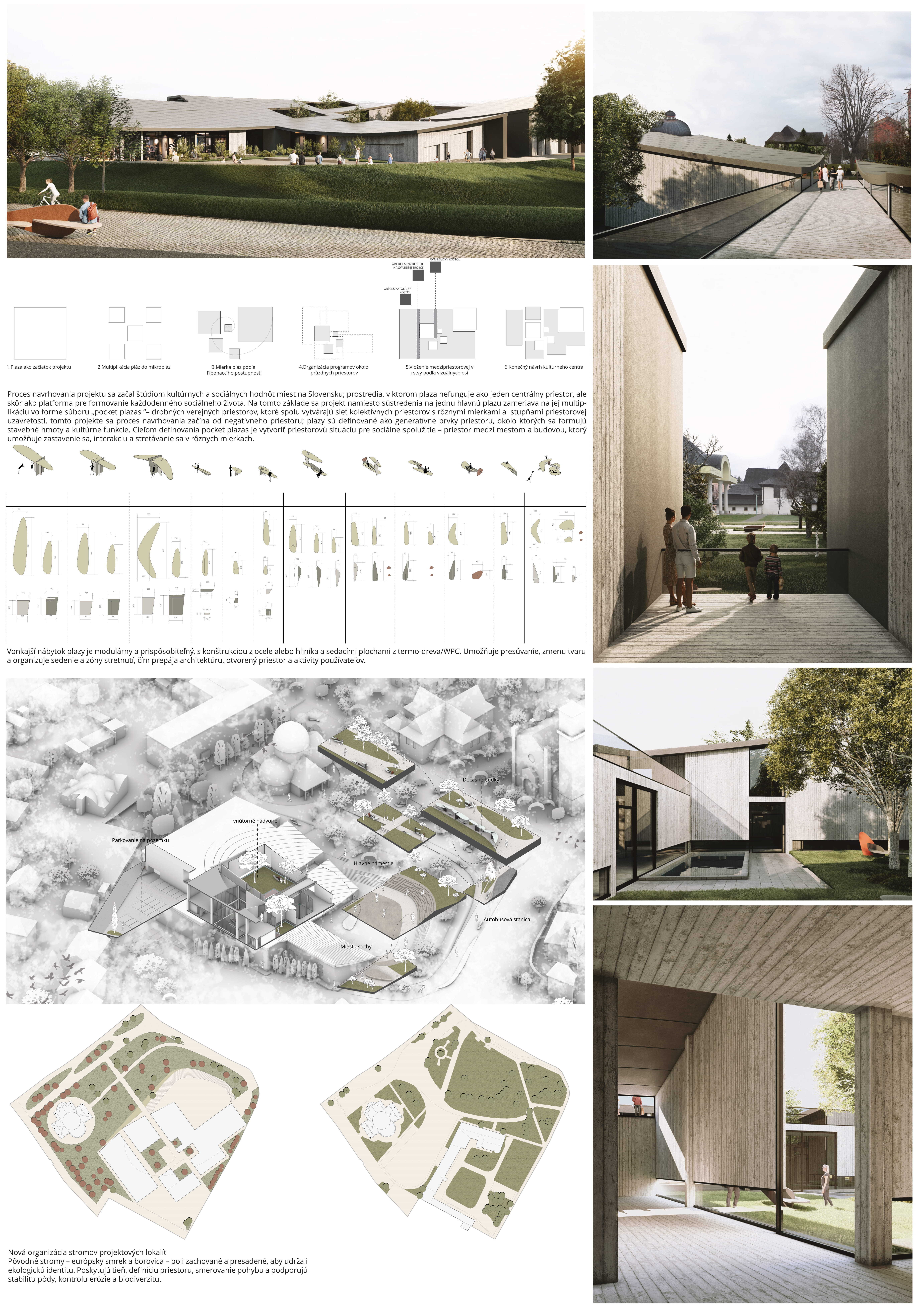 Koncept je založený na prísnom a jednoznačnom uvažovaní v podobe kompaktného monobloku – solitérneho pavilónu osadeného v zeleni. Hmota objektu je v území pomerne subtílna a svojím natočením inteligentne a citlivo reaguje na geometriu okolitej zástavby. Veľkým pozitívom je, že objekt prostredníctvom otvorených nároží komunikuje s okolím a ako jeden z mála návrhov vytvára plynulé pešie prepojenia do všetkých smerov. Zvoleným prístupom asanácie pôvodného internátu návrh zlučuje všetky funkcie do jedinej novej hmoty. Tým síce uvoľňuje pozemok, no svojou prevádzkou nevytvára pasáže a priechody v území, čím sa potenciál urbanistického vrstvenia vnútrobloku oslabuje. Absencia jasne definovanej hlavnej a zadnej fasády objektu, resp. jeho omni-orientácia síce maximalizuje prepojenie s okolím, avšak v kontexte historického prostredia a typológie významnej kultúrnej inštitúcie môže toto zrovnoprávnenie všetkých strán pôsobiť architektonicky aj prevádzkovo nejednoznačne.
