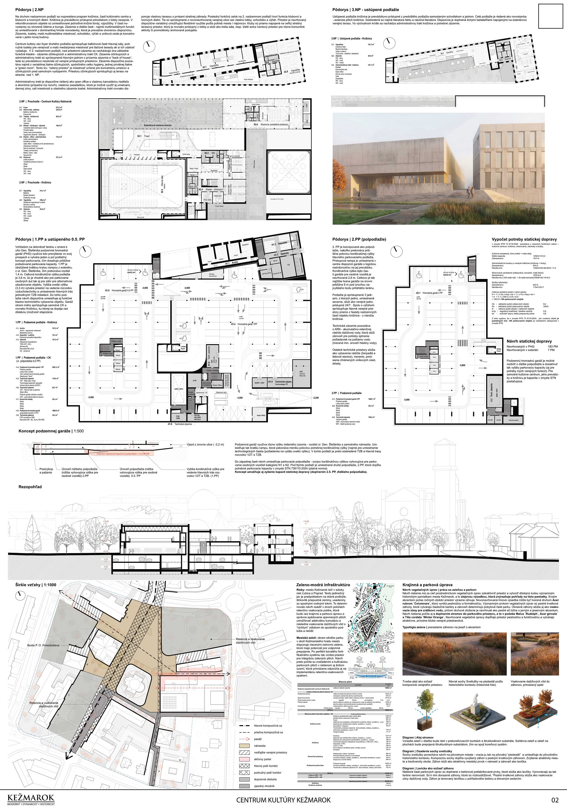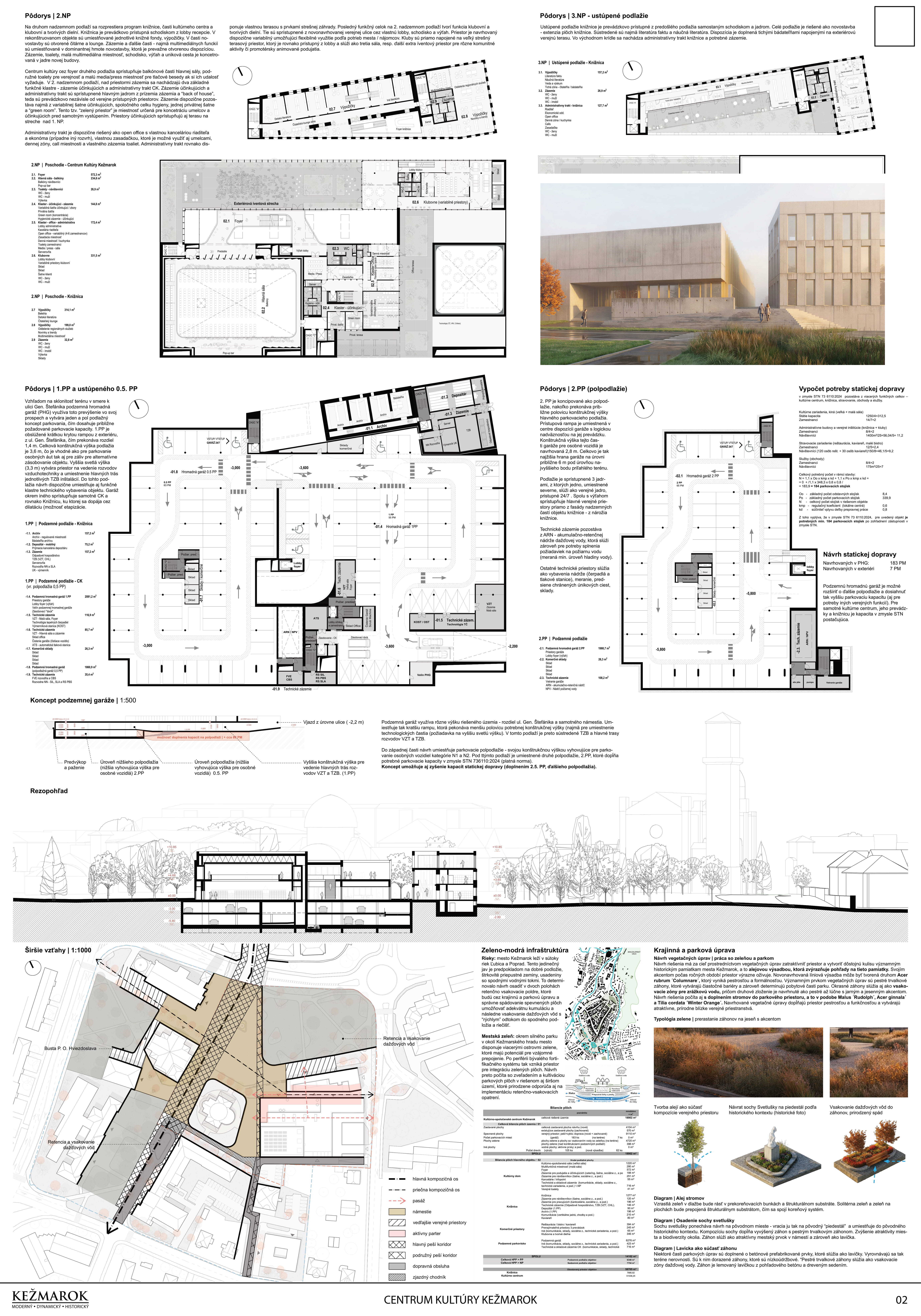 Za hodnotné porota považovala aj snahu šetriť nadzemné objemy kapacitným „zanorením“ a prácu s modro-zelenou infraštruktúrou. Prevádzkovo však návrh dopláca na absenciu jasnej priestorovej hierarchie – chýba zreteľnejšia orientácia hlavných vstupov a celková čitateľnosť dispozičnej logiky nie je jednoznačná. Problematické je najmä prevádzkové odčlenenie multifunkčnej sály od hlavnej sály do samostatného objektu. Návrh predpokladá dvojpodlažné podzemné parkovanie, avšak pri relatívne nízkej kapacite a bez dostatočne presvedčivého vyváženia medzi stavebnou náročnosťou a prínosom pre územie. Z pohľadu krajinnej architektúry aj Krajského pamiatkového úradu je verejný priestor neproporčne prehustený vzrastlou vegetáciou, pričom navrhované zatrávnenie plôch, tak ako je prezentované vo vizualizáciách, by bolo v intenzívnej mestskej prevádzke len ťažko udržateľné a funkčné. Zásadnou slabinou tohto inak architektonicky pútavého konceptu je fázovateľnosť: urbanistický a ideový zámer by pri prípadnom nerealizovaní ktoréhokoľvek zo solitérnych objektov prestal fungovať ako zmysluplný celok.