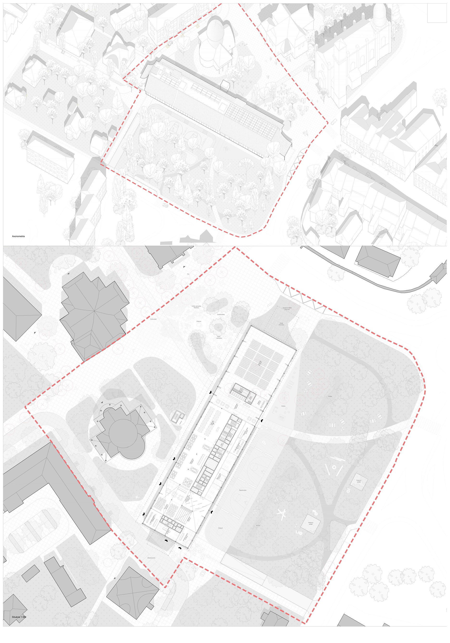 Súťažný návrh prináša do územia ideovo pútavý koncept založený na integrácii pôvodnej budovy internátu. Prínosom tohto riešenia je jasná čitateľnosť, celková jednoduchosť a dobre zrozumiteľný princíp dispozičného usporiadania. Návrh umne pracuje s plošnou priepustnosťou – umožňuje prístup do objektu z viacerých strán, pričom v nárožiach vytvára príjemné priestorové zákutia. Porota pozitívne vníma sformovanie vnútorného nádvoria, ktoré v tomto prípade neplní len formálnu funkciu, ale nesie v sebe hlbší komunitný a prevádzkový zmysel pre inštitúciu. Spôsob, akým je však do nového celku zapojený pôvodný objekt, vzbudzuje istú polemiku. Hoci ho návrh exteriérovo zachováva, v interiéri ho radikálne mení, čím sa oslabuje opodstatnenosť aj čitateľnosť tohto konzervačného gesta.