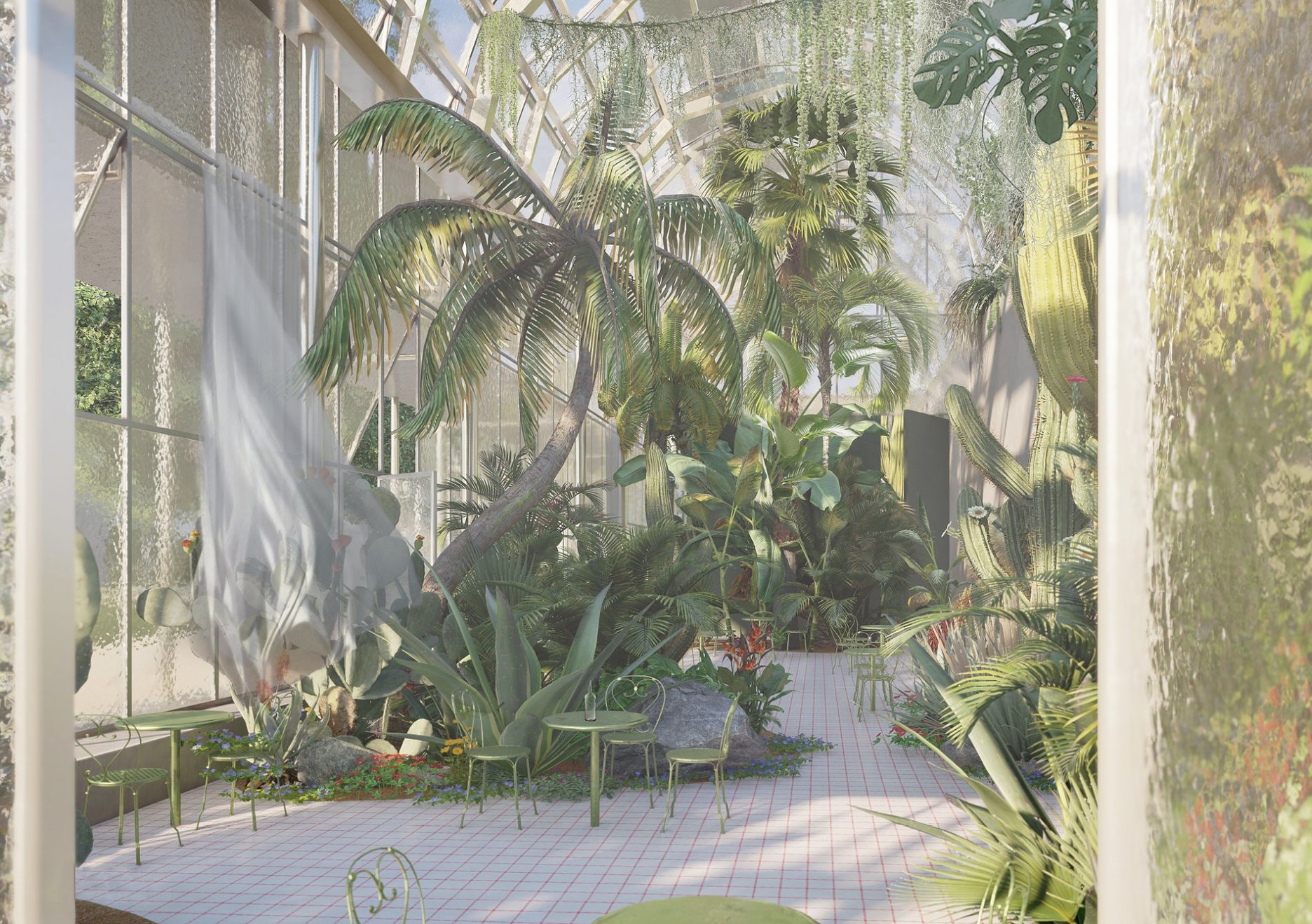 Návrh vychází z charakteru současného stavu bastionů severního opevnění Prahy. Solitérní stavby, ruiny zdí, parkové úpravy a blízký kontakt s hradem. Nároží vnímám jako možnost propojení světů. Překročení hranice. Brusnice je předpolím Lumbeho zahrad, klesajících k Jelenímu příkopu. Při dobré vůli lze ze Střešovic dojít na Malostranskou prakticky jen zahradami. Probořené ohbí hradeb může být novou brankou do starého srdce Prahy. Veřejný skleník protahuje osu Jelení ulice. Narovnání tramvajové trati dle původní kurtiny rozšiřuje louku otevírající se výhledu na katedrálu sv. Víta. Stříbrná kolonáda obepíná poloprůhledný objem stavby, sloužící jako zastřešené zázemí parku. Leptané sklo společně s rostlinami za obálkou vytváří živý obraz promítající se na stěny parku. Zahrada v zahradě.