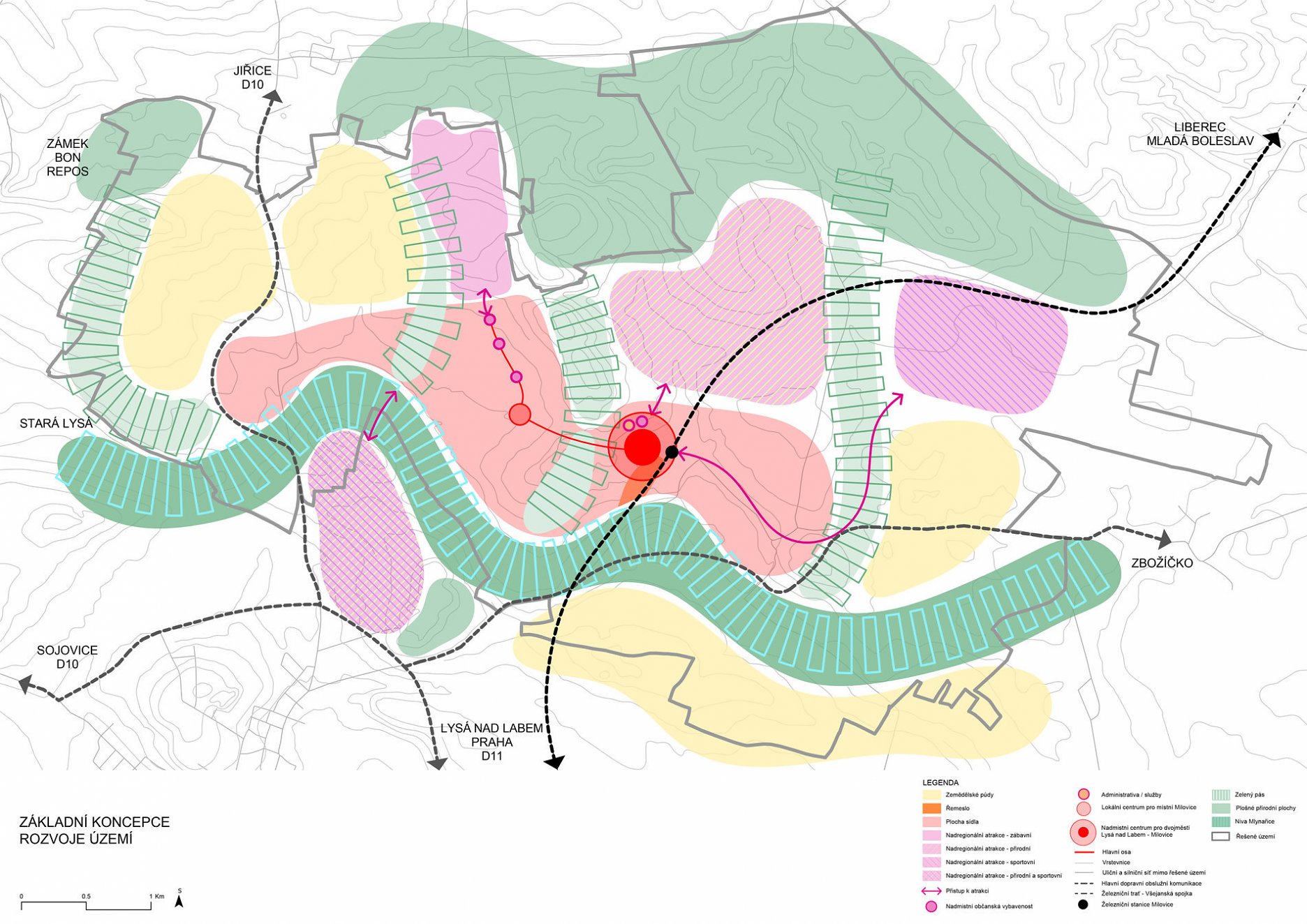 Projekt územního plánu Milovice vychází z urbanistického projektu letního semestru 2021. Projekt byl založen na vize vytvoření dvojměstí Milovice – Lysá nad Labem. Podrobně se zabýval pouze centrální částí města s největšími nedostatky v rozmezí mezi železniční stanicí a východním cípem Benátecké Vrutice. Návrh územního plánu pojímá celé území obce Milovic včetně oblasti Božího Daru. Územní plán umožňuje další rozvoj Milovic v rozvojových plochách. Dochází k doplnění ploch občanského vybavení, zapojení města do širší krajinné sítě a vytvoření souvislé kvalitní sítě veřejných prostranství s využitím stávajících kvalit území a jejich podporou.