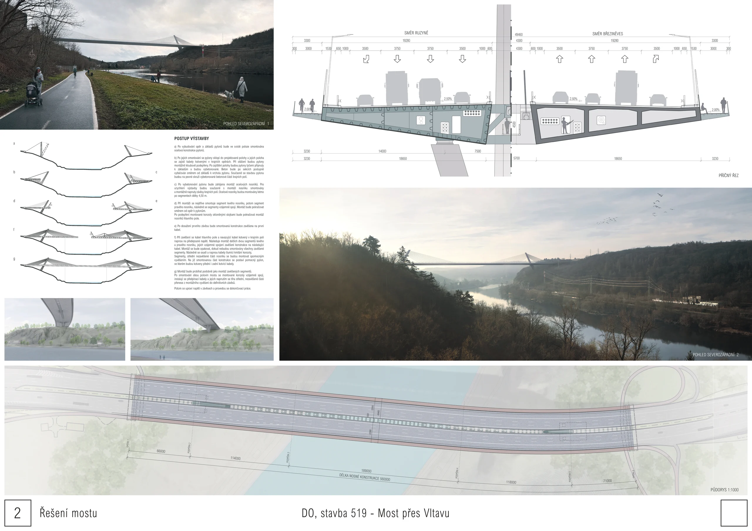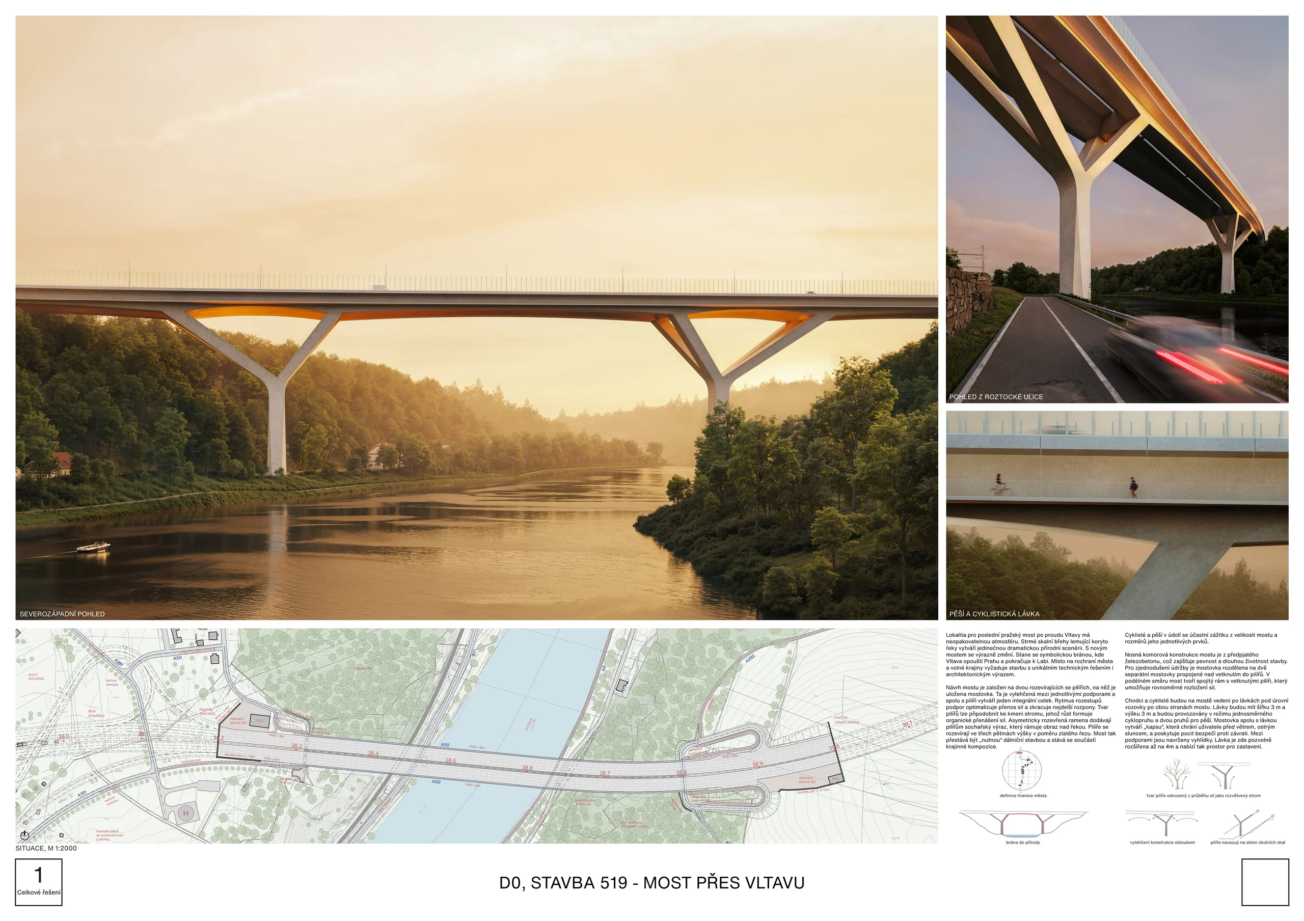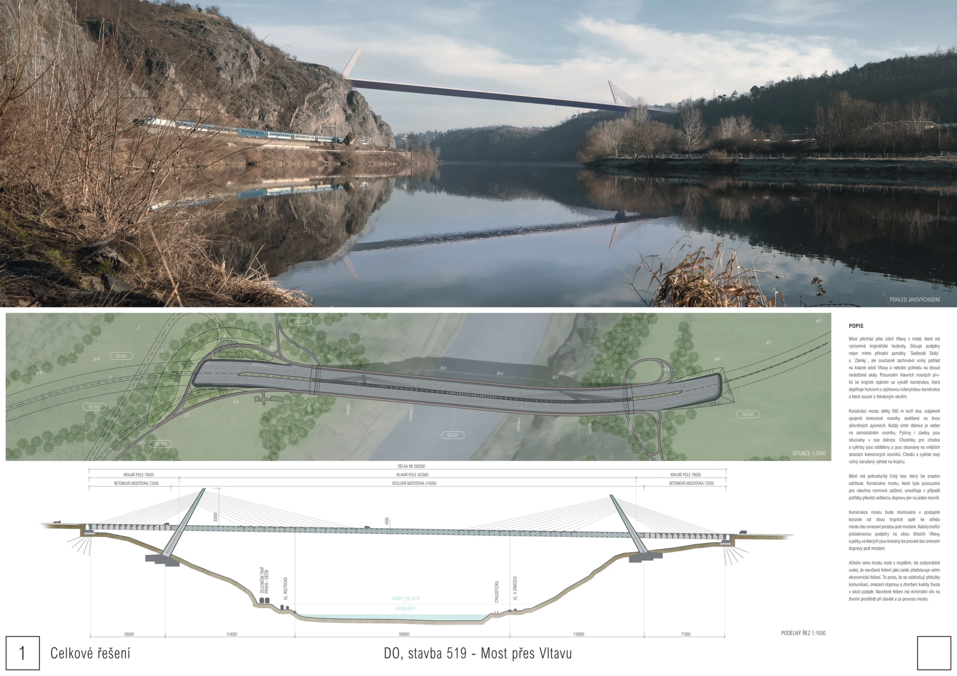 Soutěžní návrh ze všech nejlépe uspěl z hlediska hodnocení úrovně celkového architektonického a technického řešení mostu a celkového architektonického a dopravního řešení obou předmostí. Návrh má nejmenší stavební vliv na chráněná území, neboť jako jediný nevyžaduje budování masivních mostních pilířů na březích Vltavy. Návrh má nejmenší vliv na dotčený krajinný prostor v rámci krajinného rázu a celkově nejméně narušuje charakter krajinné scény Vltavského údolí tím, že minimalizuje vizuální zásah infrastrukturální stavby do hluboce zaříznutého údolí řeky a nekonkuruje tak fenoménu strmých svahů vltavského kaňonu.