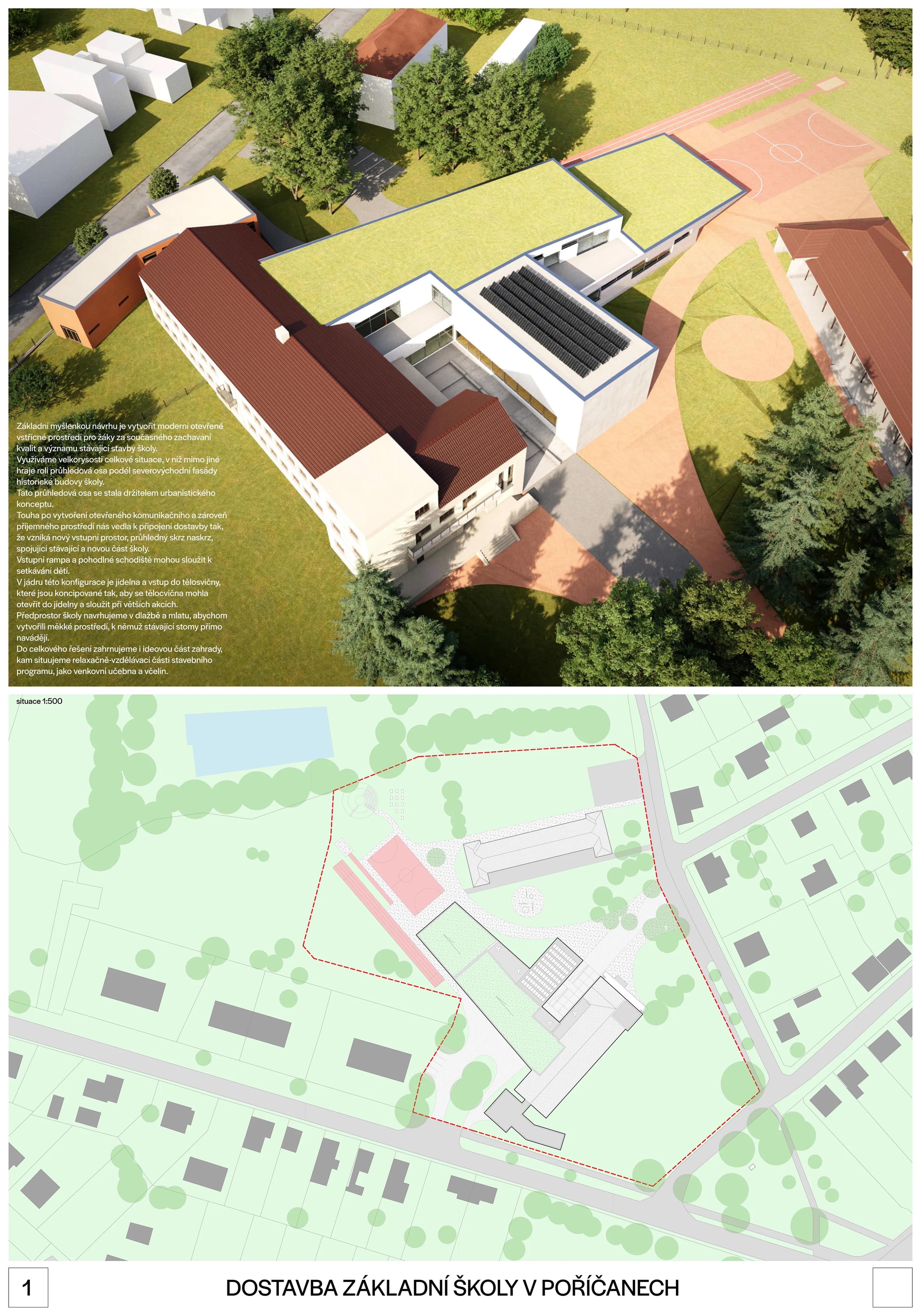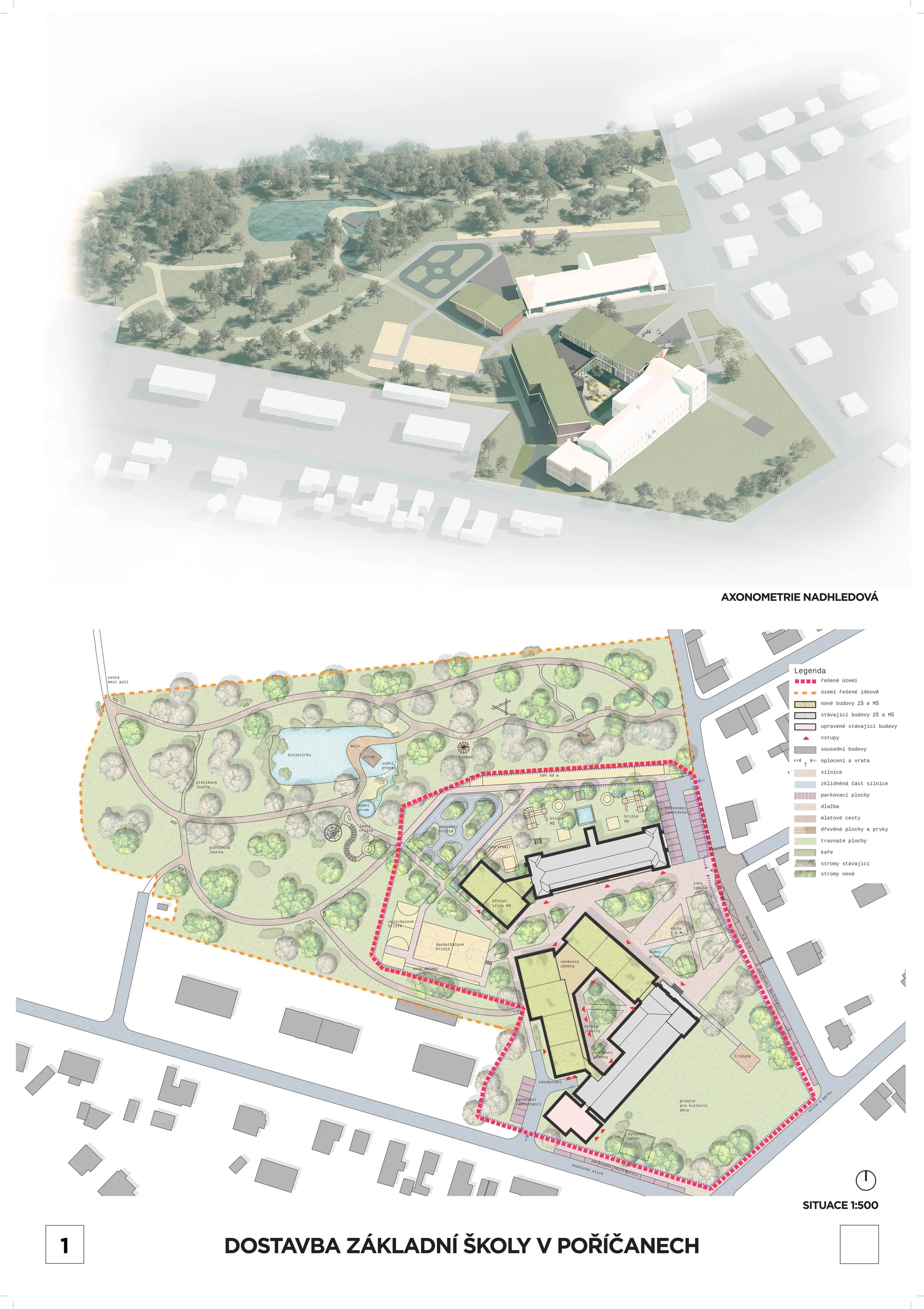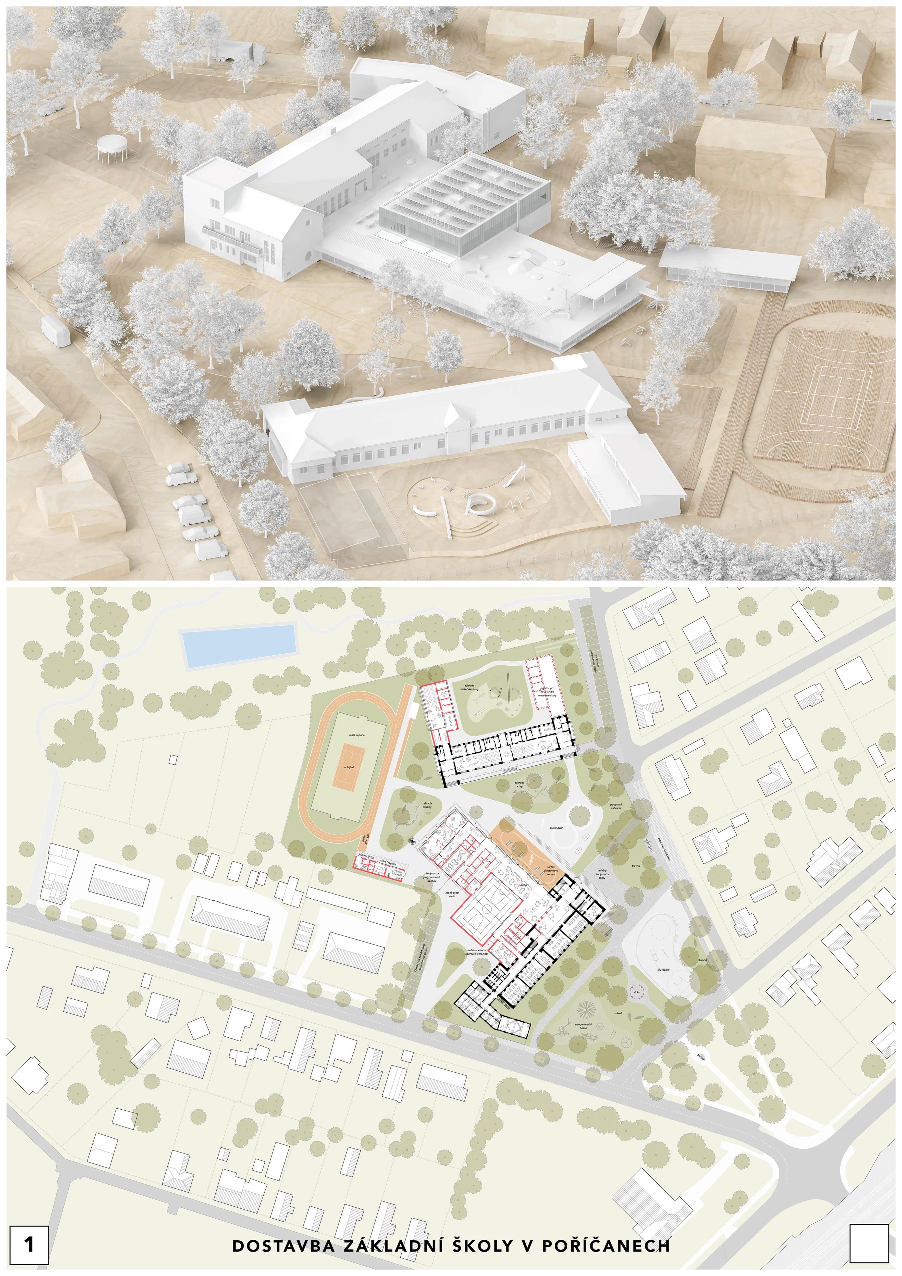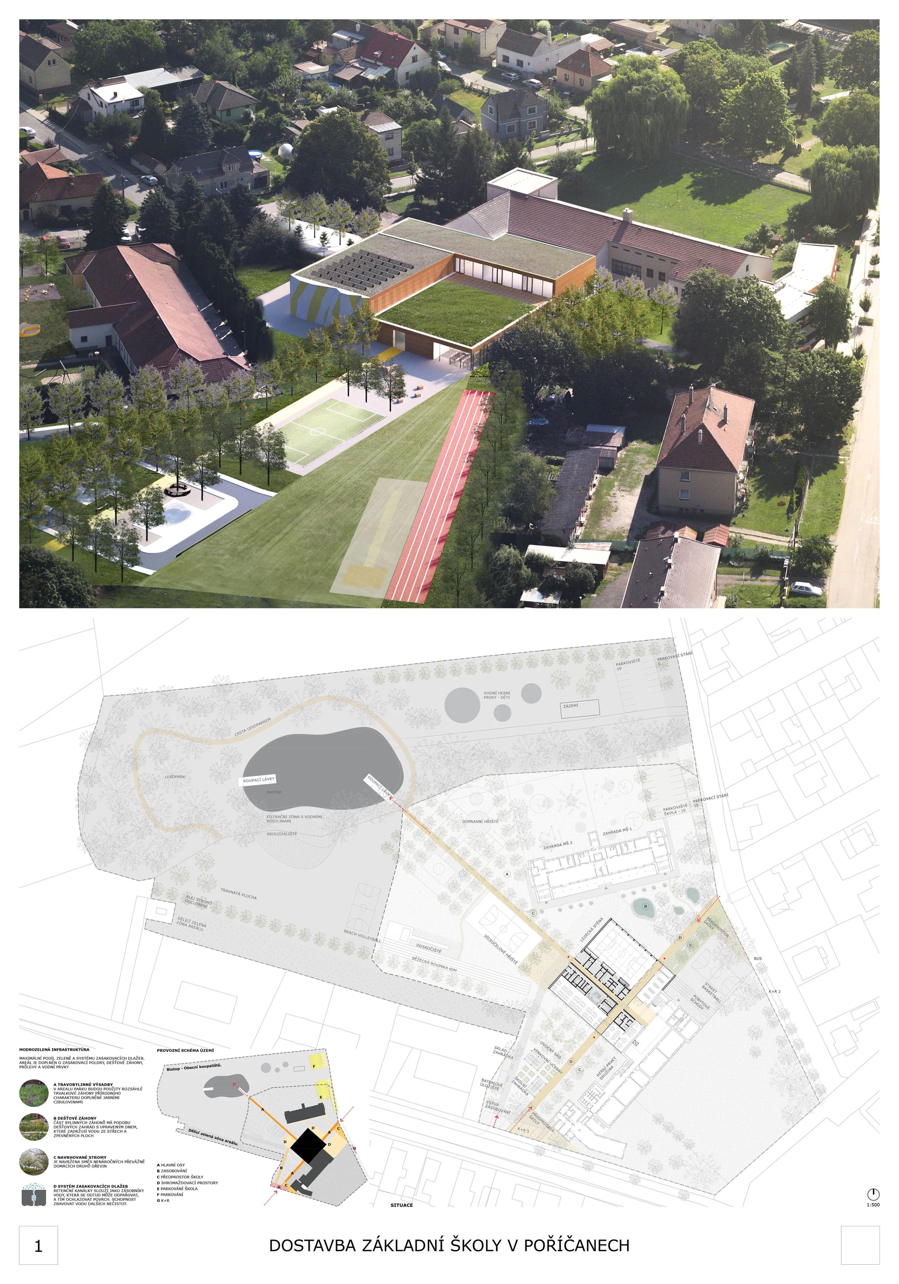 Predmetom súťaže bolo spracovanie architektonického návrhu dostavby areálu Základnej školy T. G. Masaryka a Materskej školy v stredočeskej obci Poříčany.