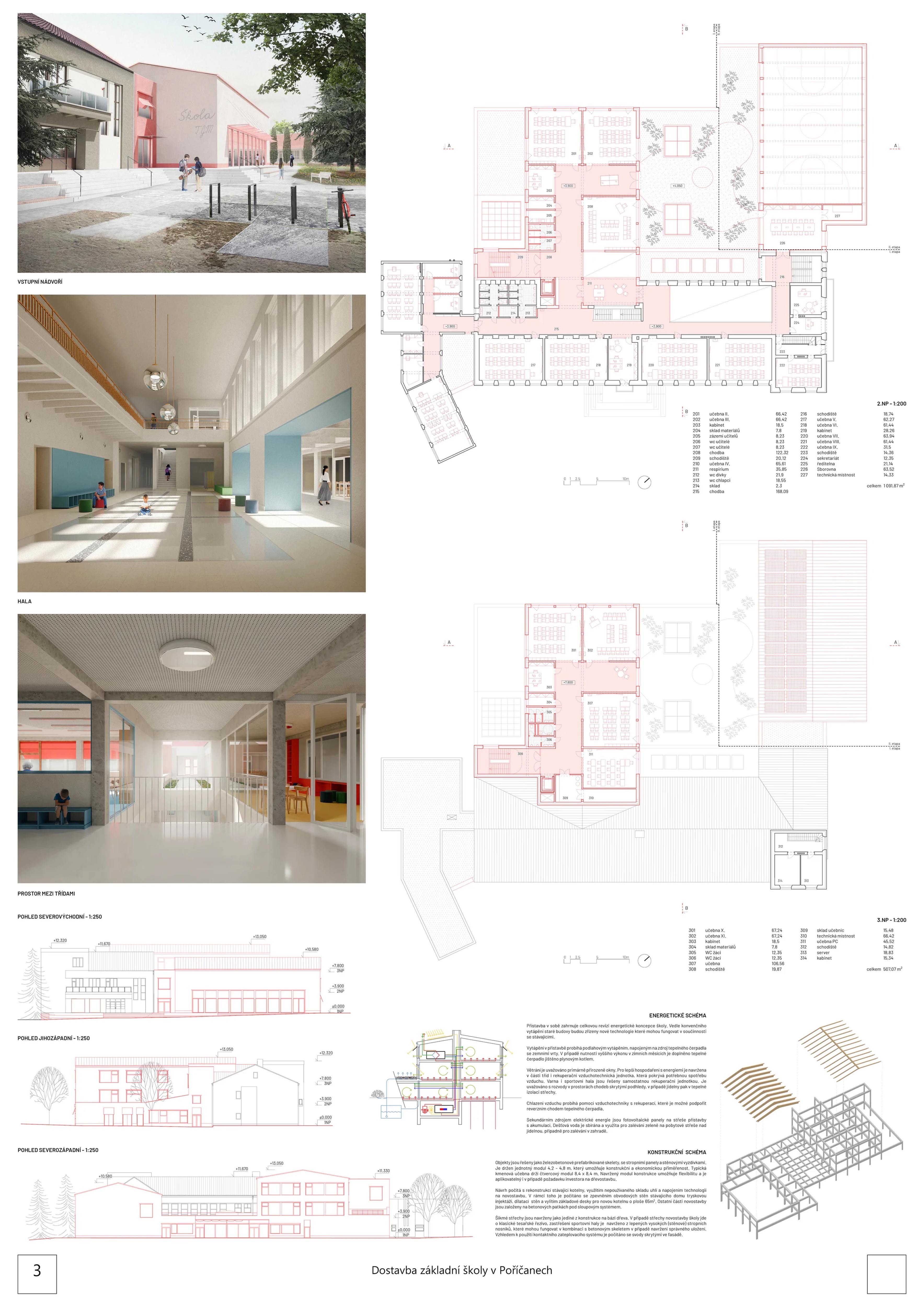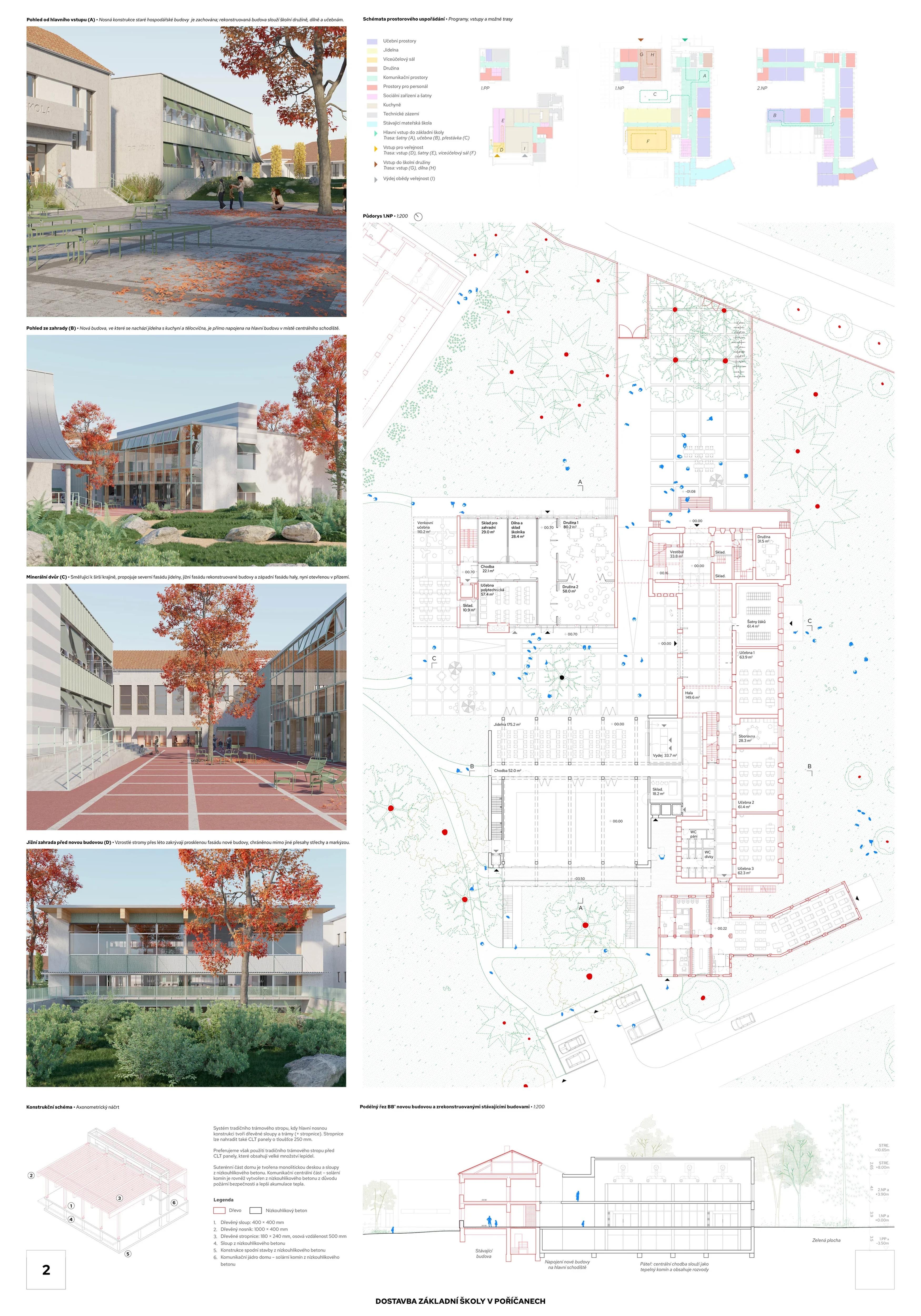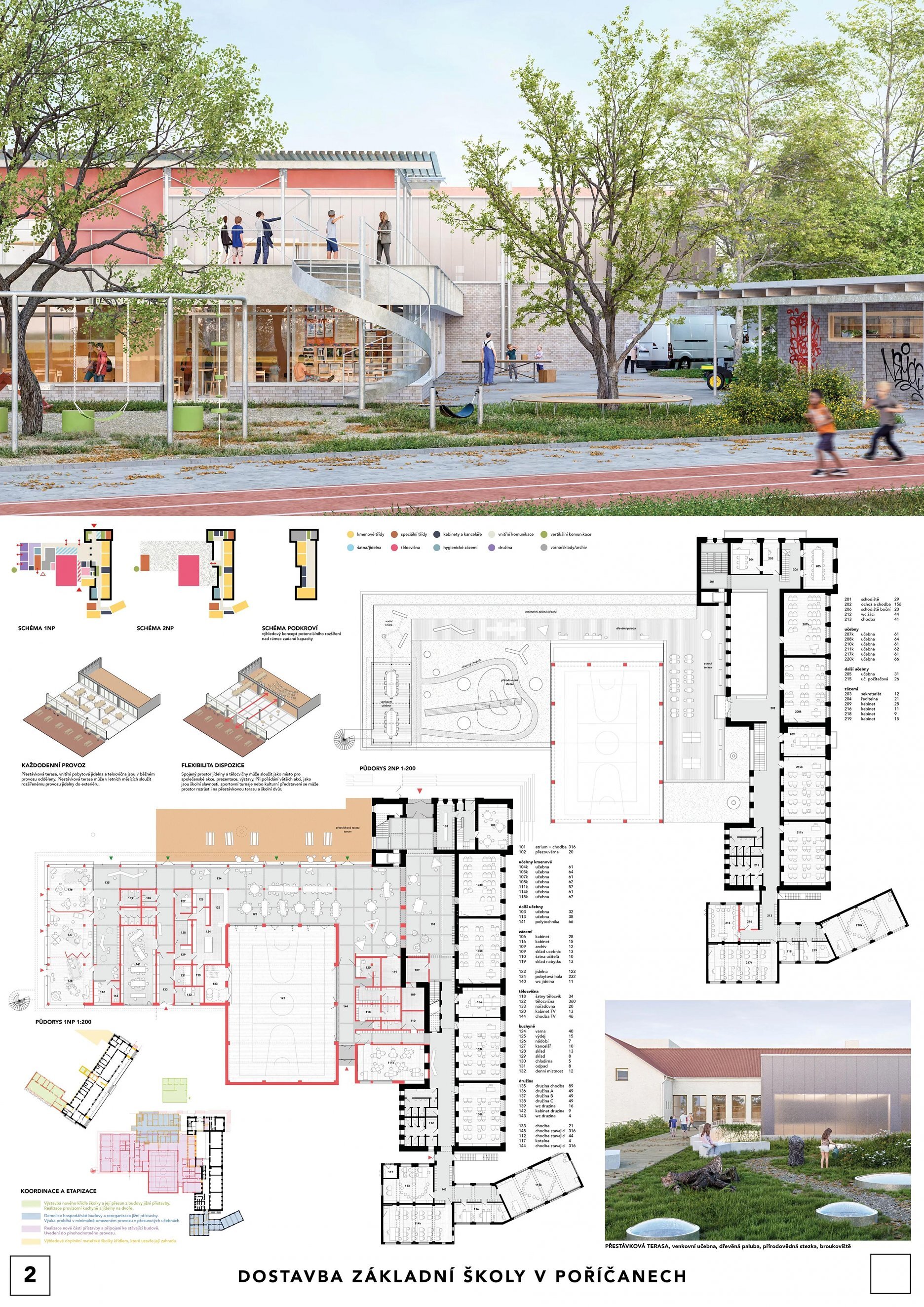 Návrh se nesnaží o zcelování přístaveb a dostavby školy v jednotném stylu, a přesto působí koherentně. Porota ocenila celkové zpracování návrhu na vysoké úrovni. V dopracování návrhu bude společně se zadavatelem nutné revidovat některé provozní vazby a řešení, přesvědčivě dopracovat propojení jídelny s tělocvičnou, vyřešit kompletní bezbariérové propojení všech částí nebo upravit míru prosklení některých fasád a hledat způsob jejich provedení tak, aby se jednalo o trvanlivé a bezúdržbové řešení.
