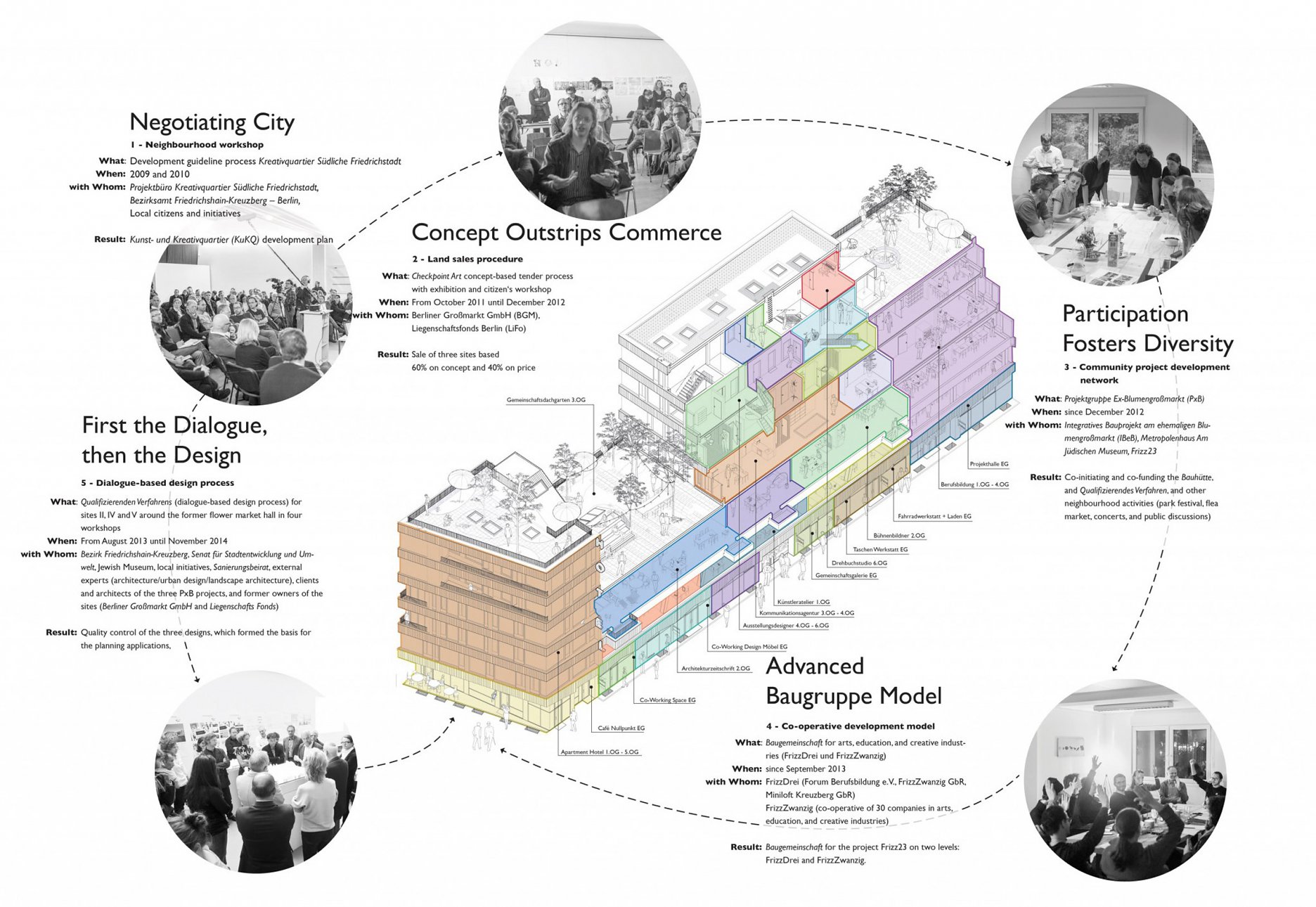 Architekti Britta Jürgens a Matthew Griffin berlínskeho Deadline ateliéru upravili obvyklú schému a iniciovali participatívny proces pre vytvorenie pracovných priestorov pre umenie, vzdelávanie a kreatívny priemysel. Najprv zostavili skupinu okolo svojich programových cieľov. 32 malých spoločností a neziskových organizácií ohrozených rýchlou džentrifikáciou Berlína sa spojilo, aby si zabezpečili priestory pre svoje aktivity. Zoskupenie následne s projektom zvíťazilo v súťaži na predaj mestských pozemkov (zo 60 % rozhodoval predložený koncept a zo 40% ponúknutá cena). Architekti formovali výslednú prevádzkovú schému v úzkom dialógu s budúcimi užívateľmi. Každá z jednotiek je navrhnutá podľa špecifických požiadaviek klienta. Najmenšia má 23 m2, najväčšia 280 m2, niektoré z nich sú dvojpodlažné a trojpodlažné.