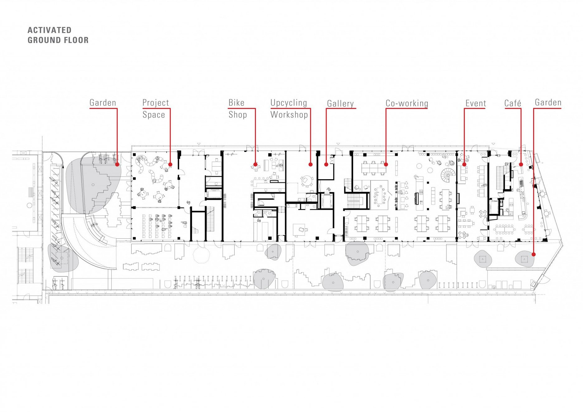 Priestorové usporiadanie definujú tri základné bloky. Celok pre organizáciu venujúcu sa neziskovému vzdelávaniu, blok pre inštitúcie z oblasti kreatívneho priemyslu, a štíhly trakt s loftovým bývaním. Všetky spomínané celky prepája verejne prístupný prevýšený parter so zalomenou stropnou doskou. Zvolené architektonické riešenie odkazuje na siluetu historickej tržnice, ktorá stála do roku 1953 na mieste aktuálnej stavby.