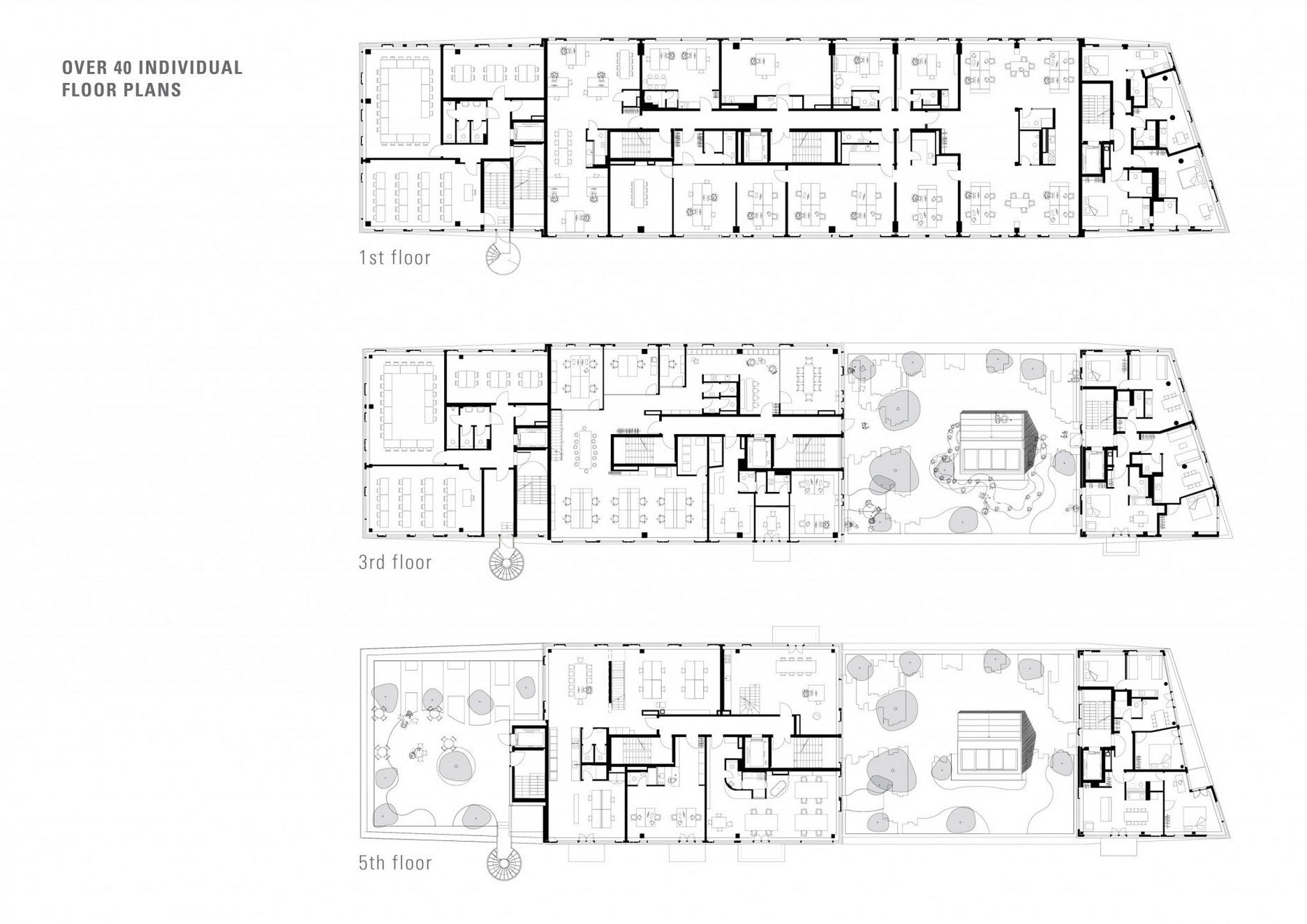 V súčte viac ako 50 percent plochy podlaží tvoria galérie. Priestorový koncept môžeme vnímať už vo foyer, cez ktoré plynie schodisko, ako otvorená spojnica medzi dianím v celej budove. Kaskádovo prepojené terasy na vonkajšom obvode fasády umožňujú voľný pohyb v exteriéri. Od úrovne terénu, až po rozsiahlu strešnú krajinu.