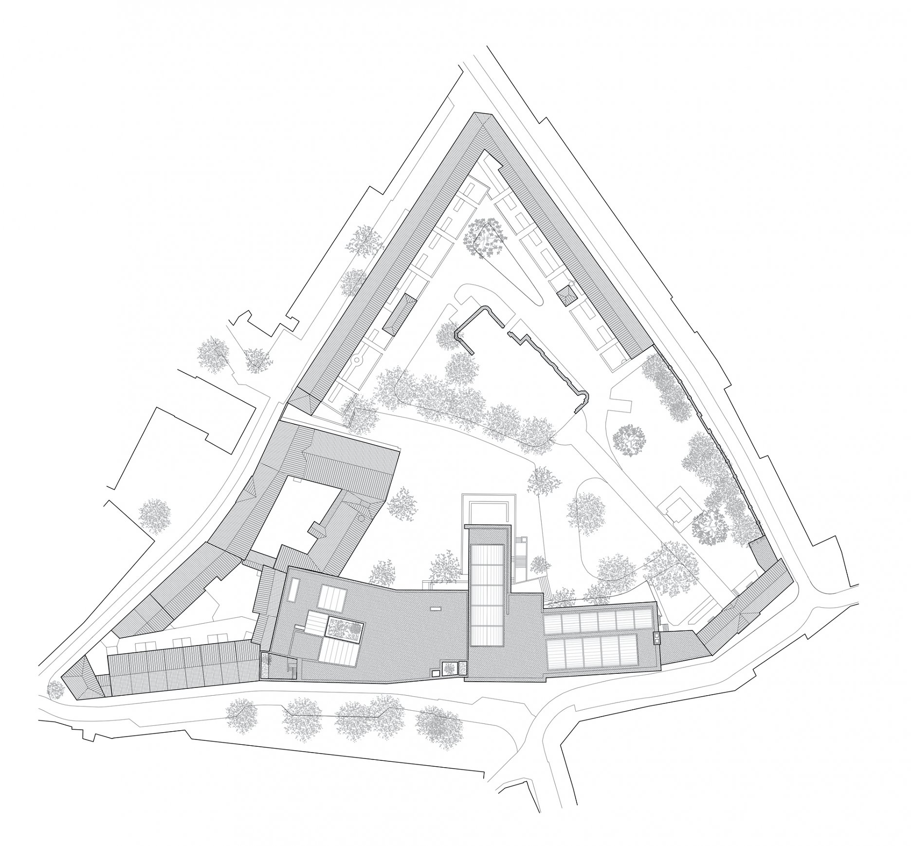 Historický komplex tvorí samostatný ostrov uprostred mestskej štruktúry. Záhradu obkolesuje eklektická hradba tehlových stavieb, medzi ktoré po novom patrí aj Dom pre súčasné umenie. Priestory orientované do zelenej záhrady vytvárajú svet izolovaný od ruchu centra mesta.