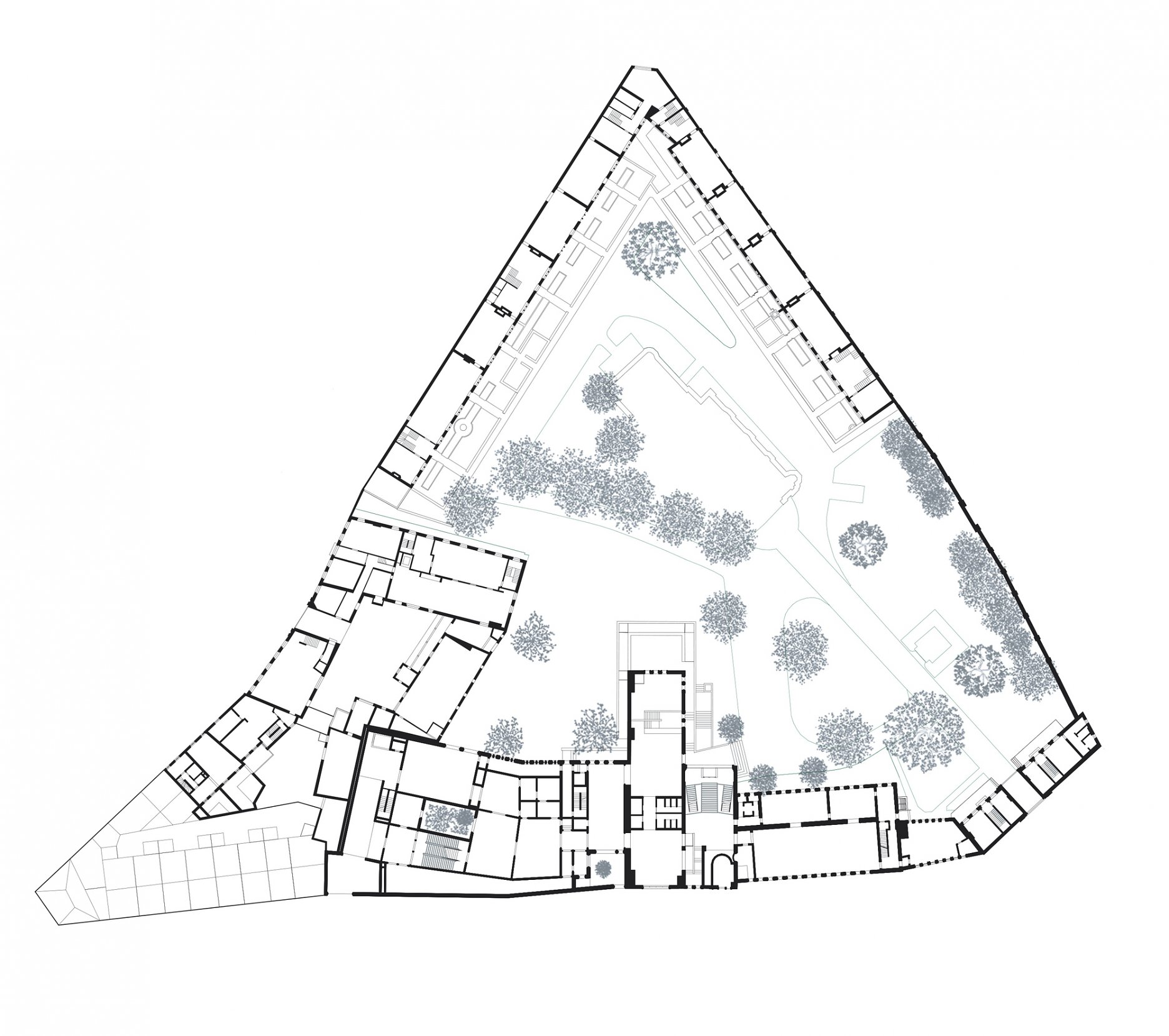Stavba je usporiadaná okolo centrálneho nádvoria, ktoré slúži ako komunitný priestor pre obyvateľov. Vstupný portikus prepája centrálnu spoločnú zónu s verejným priestorom.