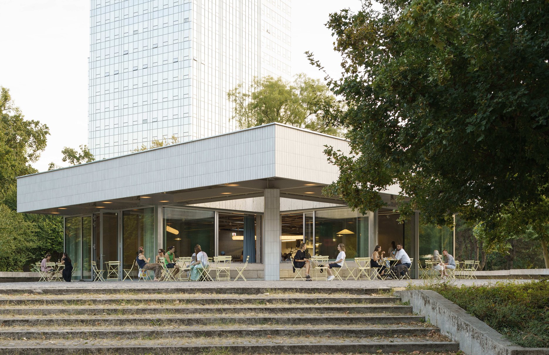 The building, an adaptive reuse of a structure from 1982, was constructed to provide services to one of Central Europe’s oldest public parks. The program restores the originally intended public amenities, including a café, open public restrooms, and a backstage for park events.