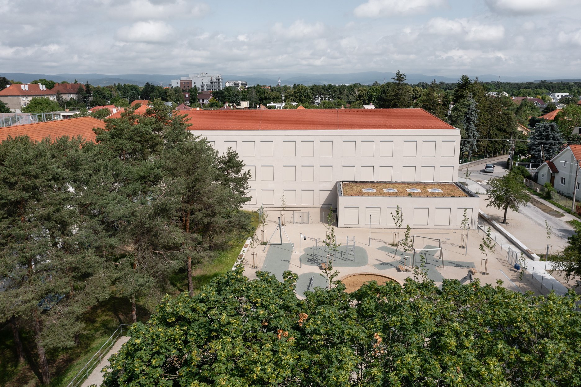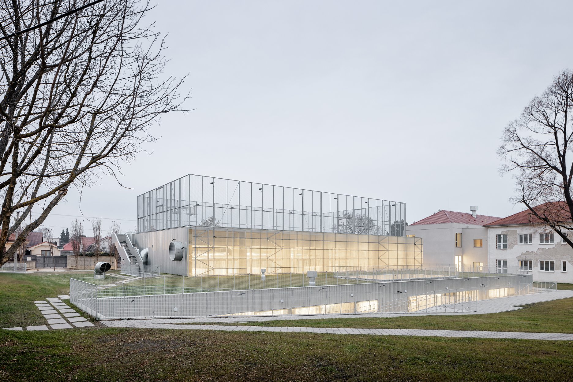 The L-shaped composition of a new with the original school figure creates a new public space - a park with a playground. The figure of new pavilion has a simple layout formed by a generous corridor and classrooms. Two smaller volumes, canteen and teachers' offices, are added to the basic prism. The corridor serves as a living space for students during breaks and also as a cloakroom. A horizontal skylight between the classroom and the corridor allows afternoon winter light to penetrate into the classrooms. The multipurpose hall is located on the northern part of the plot as well, so southern part is left free for greenery. The newly created public space is clearly defined. The hall is connected with school pavilions by an underground corridor, so there is no barrier on the ground, and the cluster is fully open to the public and permeable. A green roof and rooftop playground are also available for residents. New pavilions defines the northern boundary of the village center.