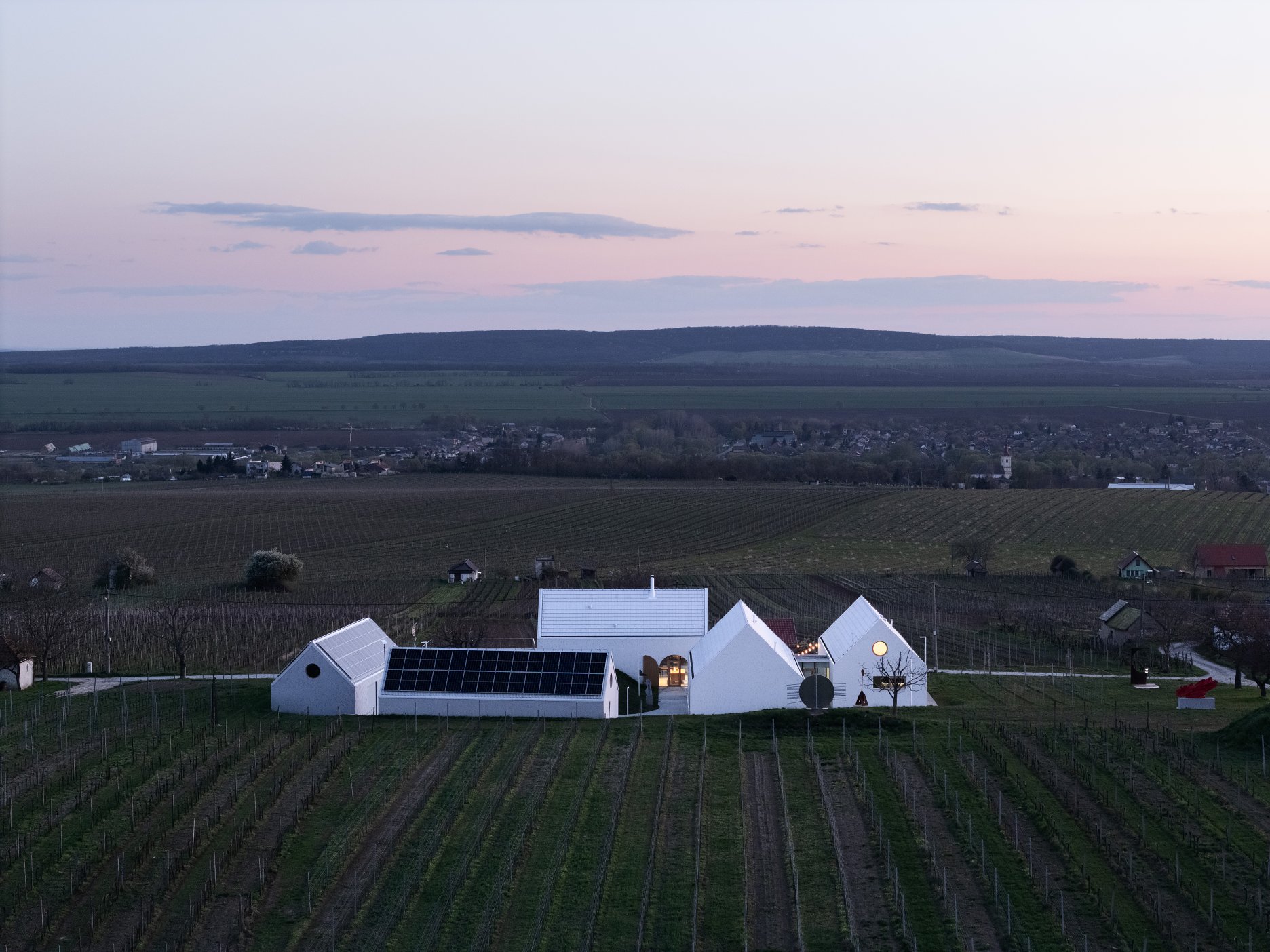 "The winery is situated in Strekov, a region with a long and established tradition of winemaking. The building's design is a reflection of its context, adopting the dimensions and architectural style of traditional vineyard houses, which are constructed from brick and feature gabled roofs. The structure is subdivided into six white single-storey volumes. The functions are arranged around a courtyard, the perimeter of which is defined by an array of trees. The use of white-painted brick serves to blend the complex into the local landscape, thereby establishing a distinct identity.