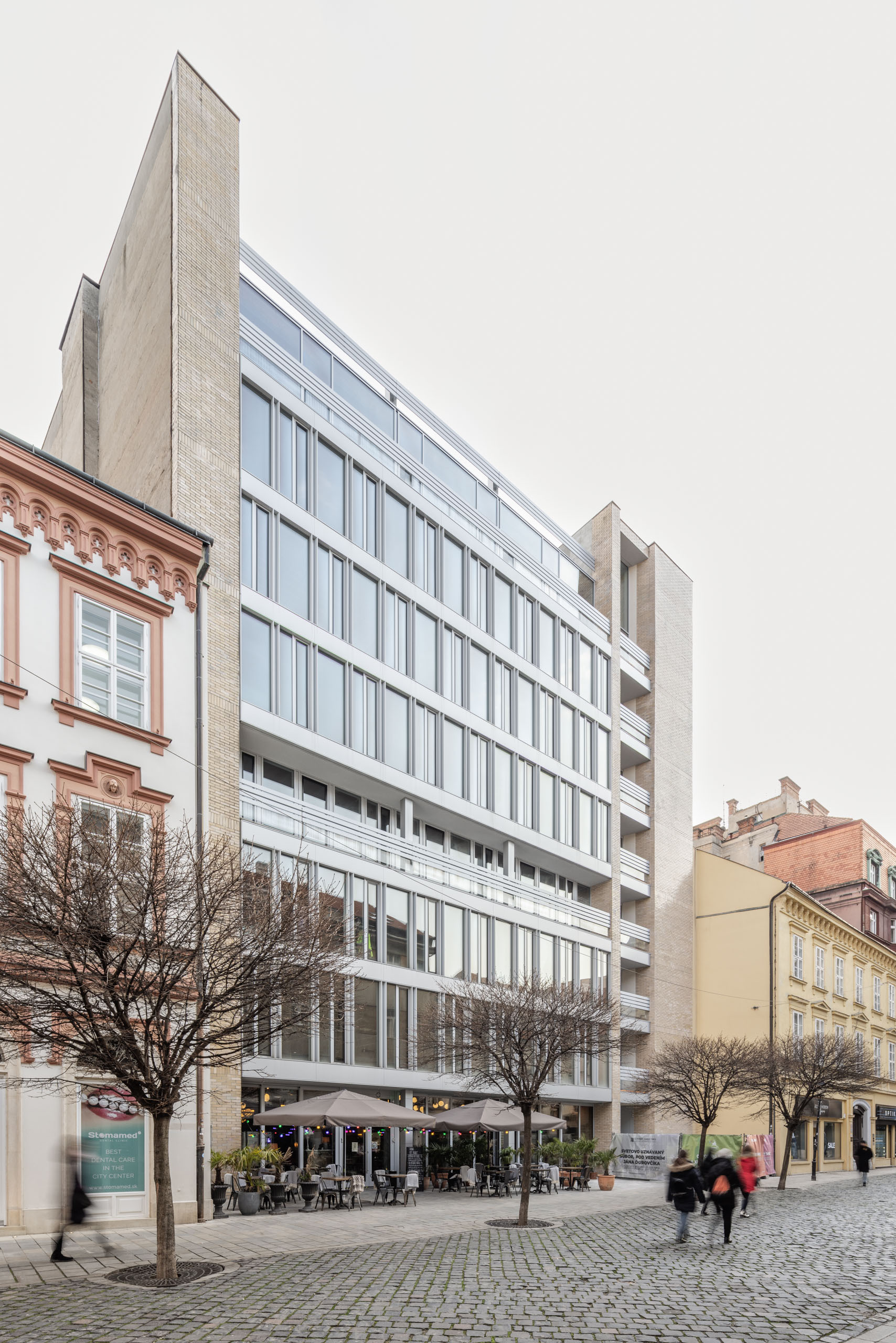 "The building on Laurinská Street is located in the historic center of Bratislava, in the pedestrian zone, nestled between historic buildings. With its open layout across eight floors, it has in the past provided space for several institutions. The building retained its architectural character until 2020, when it required technical and technological renovation, as well as a contemporary visual “facelift” of the façade, taking into account its original aesthetic qualities and the preservation of its mass.