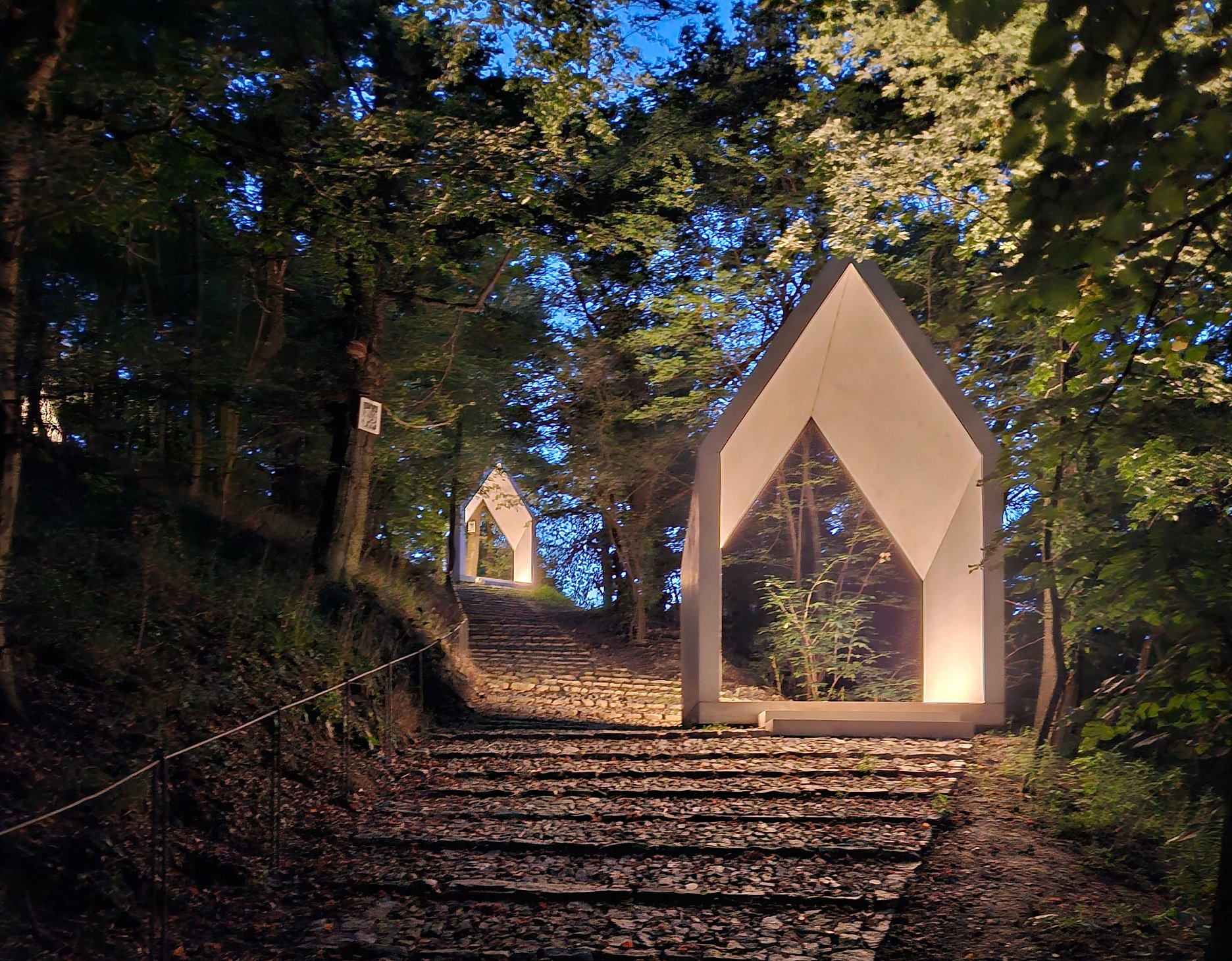 white concreat - remain part of the path as well Artwork - the small-scale structure of the mosaic, its detail, elaboration and depiction gives the station an artistic and spiritual quality, and it stands out and dominates because of the unambiguous pure architectural representation of the mass of the station The statues on the sides of the chapel -in the places of the original stations the statues could come back as replicas, on the ground next to the man, passing with him through time..."