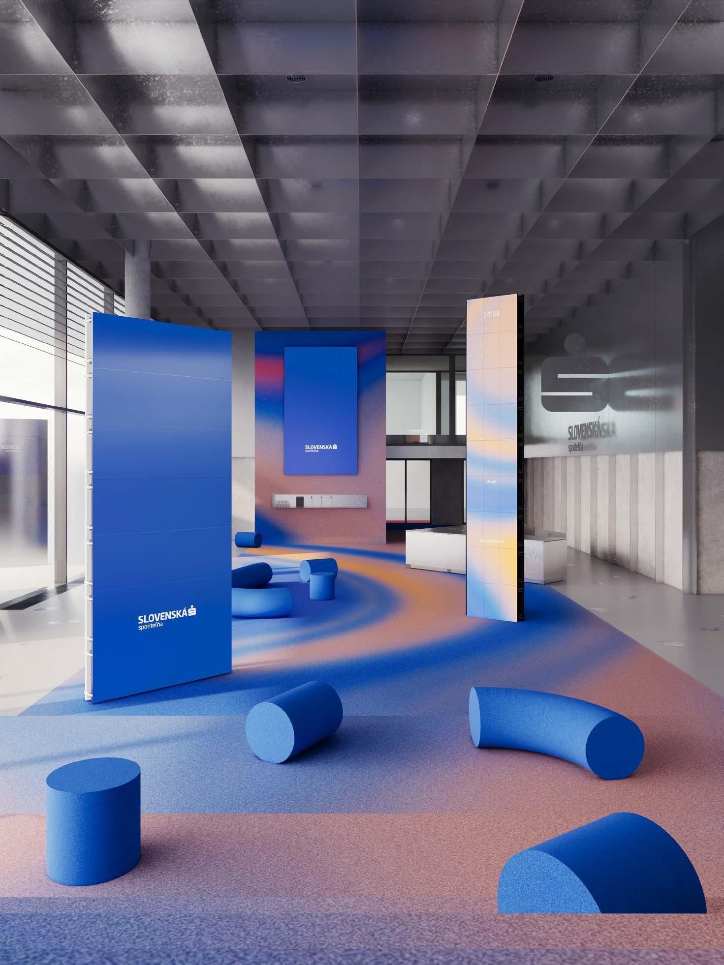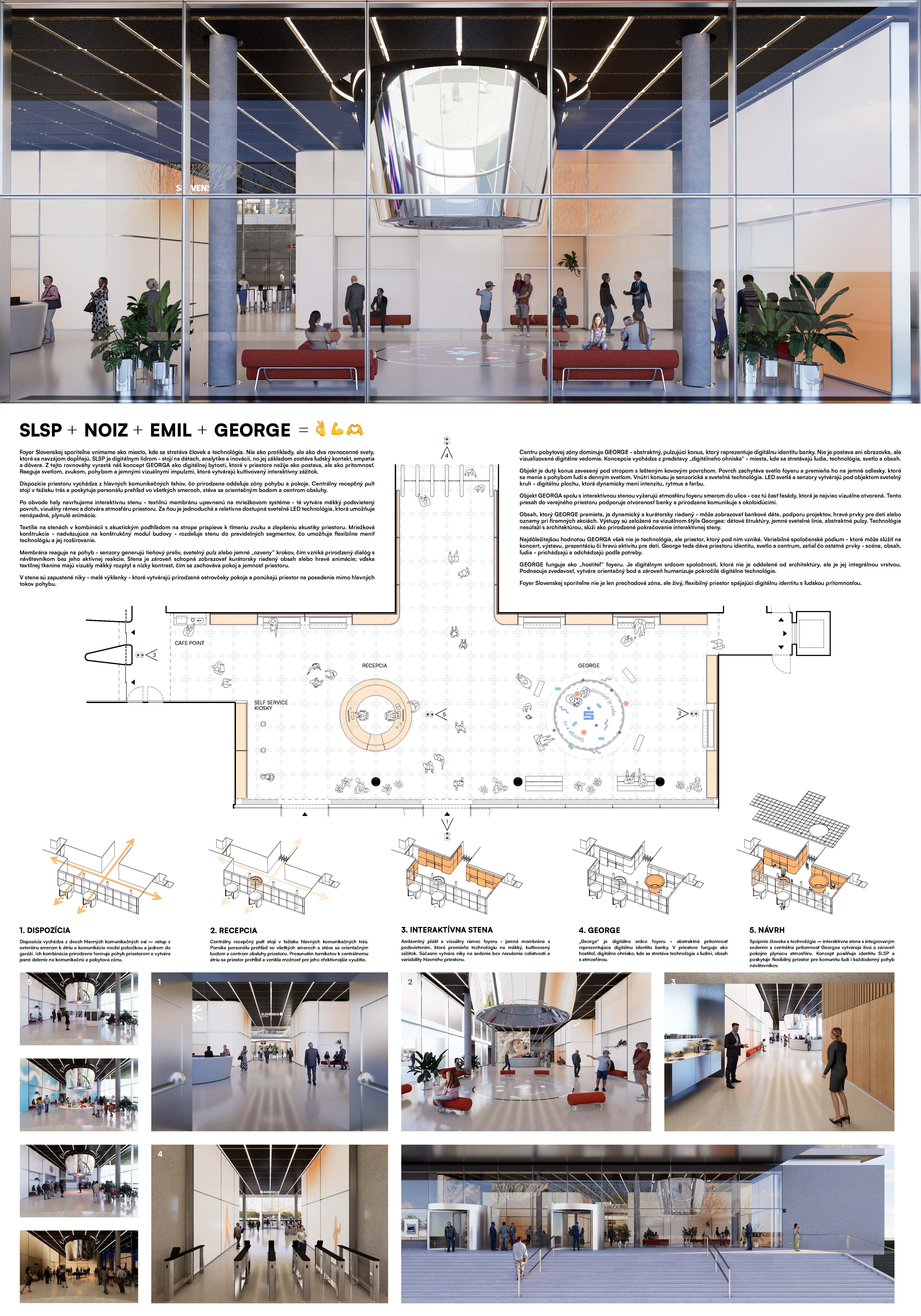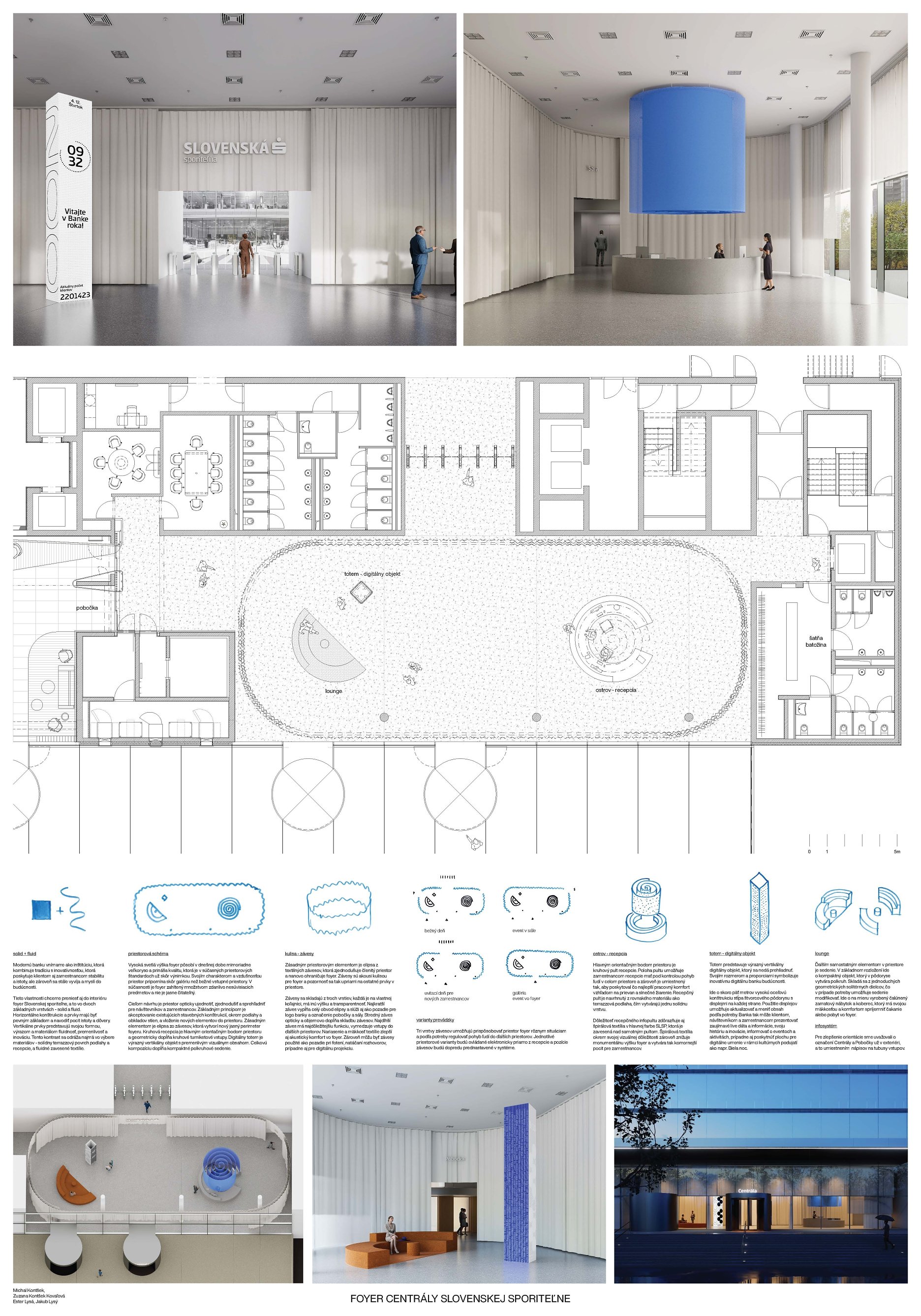 Návrh pracuje s priestorom foyer centrály SLSP veľmi presvedčivým spôsobom. Pracuje s konceptom banky nie ako tradičnej inštitúcie ale ako technologického lídra a inovátora v bankovom prostredí.
