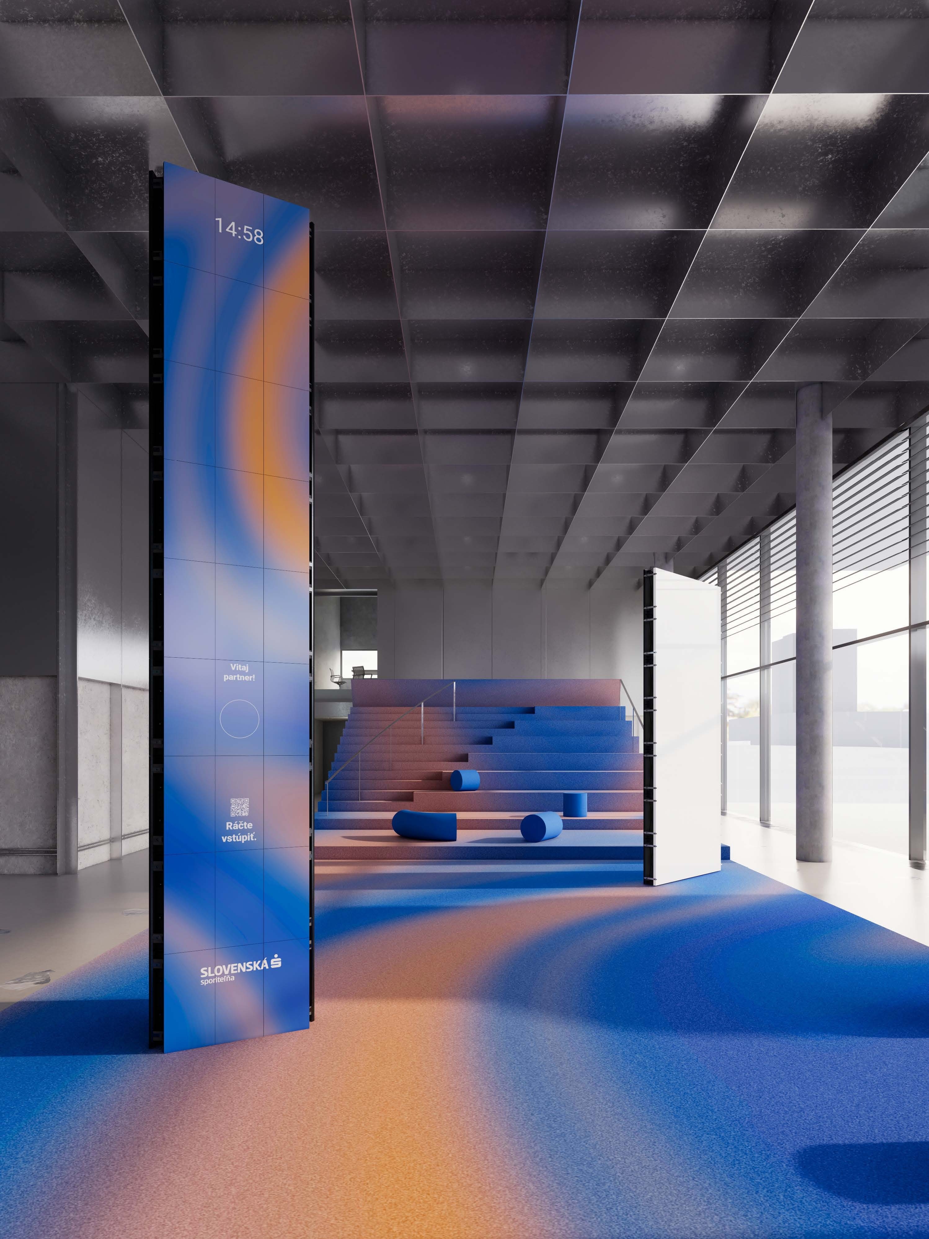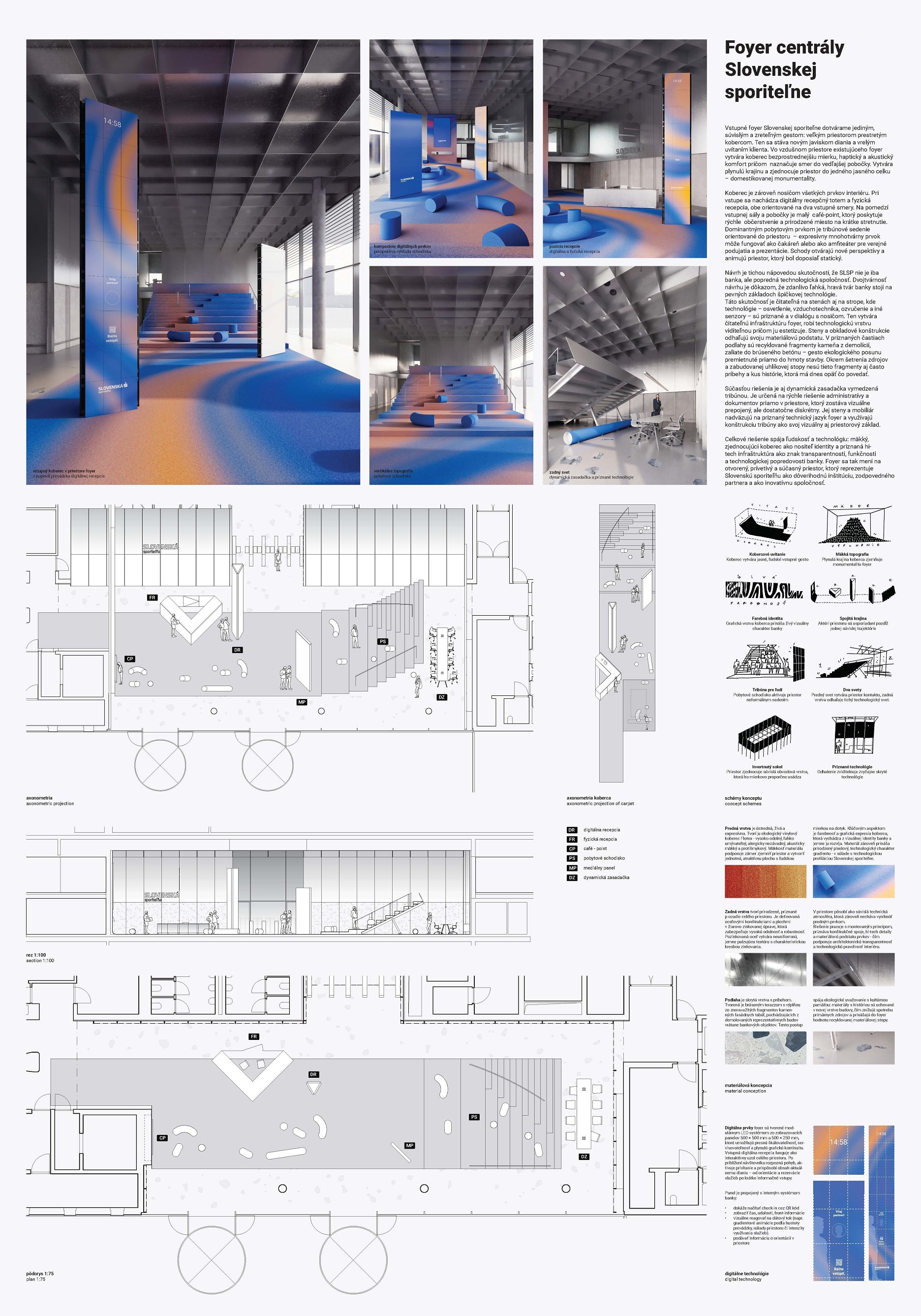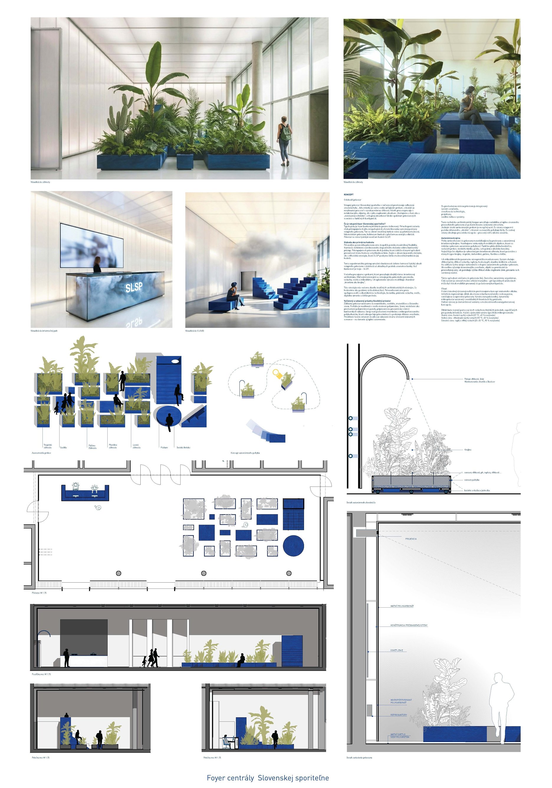 Návrh pracuje s priestorom foyer centrály SLSP veľmi presvedčivým spôsobom. Pracuje s konceptom banky nie ako tradičnej inštitúcie ale ako technologického lídra a inovátora v bankovom prostredí.