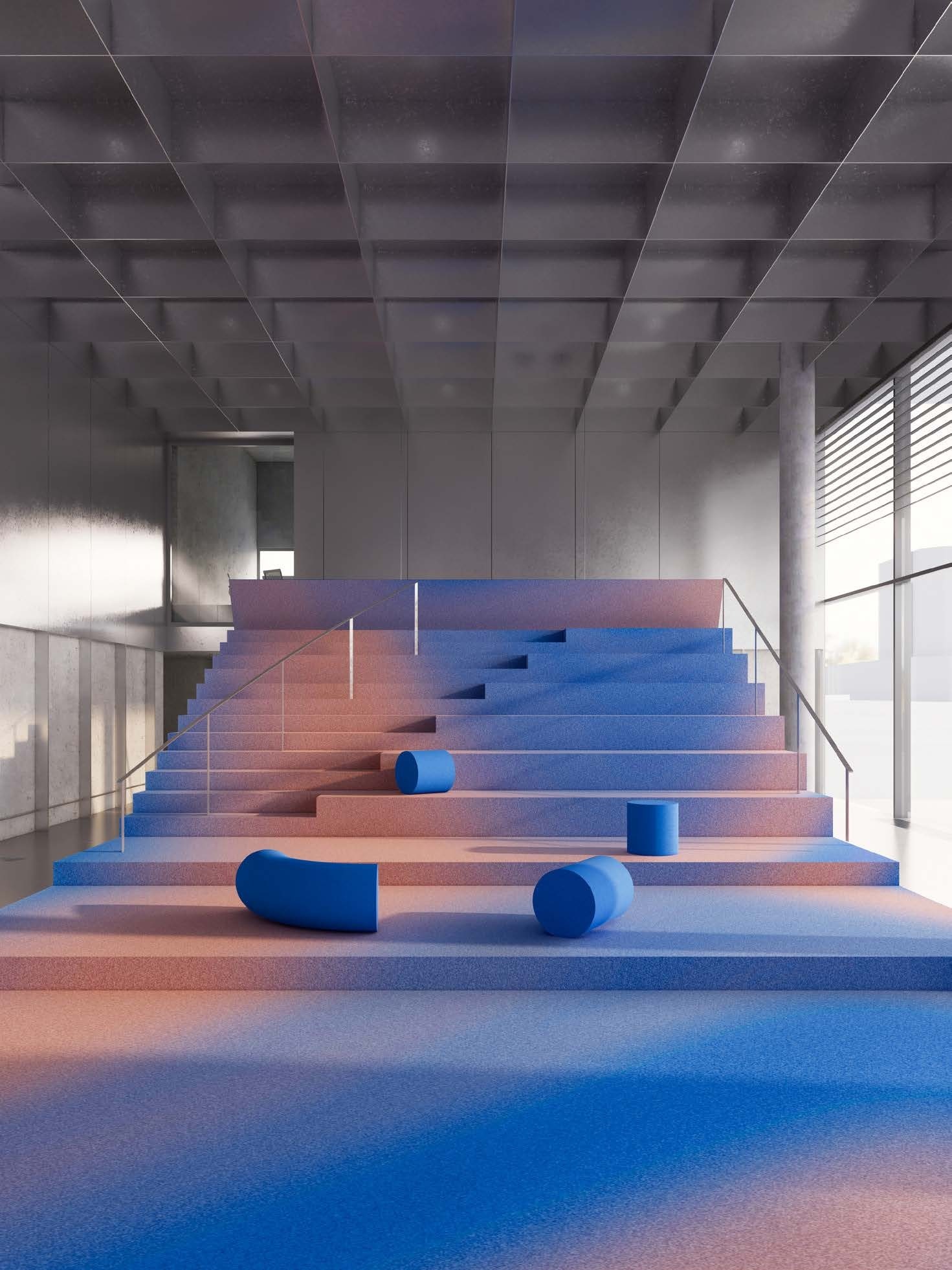 Ako protipól tento jasnosti je umiestnený “koberec” naprieč miestnosťou, ktorý má za úlohu zjemniť prvotnú materiálovú tvrdosť alebo jednoznačnosť s farebnou škálou odvíjajúcej sa od identity zadávateľa a rozvíja ju do inej sféry. Koberec tvarovo kopíruje vkladané prvky, čím podporuje myšlienku „plynulej krajiny“ a zároveň vytvára presahy a prepojenia medzi jednotlivými funkciami. Veľmi vtipne pracuje s vizuálnym čistým stvárnením “front end” a materiálovo drsným “back end” riešením.