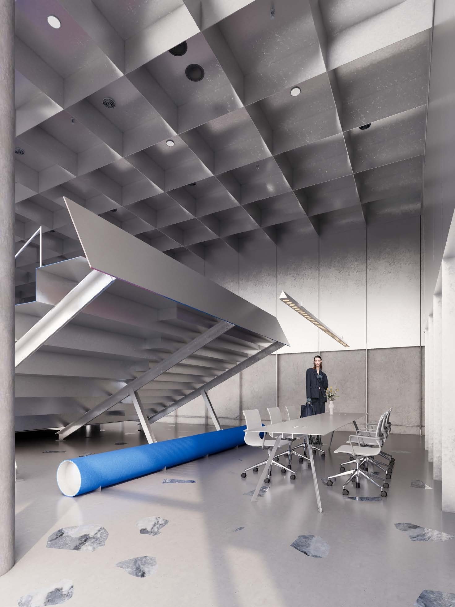 Pri dopracovaní návrhu porota odporúča prehodnotiť vloženú oceľovú konštrukciu stropu a prípadne ju nahradiť ľahším akustickým materiálom. Tento prvok tvorí však až sekundárny element v rámci priestoru.