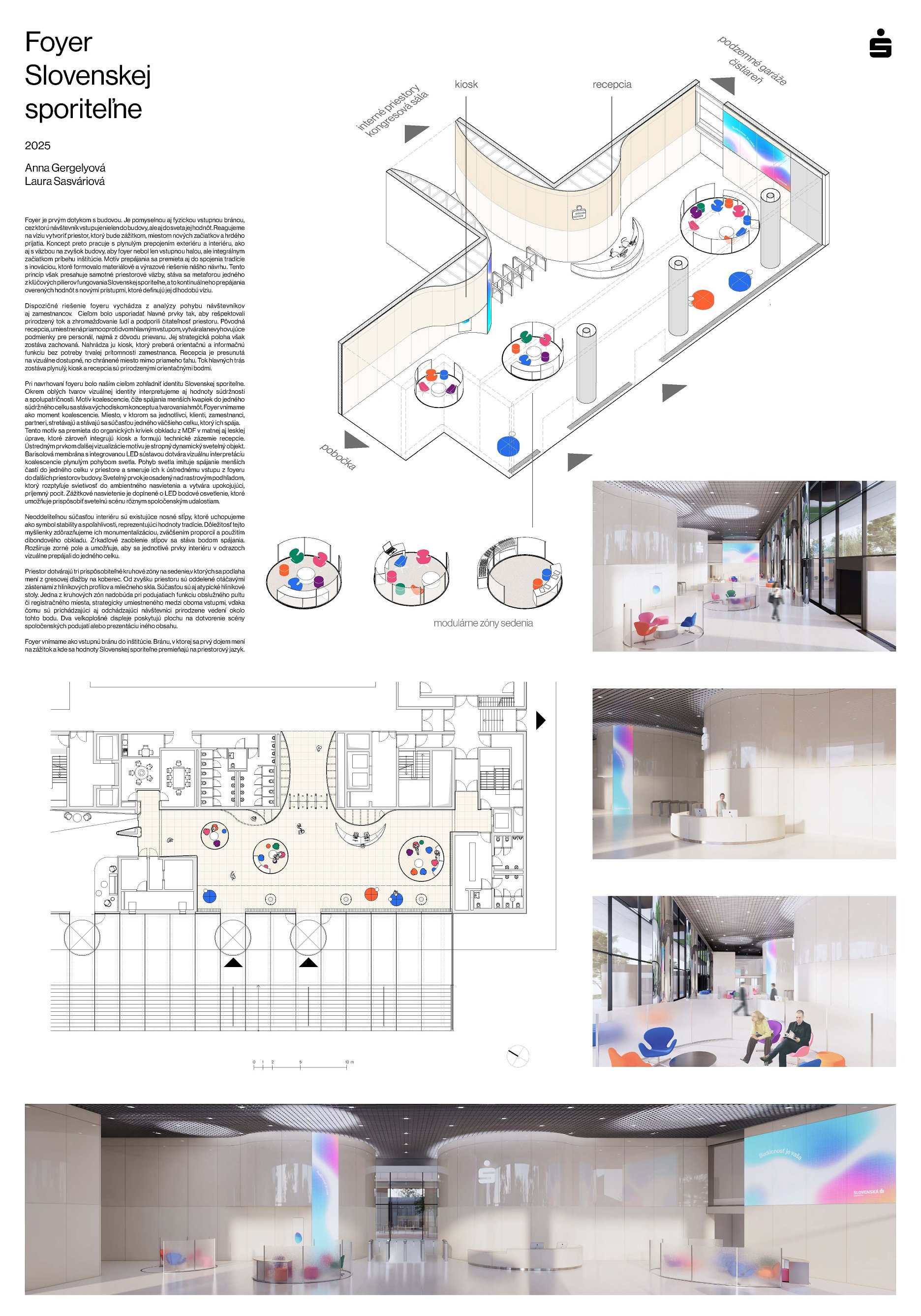 Autorky pristupujú k foyer s dôrazom na jeho pôvodné priestorové kvality a pretavujú ich do vizuálne jednotného, atmosféricky čitateľného riešenia. Porota oceňuje najmä stropný prvok, ktorý inteligentne pracuje s mierkou, svetelnosťou a orientačnými kvalitami priestoru a má potenciál stať sa výrazným nositeľom identity. Pozitívne bola hodnotená aj poloha recepcie a doplnené zázemie, ktoré priestor prevádzkovo zjednocuje a sprehľadňuje.
