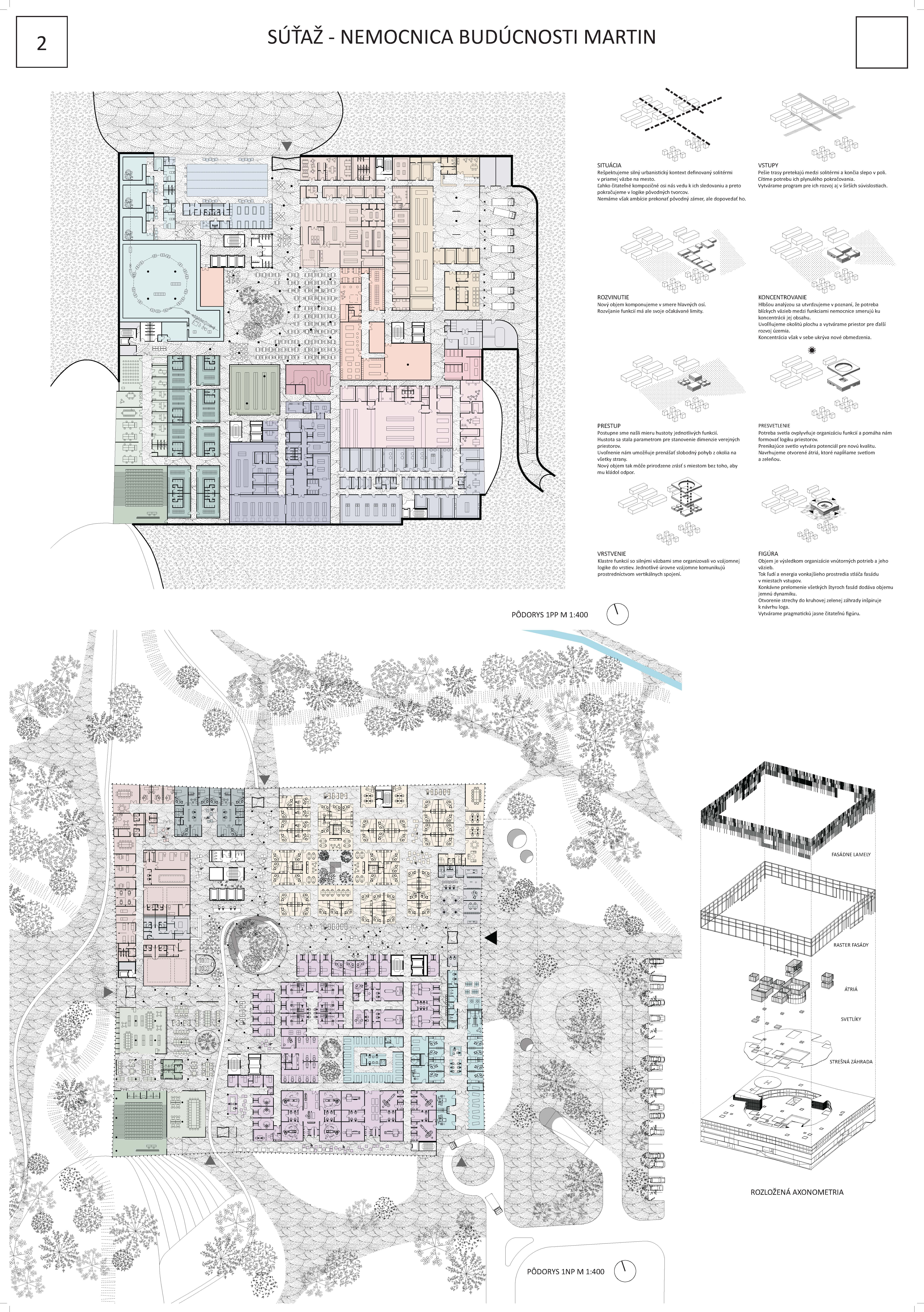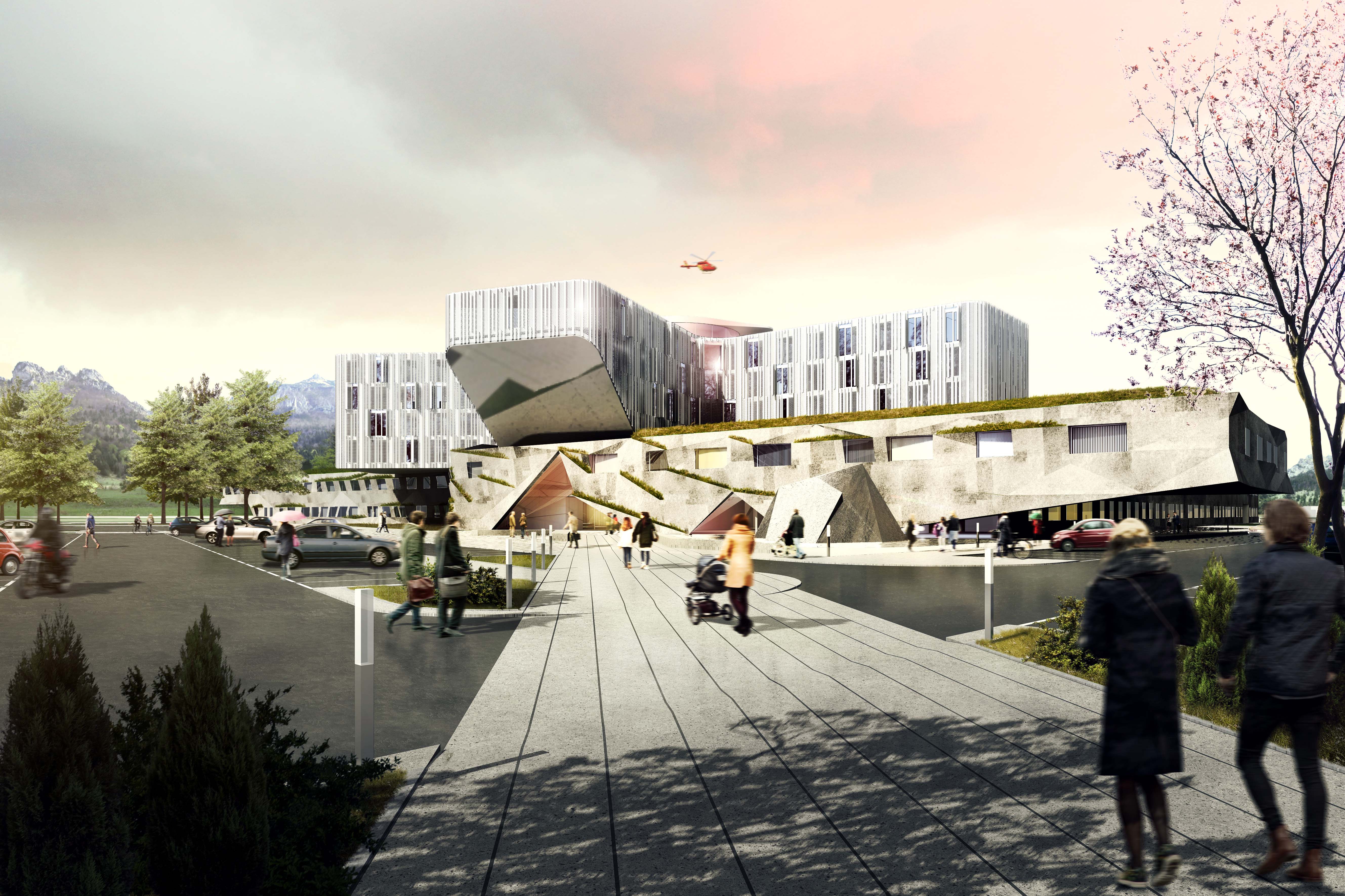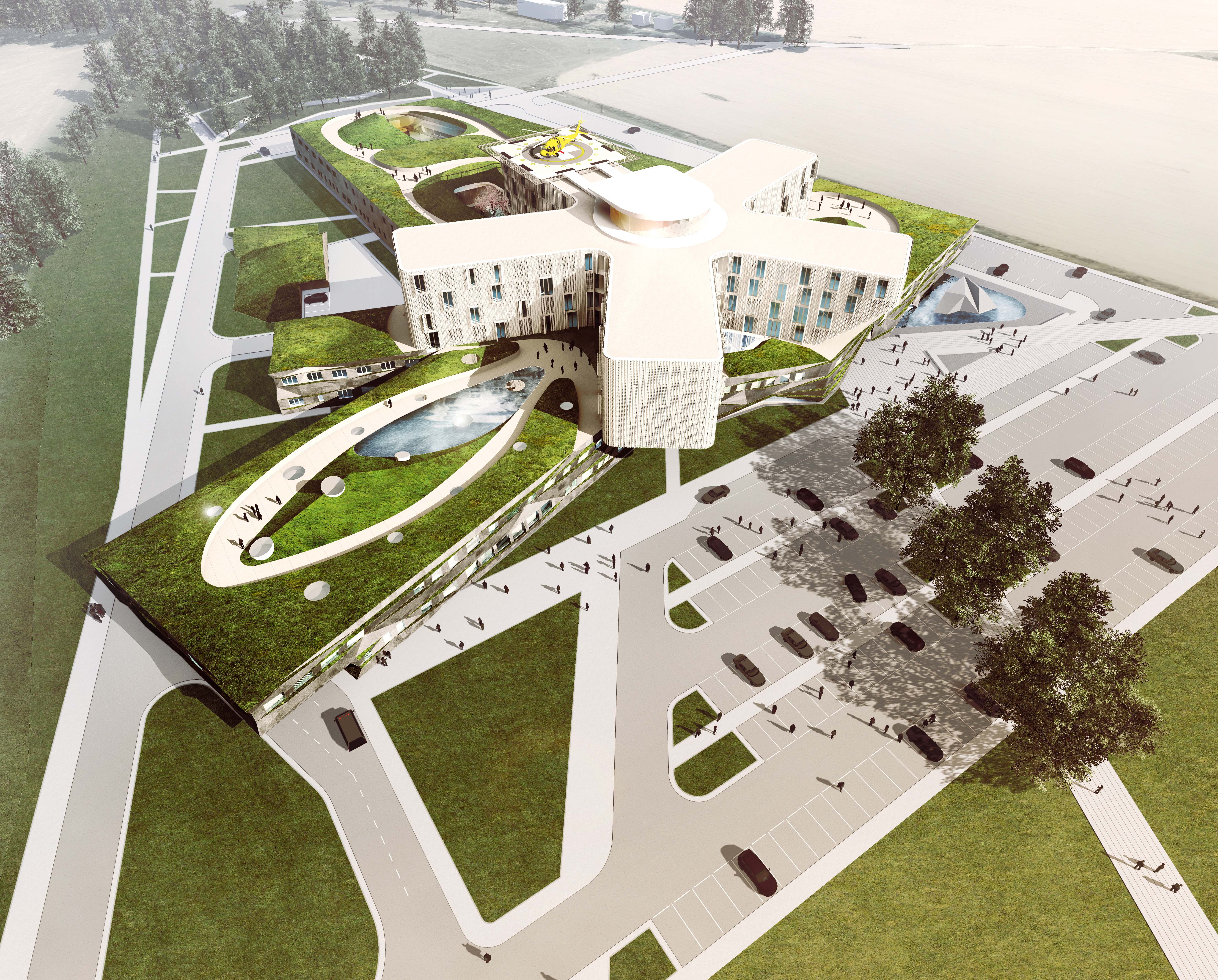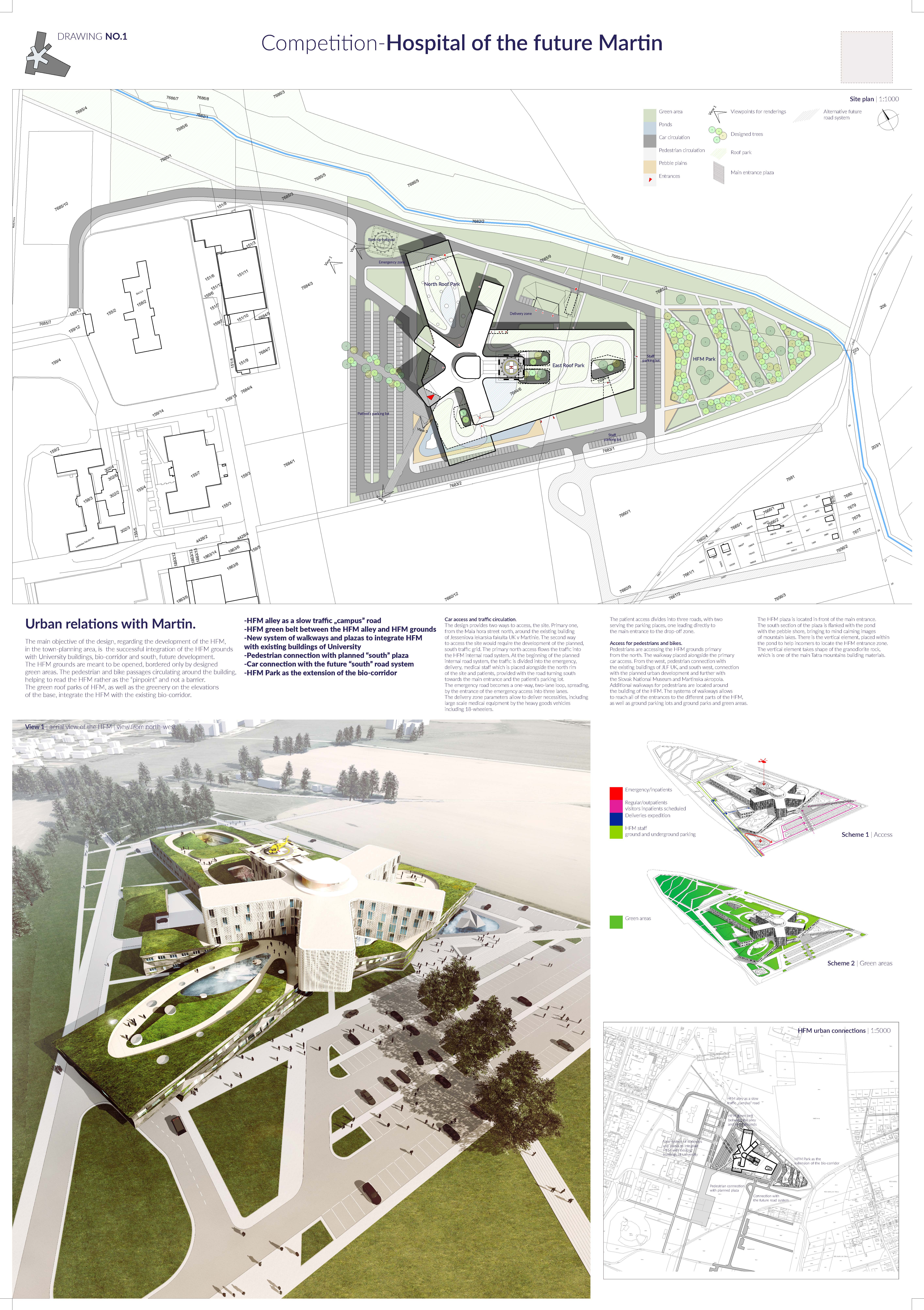 Návrh vhodným spôsobom nadväzuje na mestskú urbanistickú štruktúru a zkomponováva ju do vlastnej hmotovo-priestorovej architektonickej koncepcie. Zároveň citlivým spôsobom reaguje na prírodné prostredie. Táto previazanosť mestského a prírodného rámca je silným atribútom návrhu. Priestory a jednotlivé funkčné celky sú komponované logicky a dimenzované veľkoryso. Kvalita vnútorného prostredia je v rovnováhe s exteriérovým poňatím komplexu. Prevádzka nemocnice je navrhnutá prehľadne a účelne v súlade s požiadavkami na „nemocnicu budúcnosti“. Z hľadiska objemových a plošných kapacít ide o jeden z najnáročnejších návrhov. Modulárne riešenie konceptu umožňuje flexibilitu vnútorného usporiadania ako aj prípadnú redukciu alebo rozšírenie v budúcnosti bez zníženia kvality celkového riešenia.