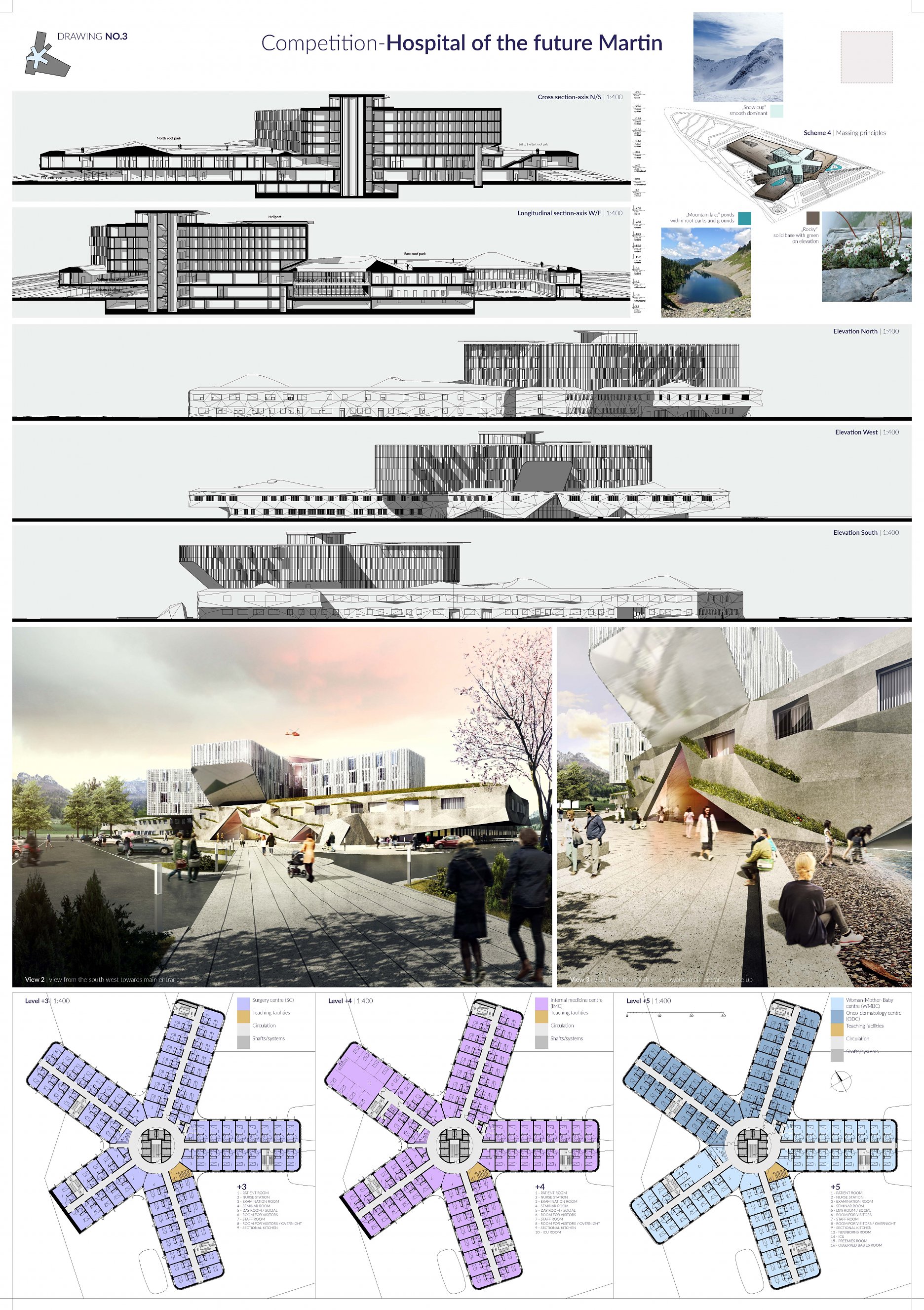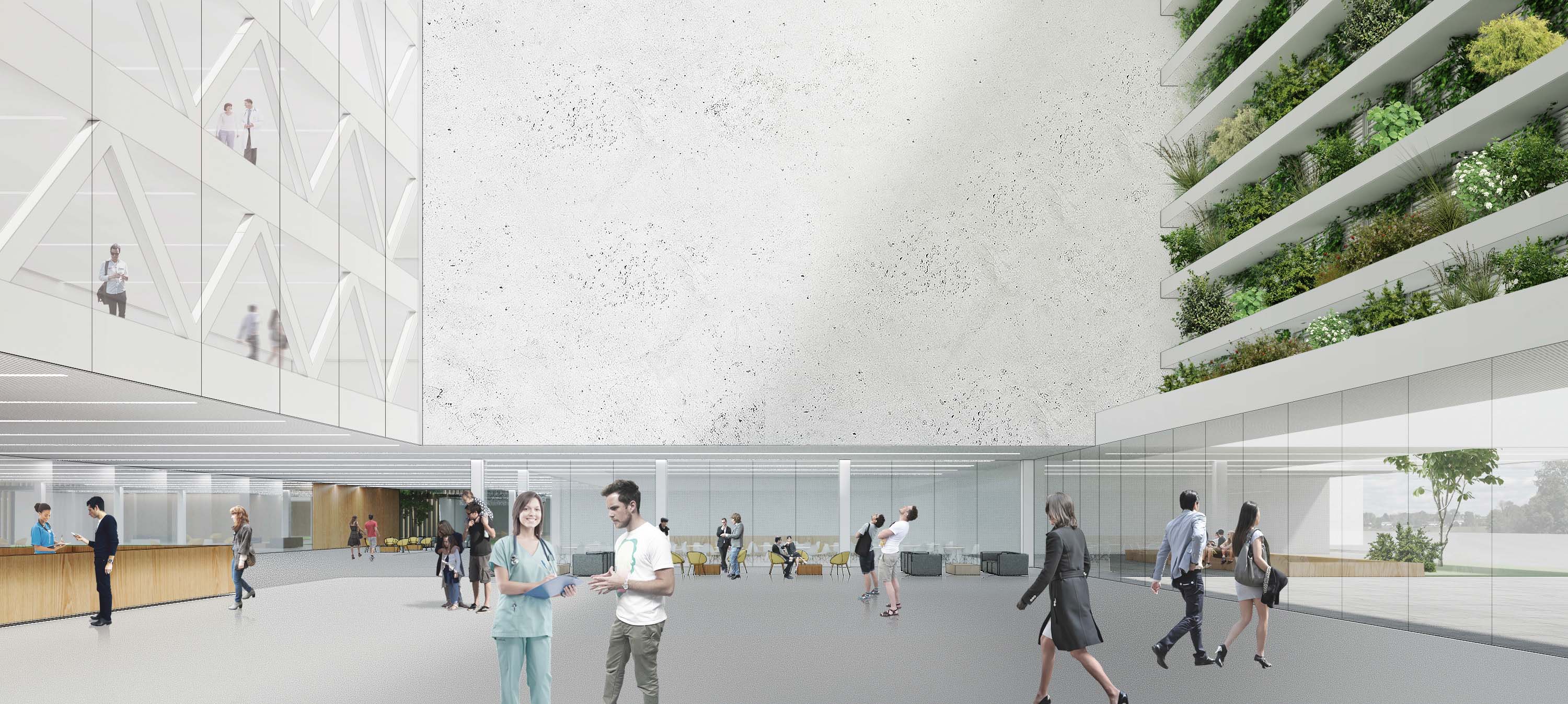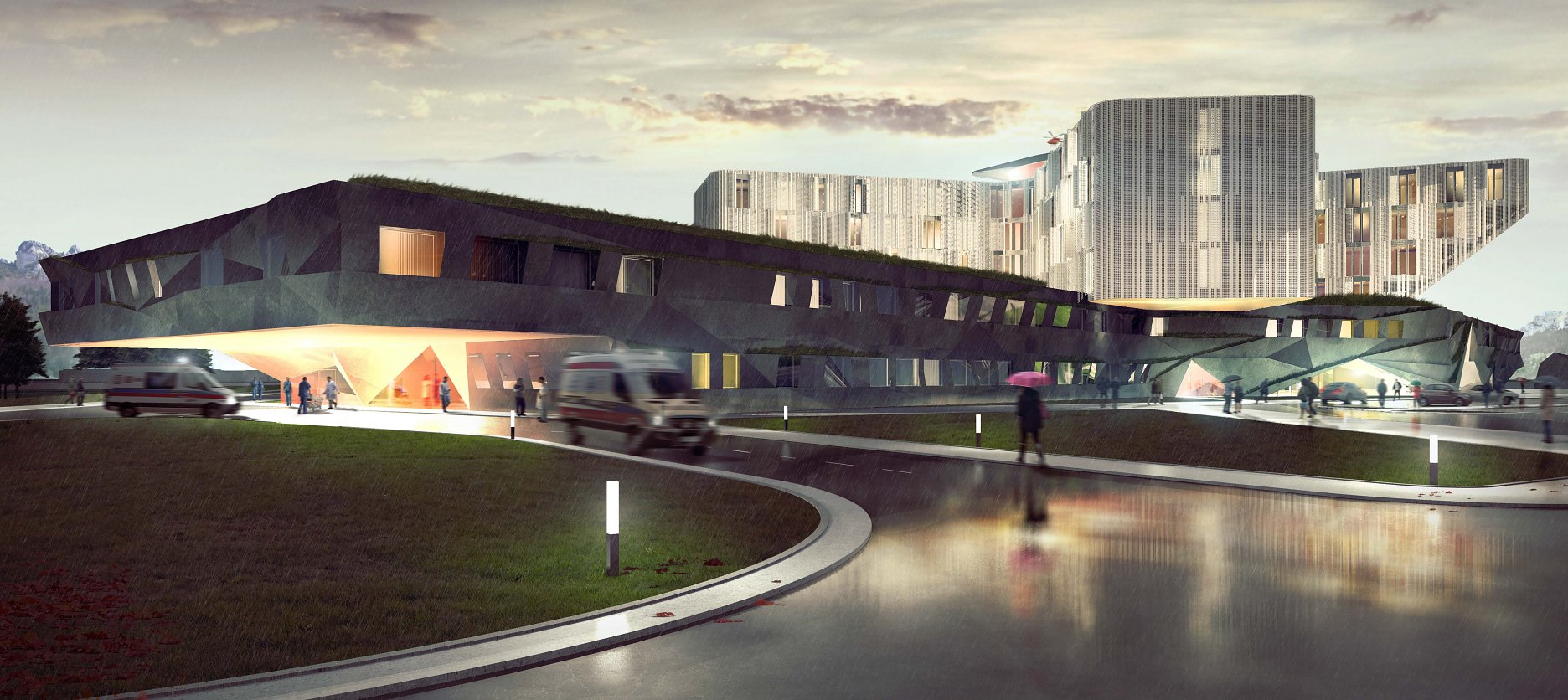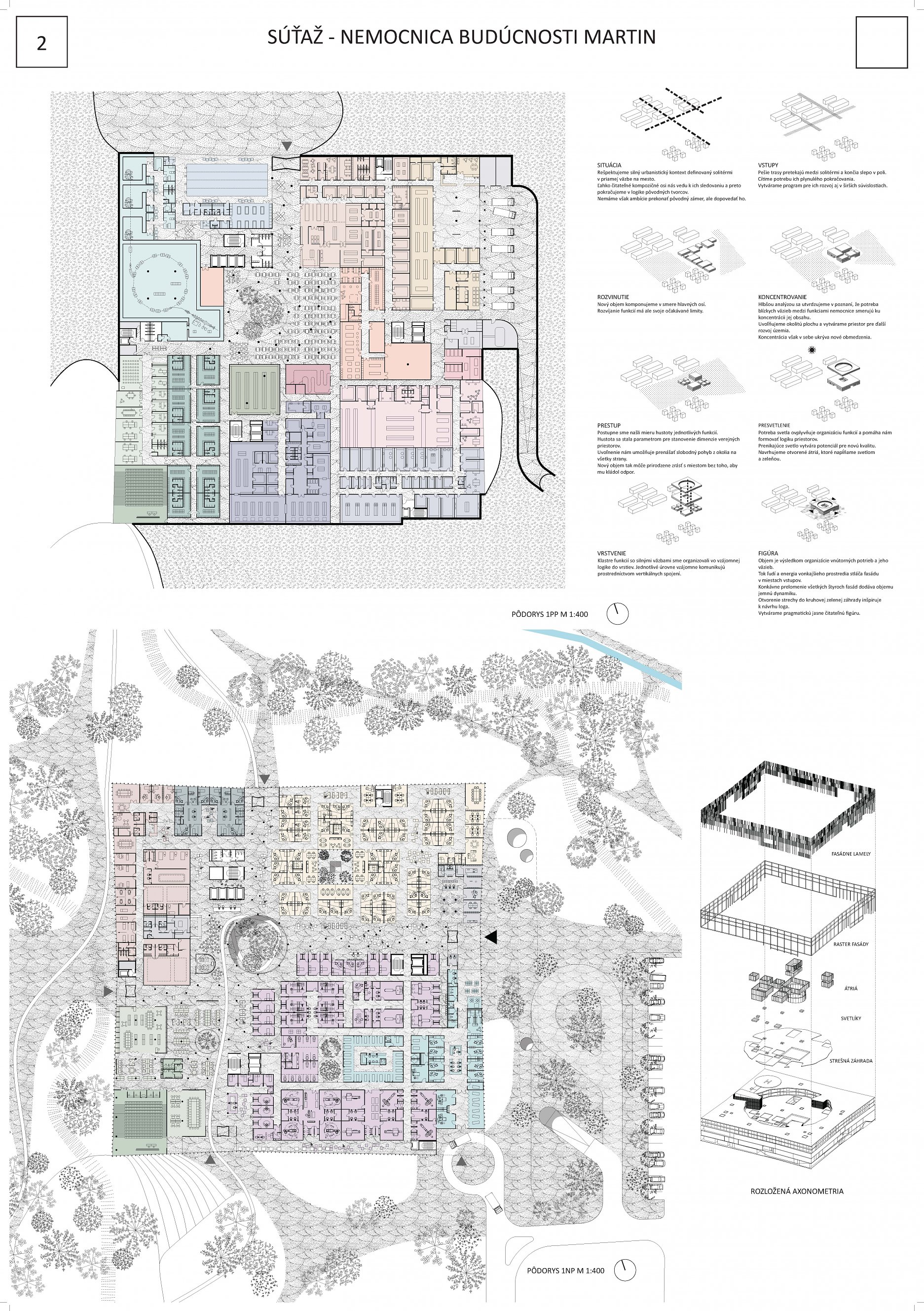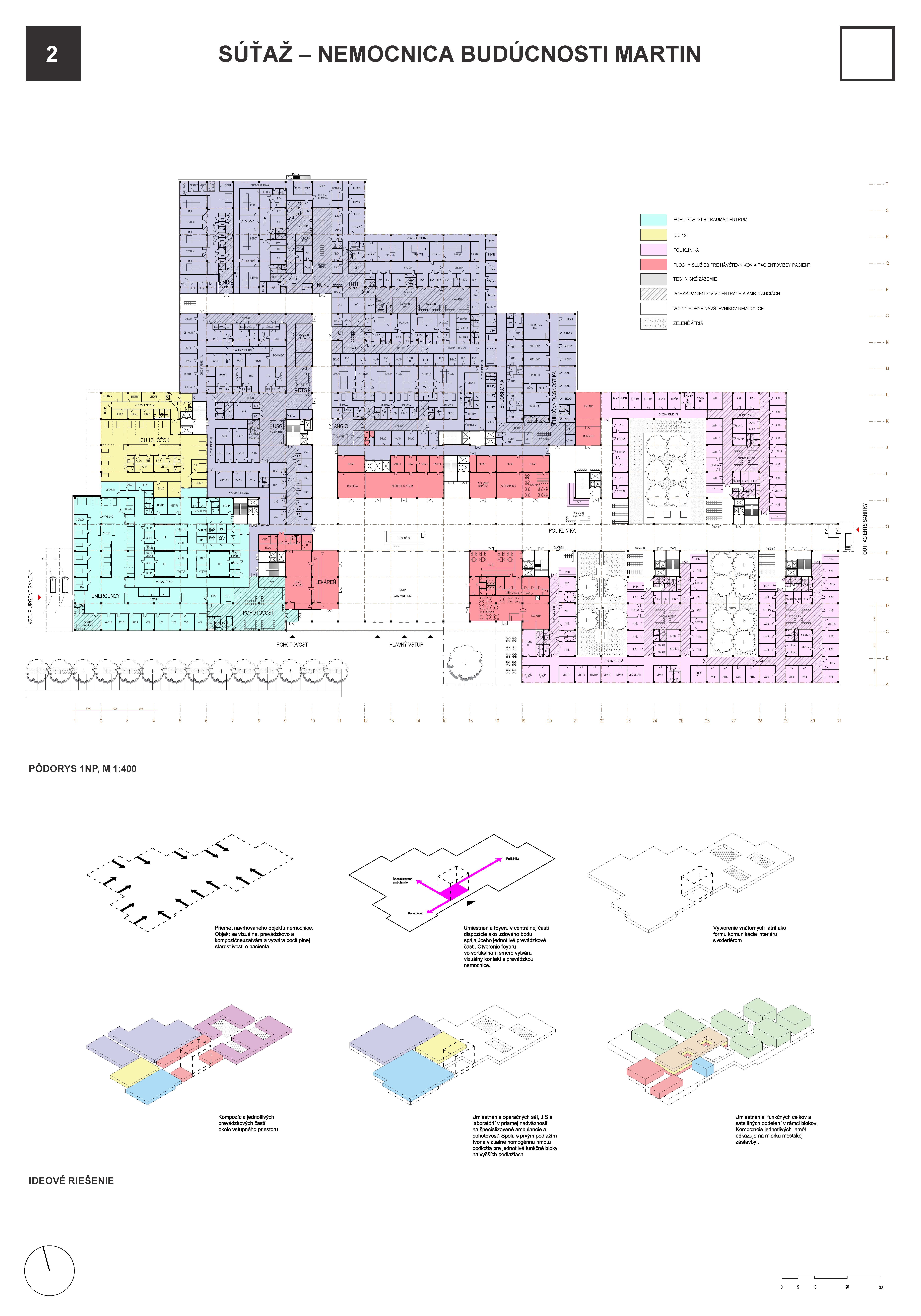 Návrh vhodným spôsobom nadväzuje na mestskú urbanistickú štruktúru a zkomponováva ju do vlastnej hmotovo-priestorovej architektonickej koncepcie. Zároveň citlivým spôsobom reaguje na prírodné prostredie. Táto previazanosť mestského a prírodného rámca je silným atribútom návrhu. Priestory a jednotlivé funkčné celky sú komponované logicky a dimenzované veľkoryso. Kvalita vnútorného prostredia je v rovnováhe s exteriérovým poňatím komplexu. Prevádzka nemocnice je navrhnutá prehľadne a účelne v súlade s požiadavkami na „nemocnicu budúcnosti“. Z hľadiska objemových a plošných kapacít ide o jeden z najnáročnejších návrhov. Modulárne riešenie konceptu umožňuje flexibilitu vnútorného usporiadania ako aj prípadnú redukciu alebo rozšírenie v budúcnosti bez zníženia kvality celkového riešenia.