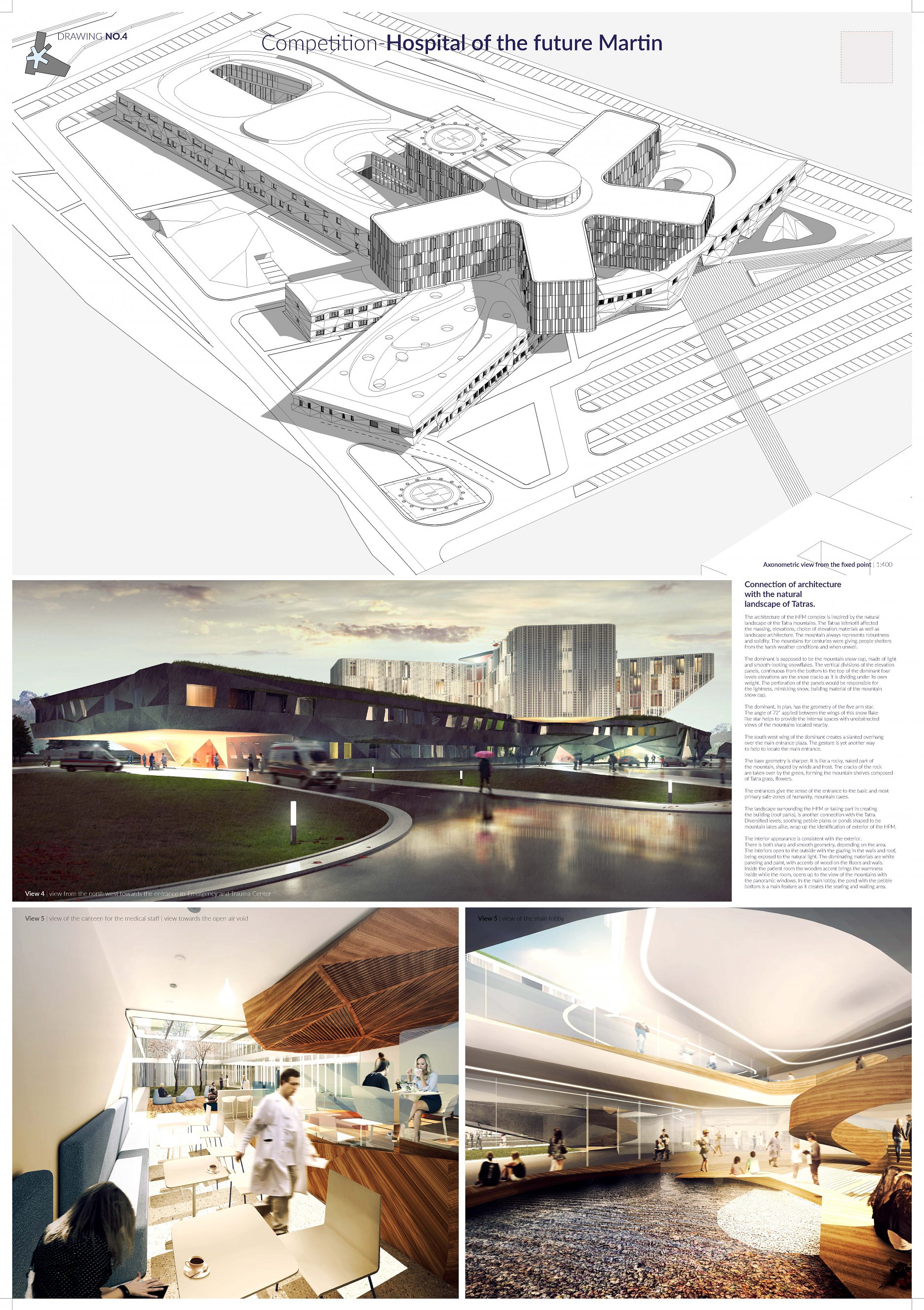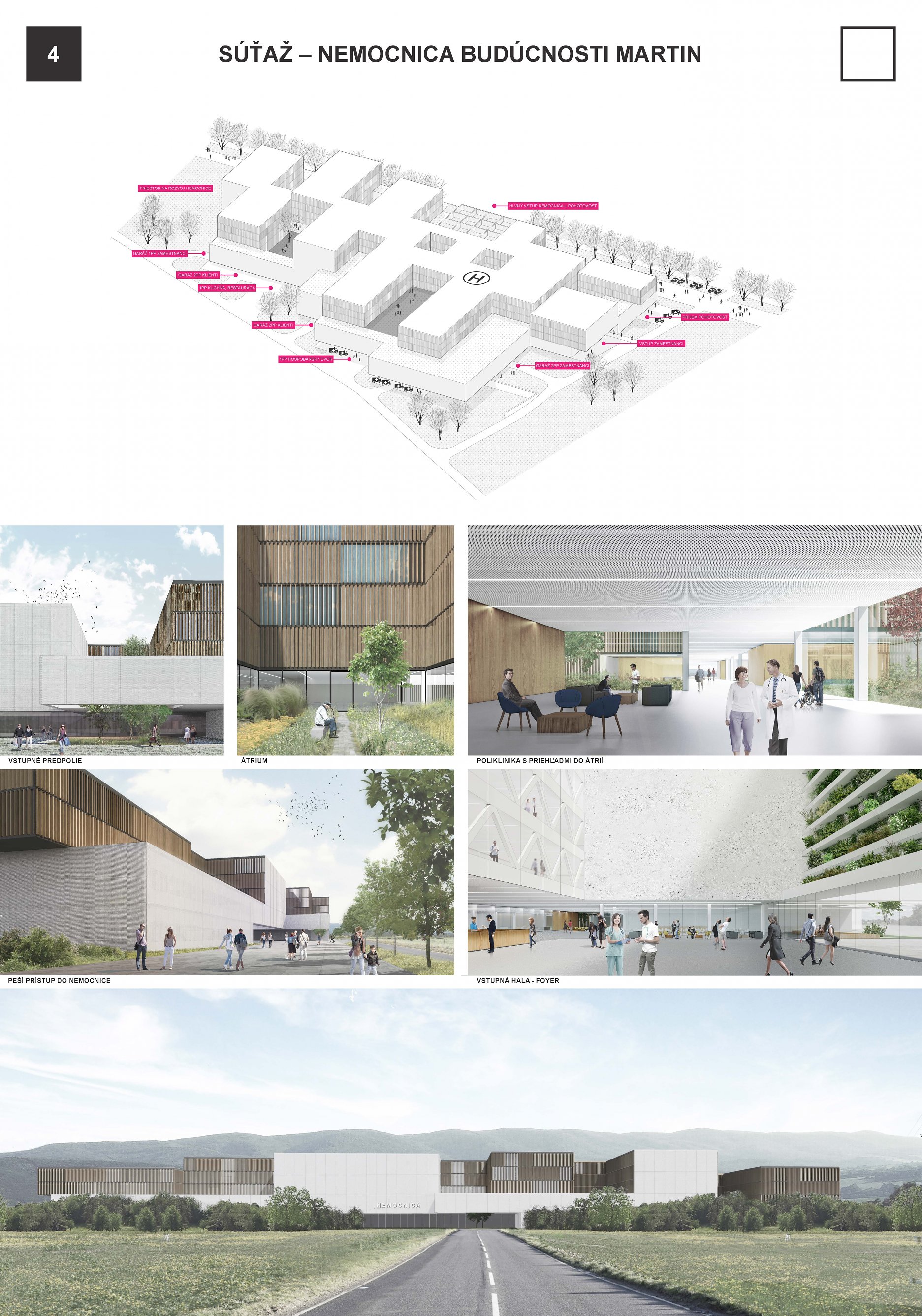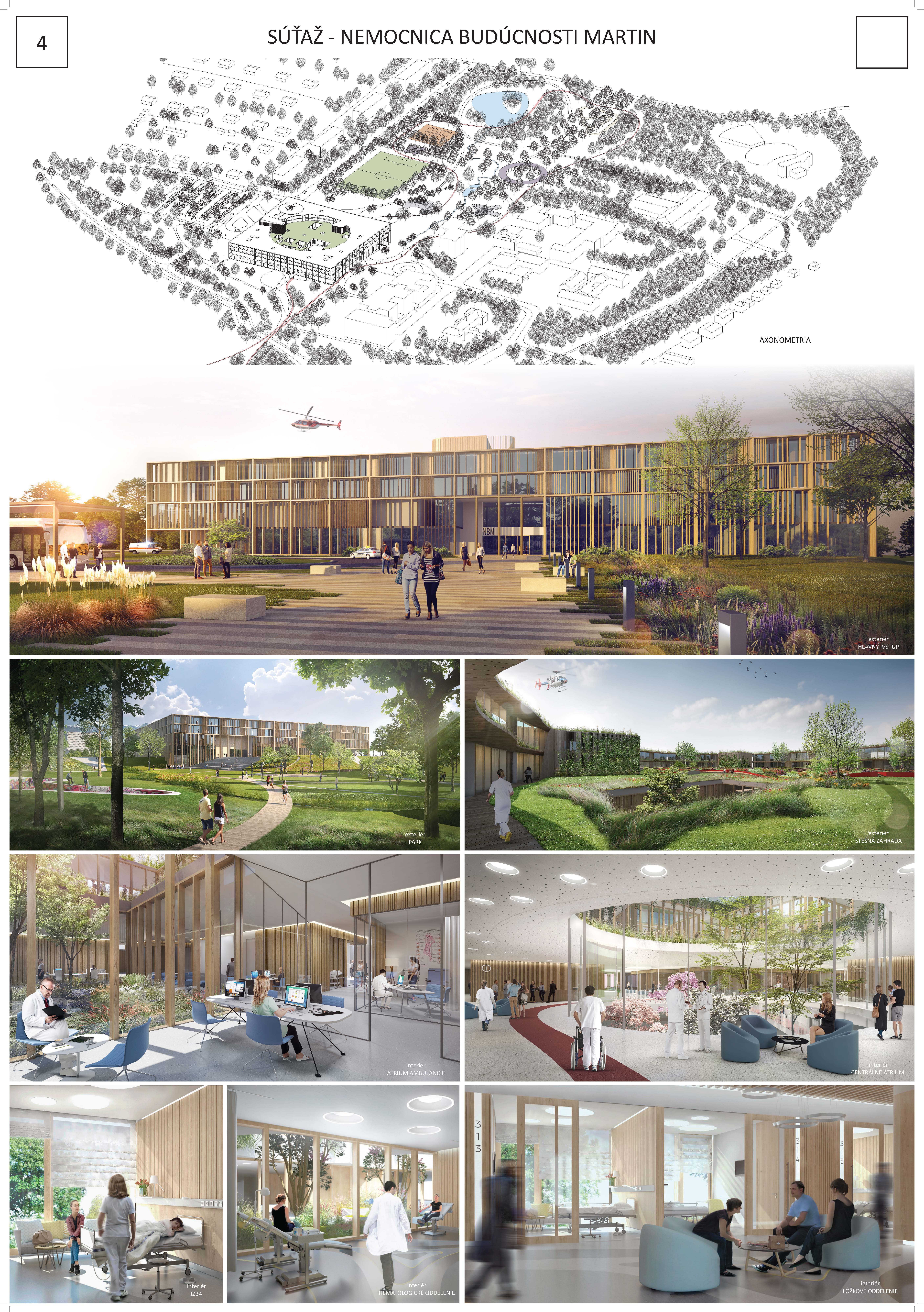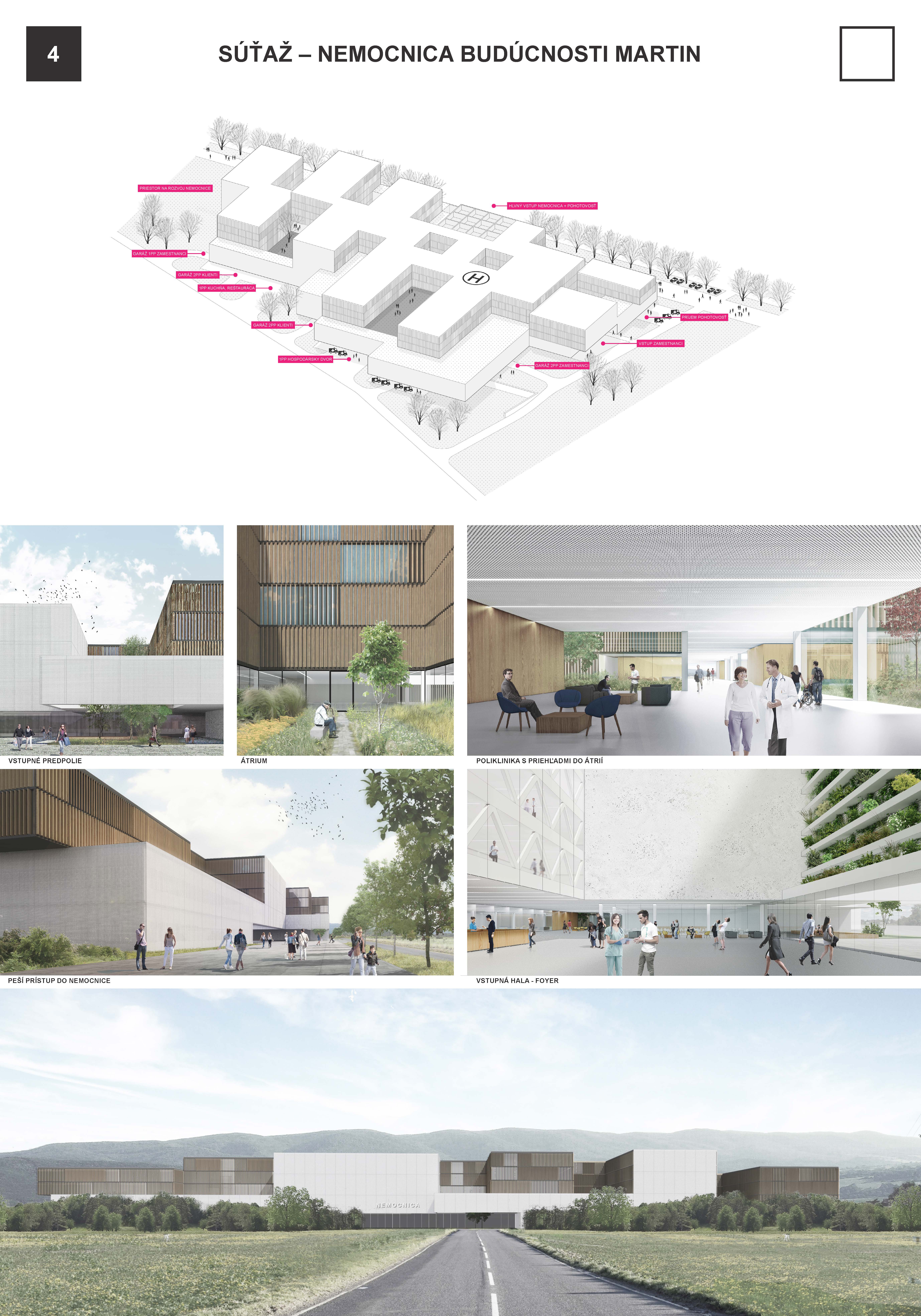 Porota většinou hlasů dospěla k rozhodnutí že návrh č. 4 nejlépe vystihl motto soutěže nemocnice budoucnosti. Představil architektonickou vizi nemocnice laskavé k člověku a jeho vnímaní. Z perspektivy urbanistického kontextu vyzýváním architektonických archetypů důstojně doplňuje martinskou akropoli. Z perspektivy vnímaní architektury se snaží vyhnout institucionální pompě a nabubřelosti zachováním civilního měřítka. Stejnou kvalitou jakou se staví k centru města se staví k jeho rozvojovým částem i k rekreačnímu krajinnému prvku „Údolí lásky“. Návrh je přívětiví ke všem příchozím, přijímá je ve svém středu ať už přicházejí z jakékoliv strany. Koncept je silný také díky jasné, srozumitelné formě čtverce s kruhovým vnitřním mikrosvětem. Příjemné je že se tak neděje na úkor funkčnosti, provozovatelnosti a udržitelnosti. Naopak kruhové uspořádaní chodeb lůžkových pater bylo ceněno jako rafinované, inovativní vypořádaní se s kafkovskou anonymitou nekonečných chodeb. Díky tomuto uspořádaní se také jednotlivá specializovaná oddělení neseparují ale naopak se spojují do faktického i pomyslného kruhu synergické péče. Velmi sympatickou na návrhu byla také práce s materiály, barevností, světelnými atmosférami a vizuálním propojením. Přes výhrady k řešení separovaného parkingu, nepropojení vnitro areálově různých směrů dopravy, potřeby posílení provozního zázemí lůžkových pater a otázek možností dalšího rozvoje a růstu, porota vidí návrh jako perspektivní pro další rozpracování. Takováto nemocnice budoucnosti bude adekvátním a důstojným sídlem pro medicínu v jejímž středu zájmu stojí člověk.