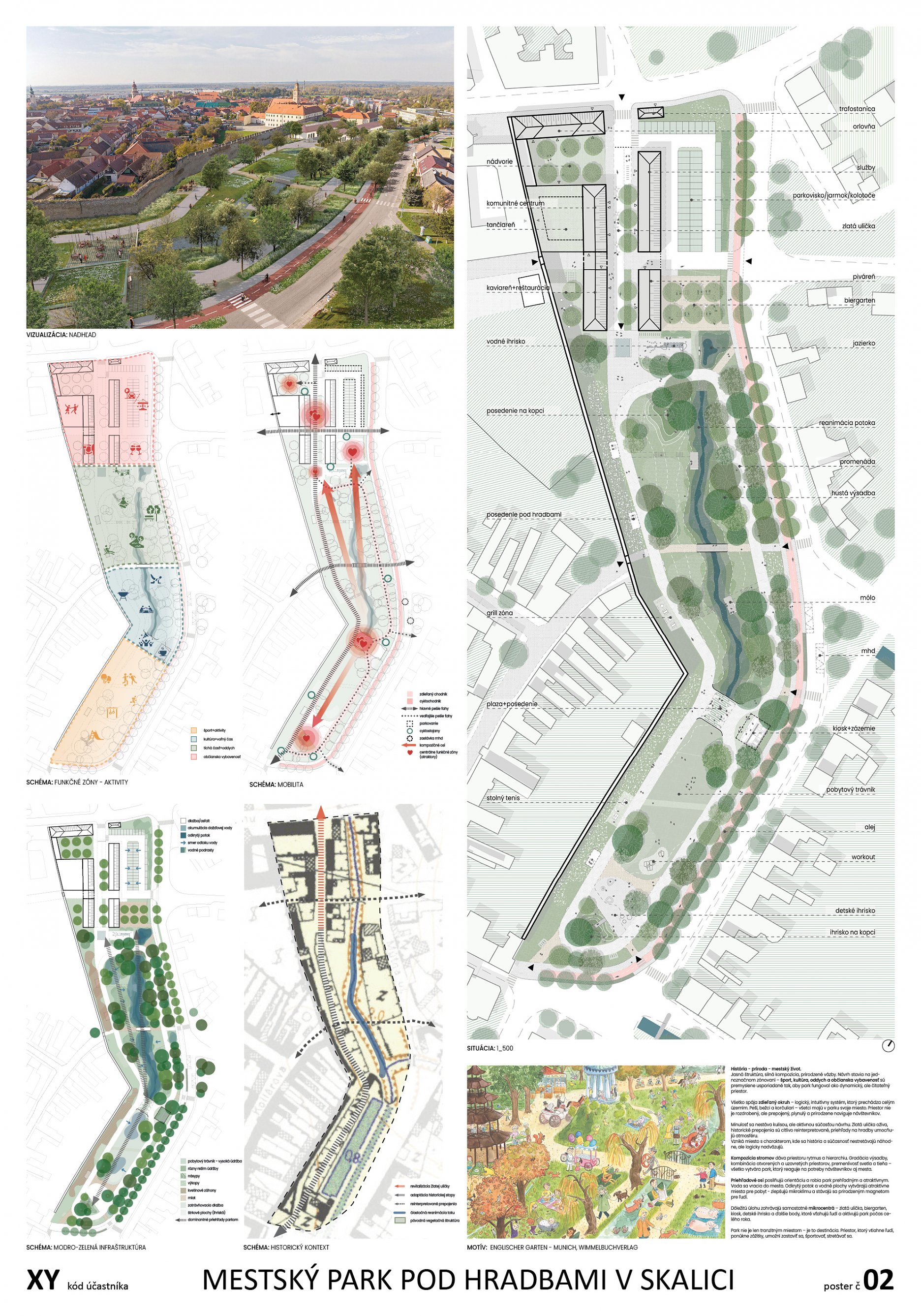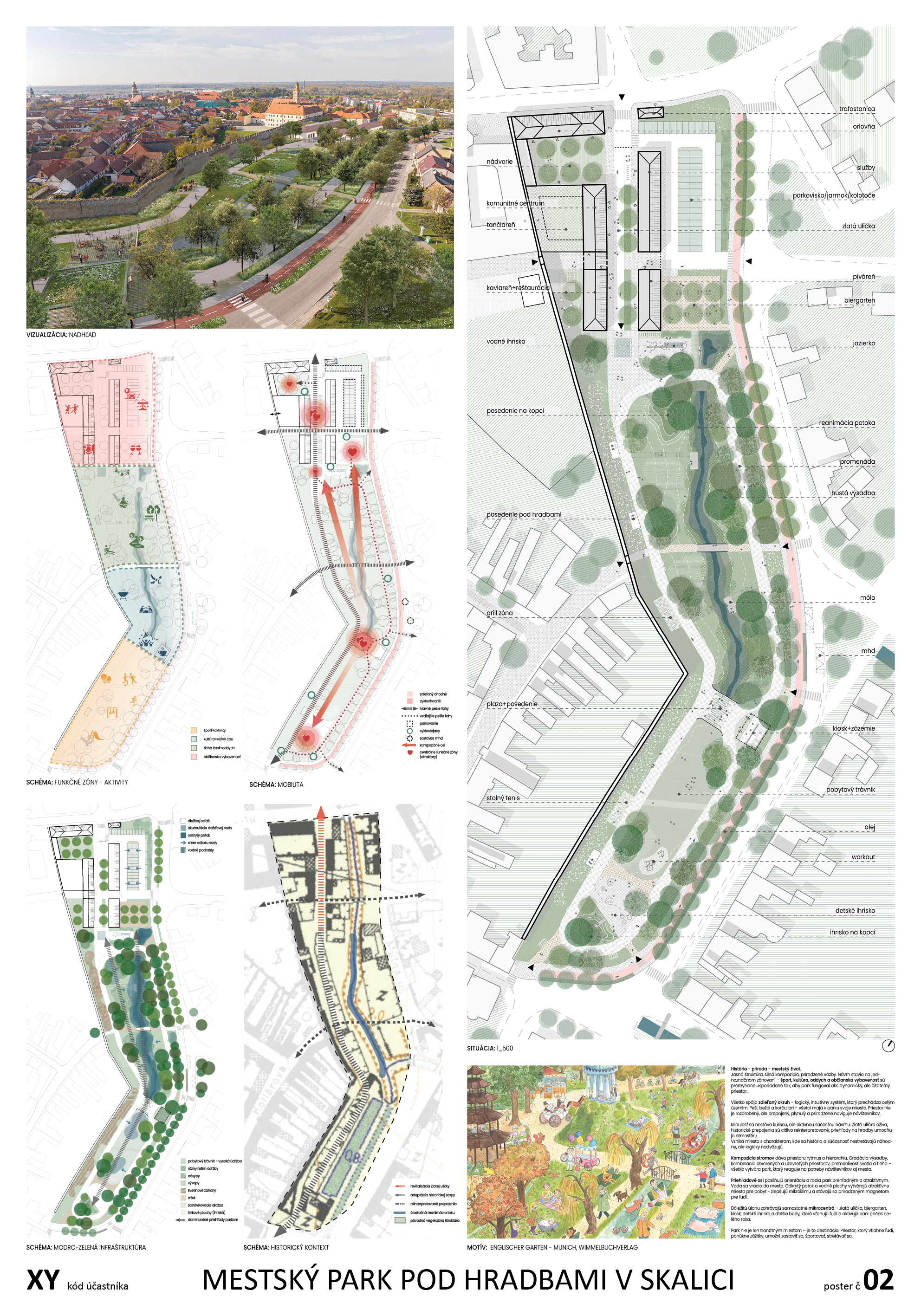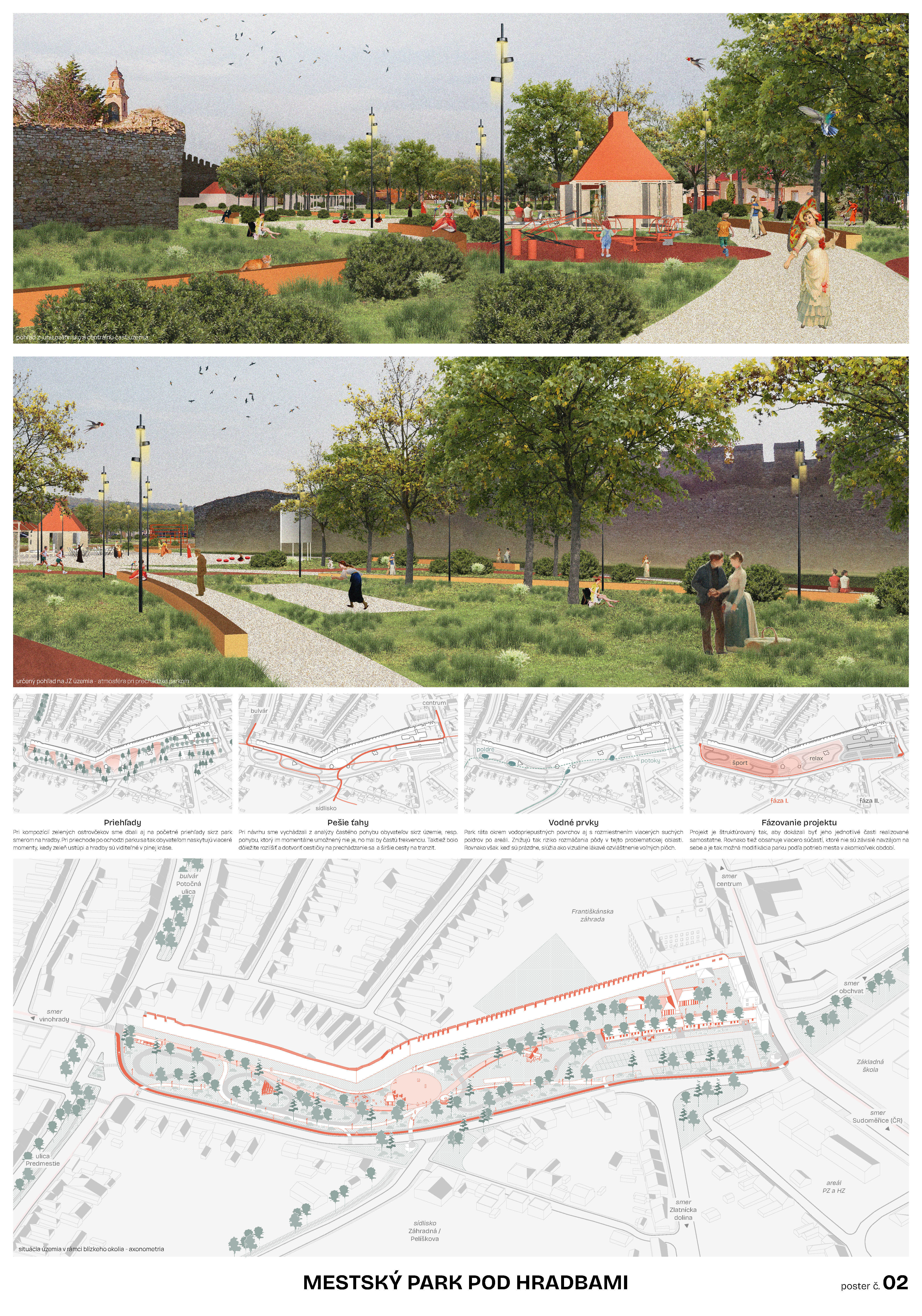 Porota ocenila základnú myšlienku „park pod hradbami“ a skutočnosť, že návrh necháva hradby vyniknúť nad bylinným porastom a nasvietením. Kompozičné riešenie jasne oddeľuje spoločenskú a parkovú zónu; parková časť je podporená brodidlom evokujúcim vodnú priekopu a vsakovacími depresiami na zachytávanie zrážok. Spoločenskú plochu spestruje edukačná záhrada – reminiscencia na kláštorný areál – ktorej však podľa poroty chýba súčasné stvárnenie. Predimenzované parkovisko bez zelene pôsobí neprimerane. Park je dostupný viacerými vedľajšími vstupmi (odporúčaný je najmä vstup z Kollárovej ulice), avšak návrh pracuje s minimom drevín: stromové výsadby sa obmedzujú na jednoradové aleje pri Mýtnej a Jednoradovej ulici a niekoľko solitérov, takže v horúcich obdobiach nebude k dispozícii dostatočný tieň.