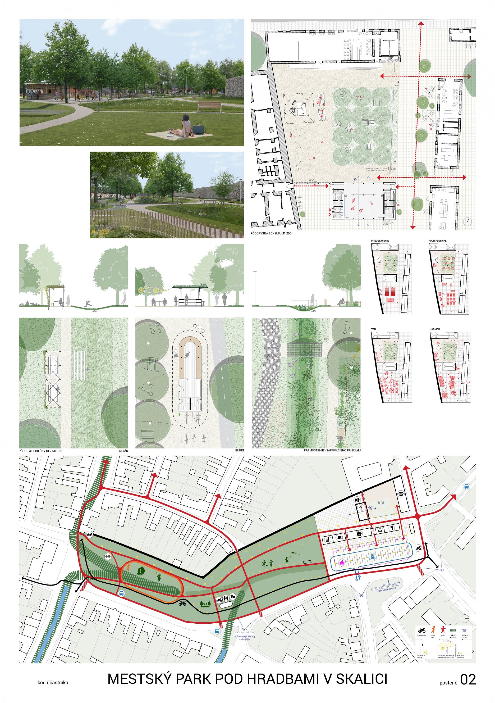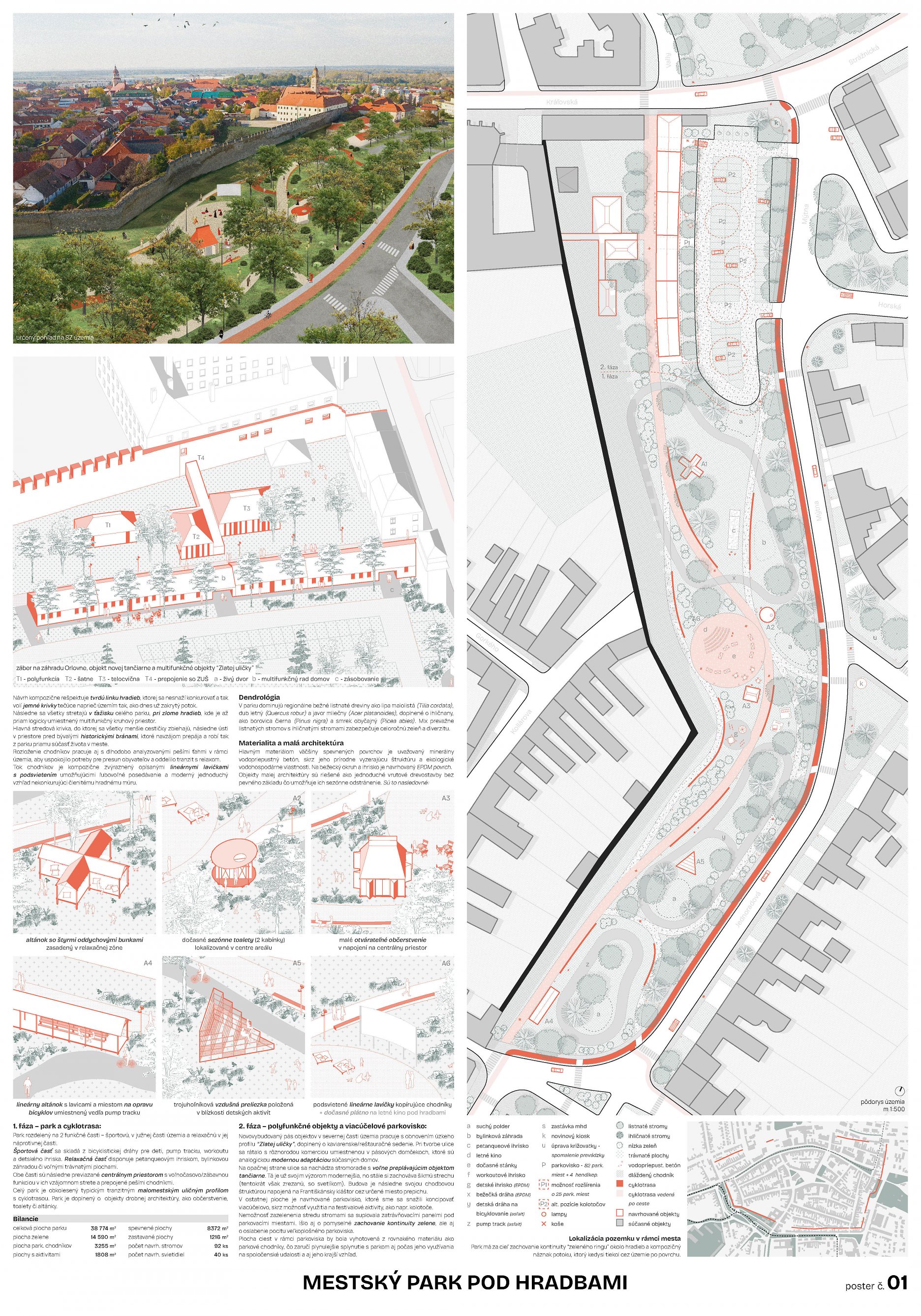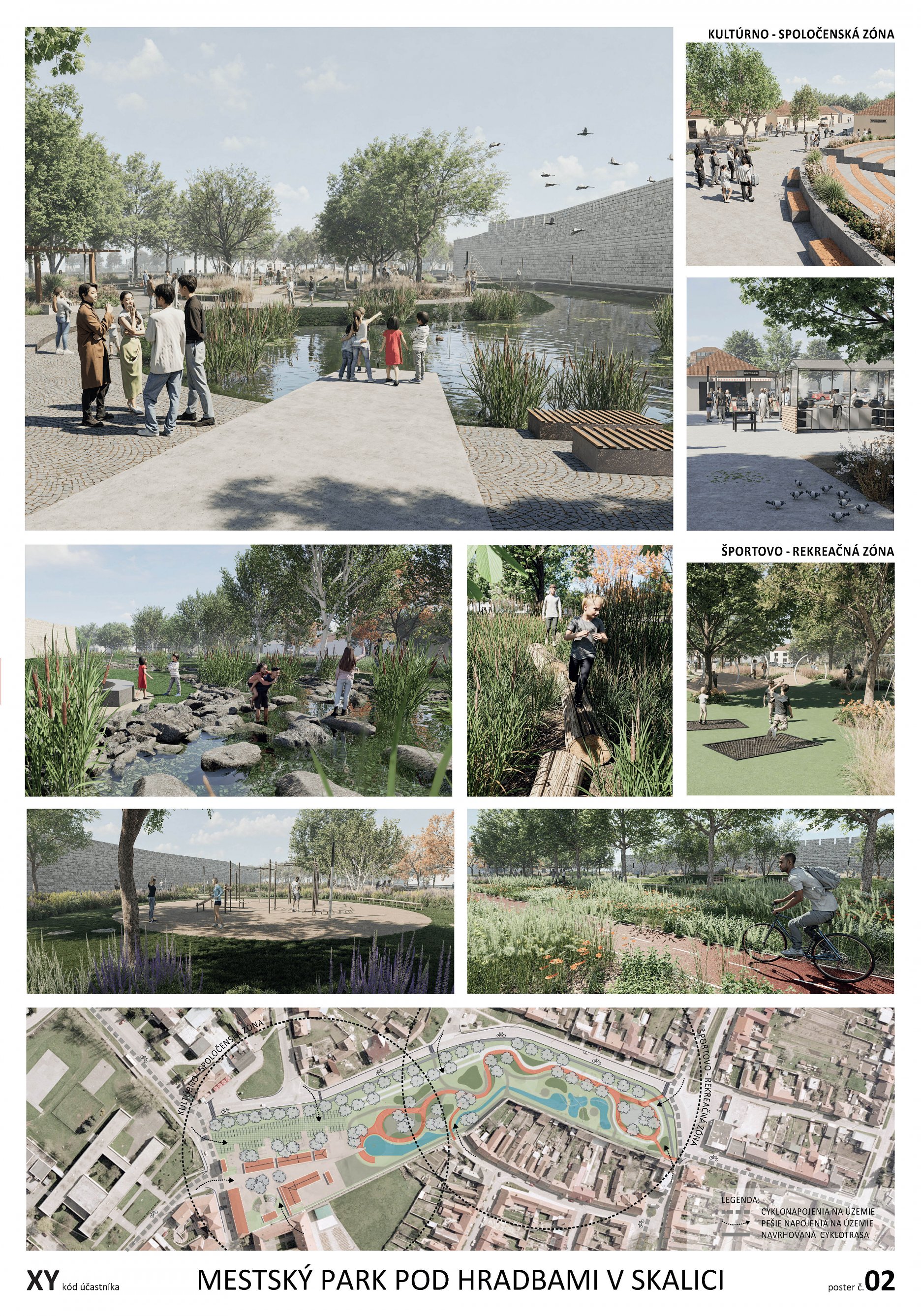 Porota ocenila základnú myšlienku „park pod hradbami“ a skutočnosť, že návrh necháva hradby vyniknúť nad bylinným porastom a nasvietením. Kompozičné riešenie jasne oddeľuje spoločenskú a parkovú zónu; parková časť je podporená brodidlom evokujúcim vodnú priekopu a vsakovacími depresiami na zachytávanie zrážok. Spoločenskú plochu spestruje edukačná záhrada – reminiscencia na kláštorný areál – ktorej však podľa poroty chýba súčasné stvárnenie. Predimenzované parkovisko bez zelene pôsobí neprimerane. Park je dostupný viacerými vedľajšími vstupmi (odporúčaný je najmä vstup z Kollárovej ulice), avšak návrh pracuje s minimom drevín: stromové výsadby sa obmedzujú na jednoradové aleje pri Mýtnej a Jednoradovej ulici a niekoľko solitérov, takže v horúcich obdobiach nebude k dispozícii dostatočný tieň.