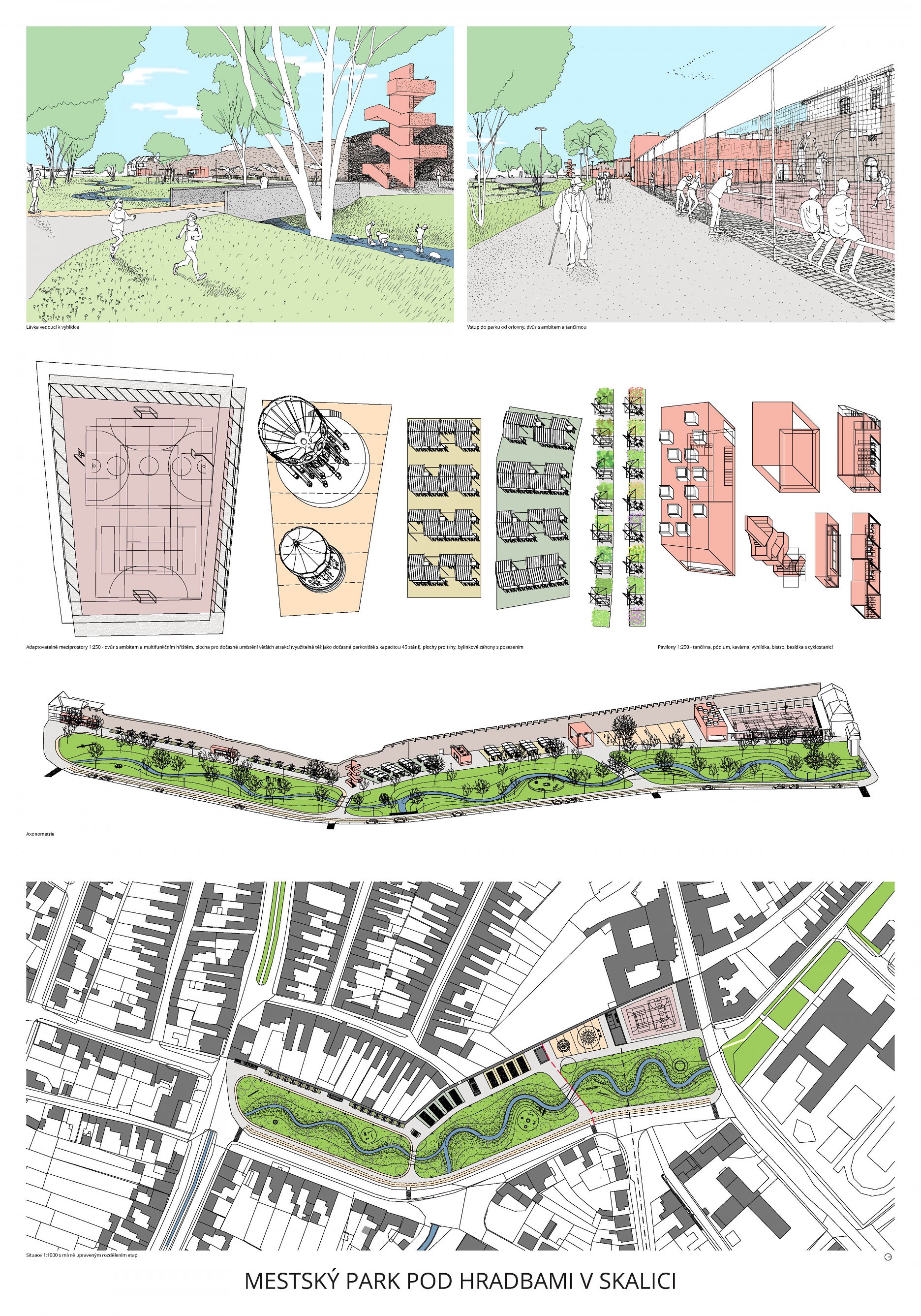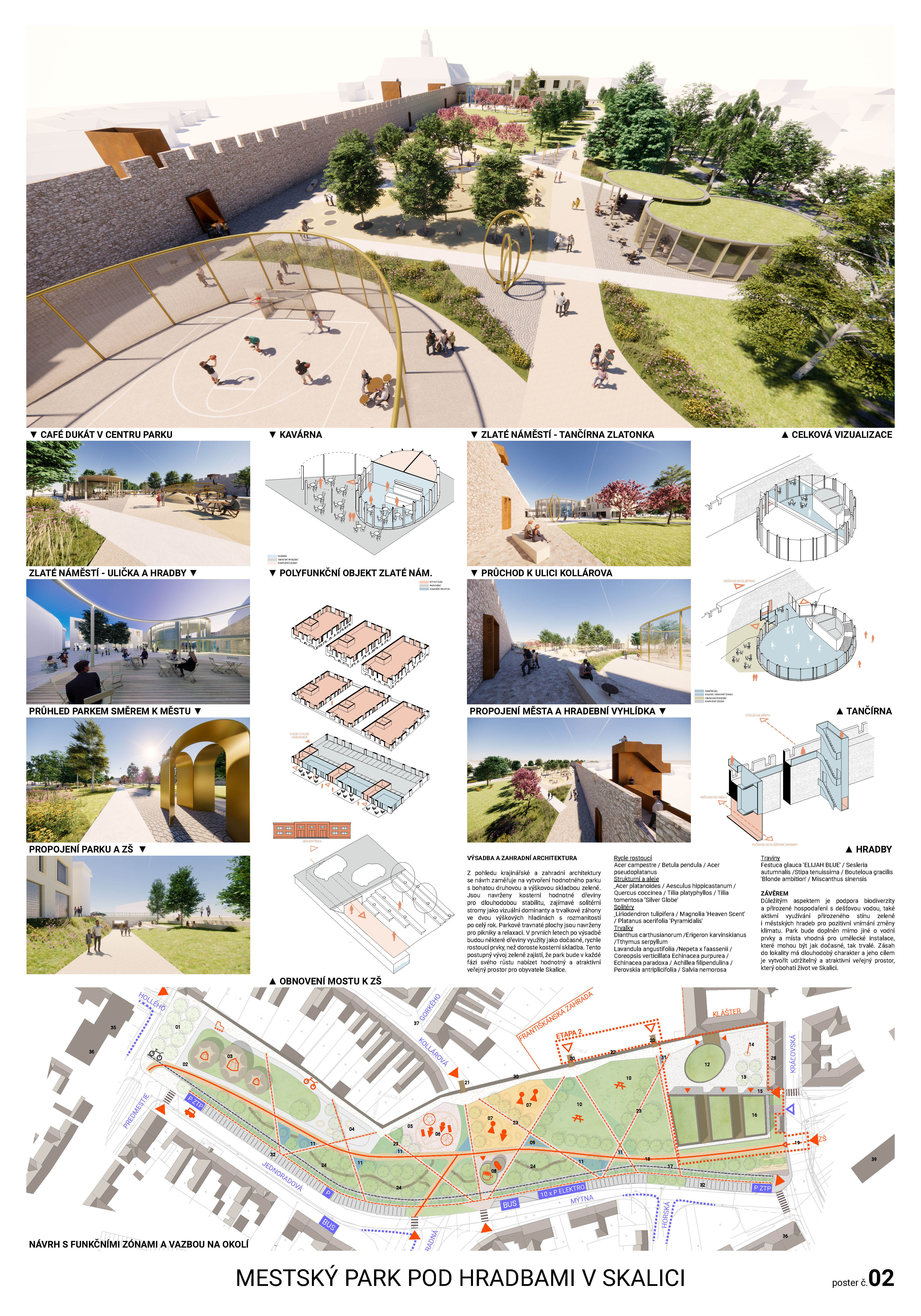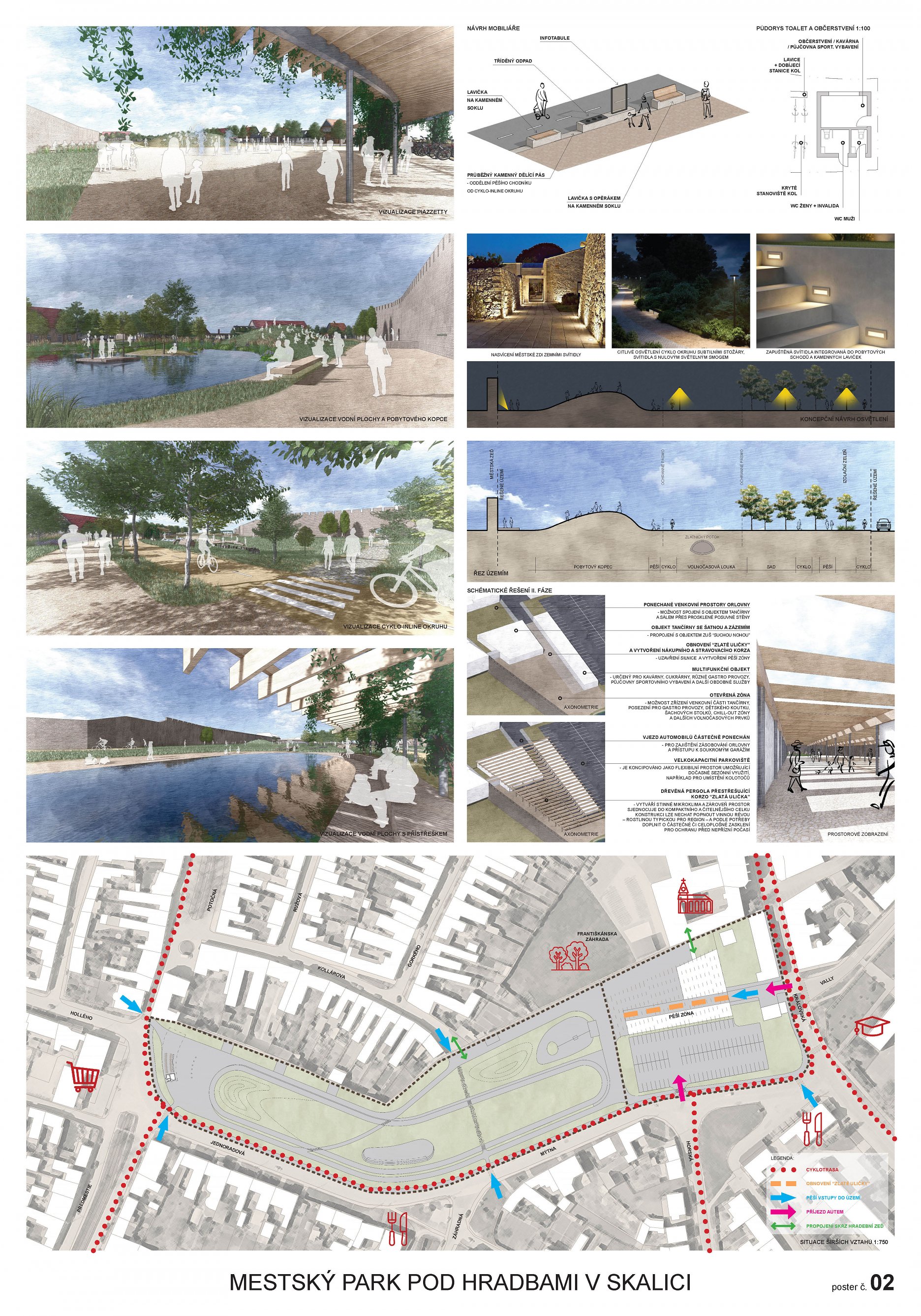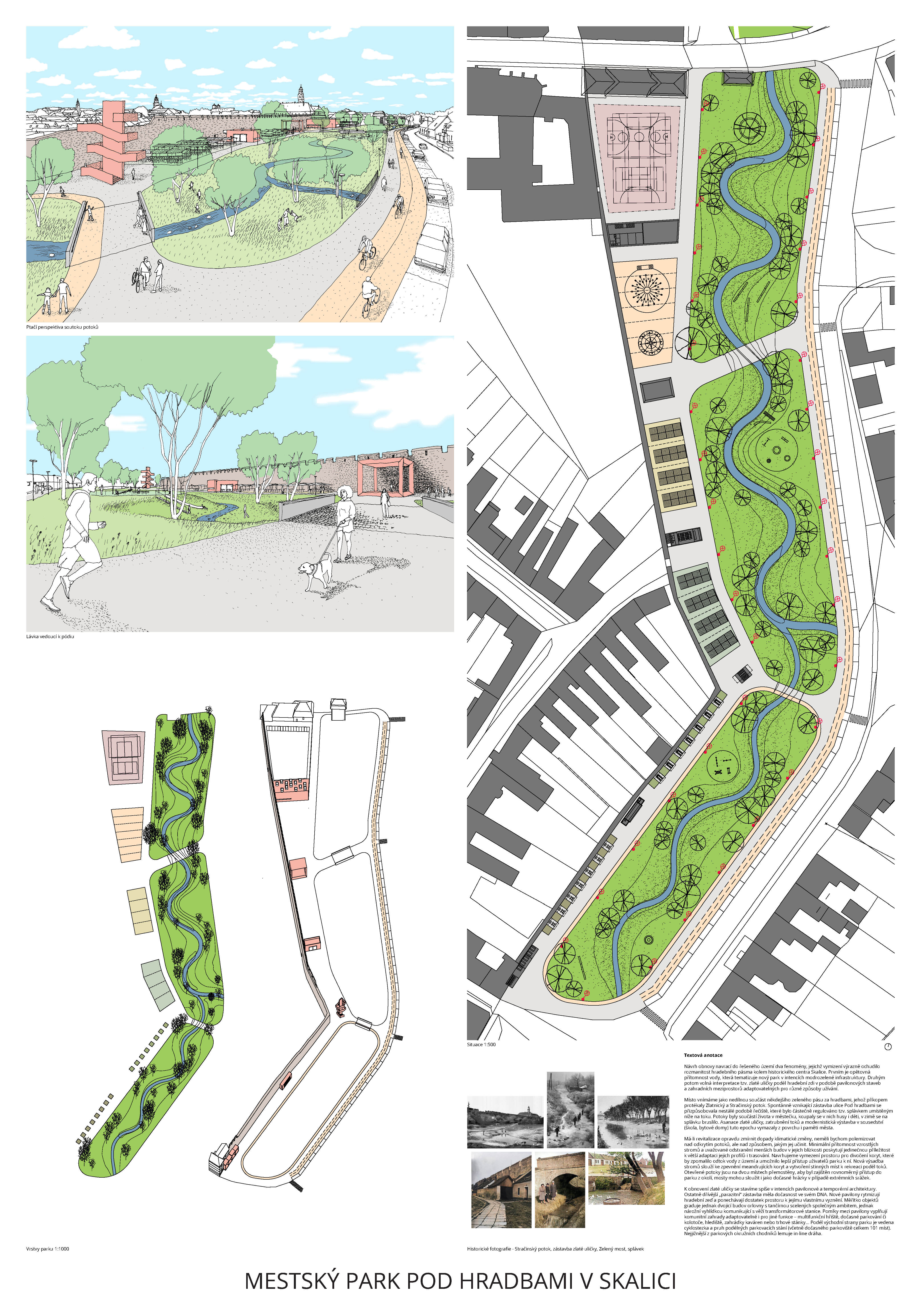 Výchozím principem návrhu je dôsledný rešpekt k historickej hradbe, ktorá je hlavným nositeľom genia loci parku; hradba sa preto nikde neobestavuje. Tento princíp však autori čiastočne porušujú navrhovanou stromovou zeleňou v ochrannom pásme hradby v južnej časti. Navrhované prierazy hradby v miestach považovaných za urbanisticky nevyhnutné sú logické, avšak priechod pri ulici Kollárovej nepokračuje k novému „hlavnému“ vstupu do parku a prepojenie so ZUŠ chýba úplne. Urbanistické a architektonické riešenie „Zlatej uličky“ kombinuje nostalgiu so súdobým výrazom, no pôsobí nepresvedčivo; štítová poloha novostavieb popiera tradičnú parceláciu skalického jadra. Zásadným prvkom návrhu je dvojpodlažná podzemná garáž – veľkorysé, ale nákladné riešenie s ťažko koordinovateľnou etapizáciou. Porota oceňuje snahu o prehľadné väzby a starostlivo riešené vstupy (na severe „Zlatou uličkou“, v zlome parku nový hlavný vstup).