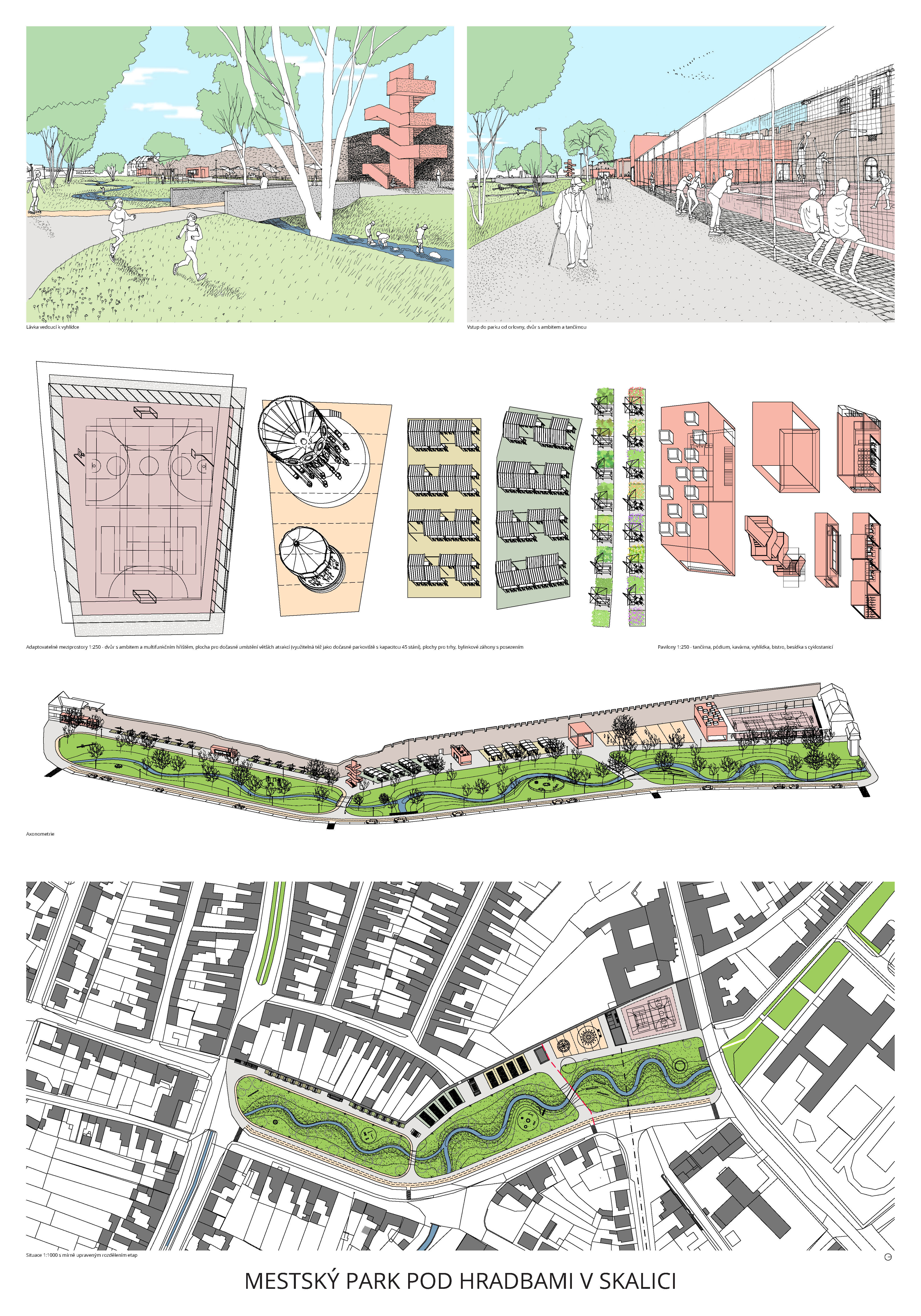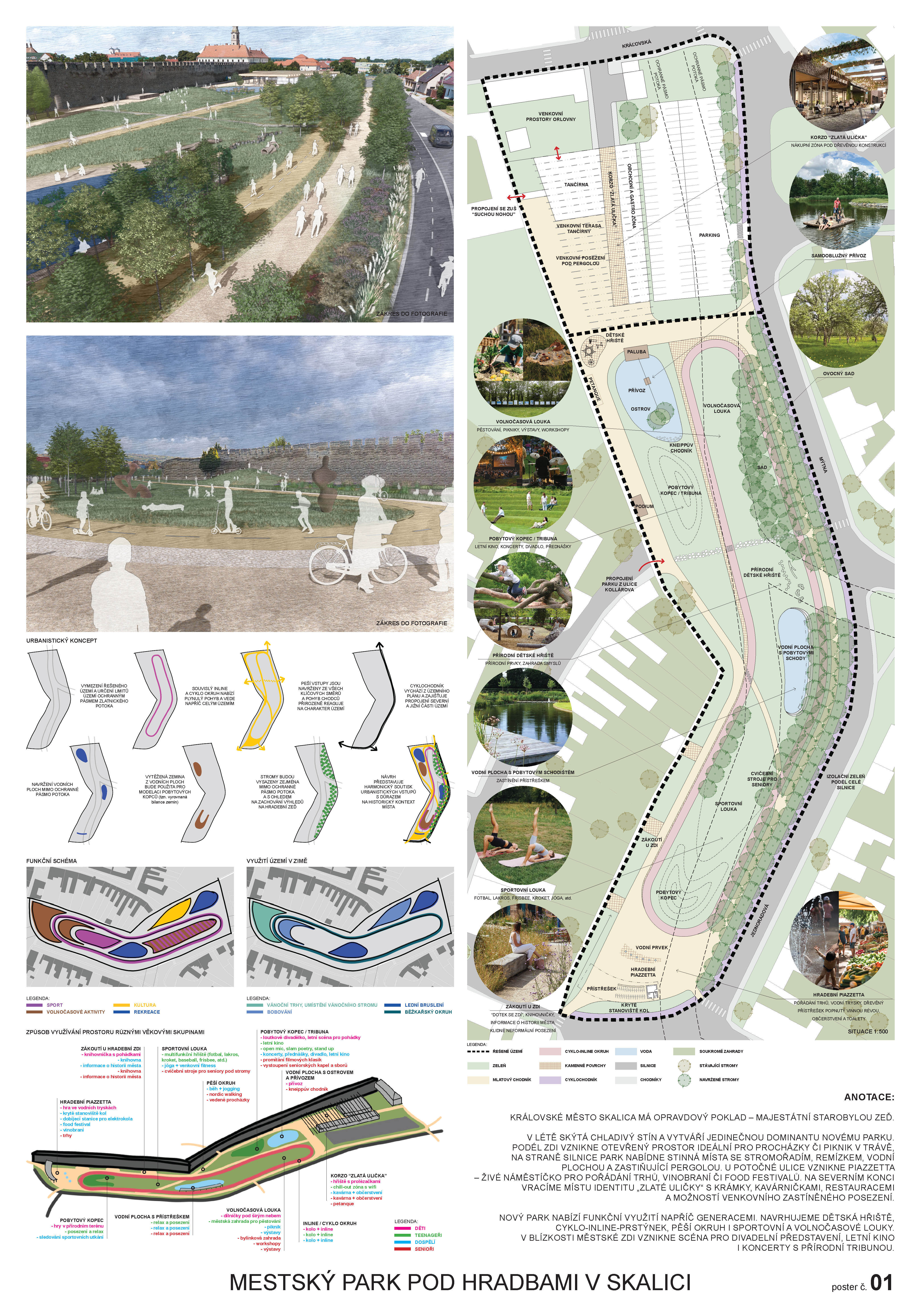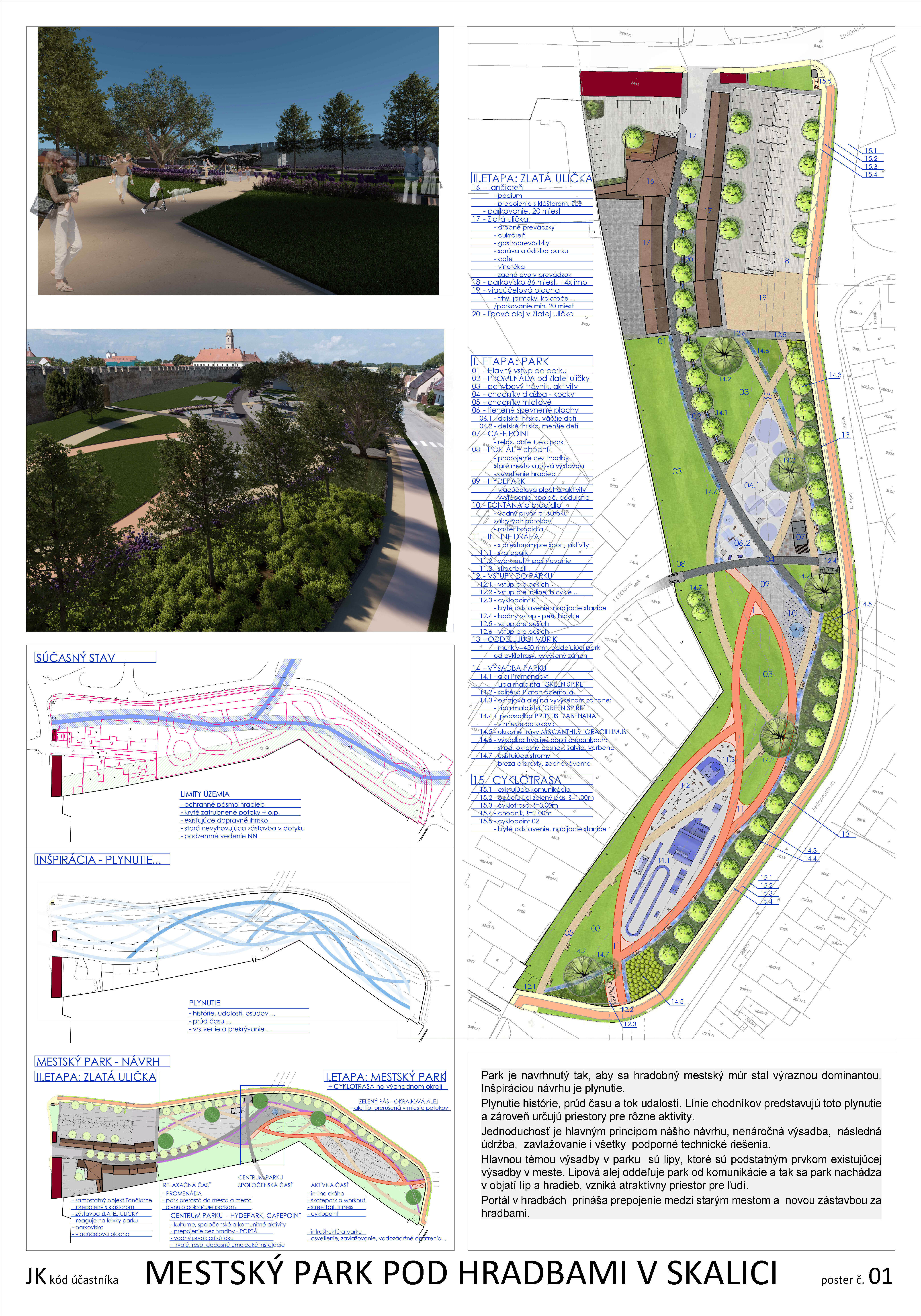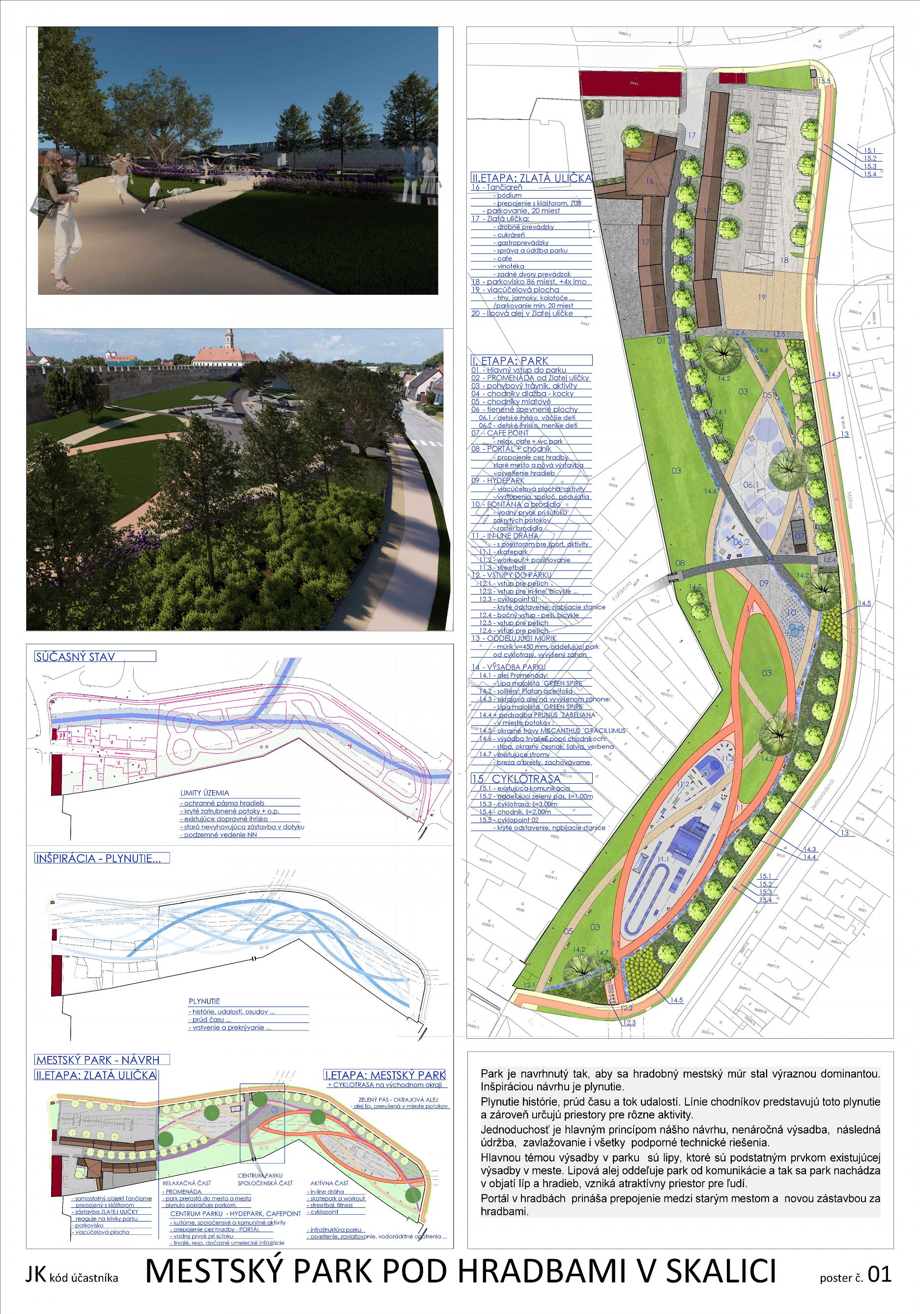 Výchozím principem návrhu je dôsledný rešpekt k historickej hradbe, ktorá je hlavným nositeľom genia loci parku; hradba sa preto nikde neobestavuje. Tento princíp však autori čiastočne porušujú navrhovanou stromovou zeleňou v ochrannom pásme hradby v južnej časti. Navrhované prierazy hradby v miestach považovaných za urbanisticky nevyhnutné sú logické, avšak priechod pri ulici Kollárovej nepokračuje k novému „hlavnému“ vstupu do parku a prepojenie so ZUŠ chýba úplne. Urbanistické a architektonické riešenie „Zlatej uličky“ kombinuje nostalgiu so súdobým výrazom, no pôsobí nepresvedčivo; štítová poloha novostavieb popiera tradičnú parceláciu skalického jadra. Zásadným prvkom návrhu je dvojpodlažná podzemná garáž – veľkorysé, ale nákladné riešenie s ťažko koordinovateľnou etapizáciou. Porota oceňuje snahu o prehľadné väzby a starostlivo riešené vstupy (na severe „Zlatou uličkou“, v zlome parku nový hlavný vstup).