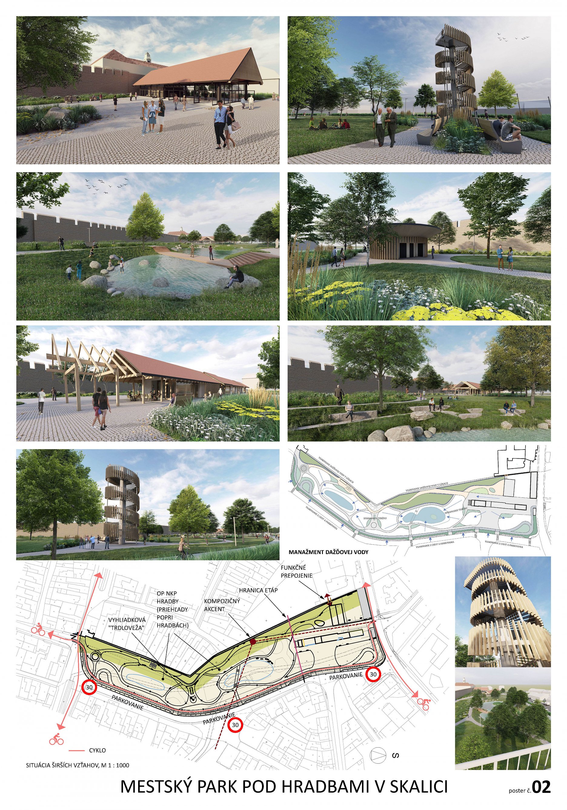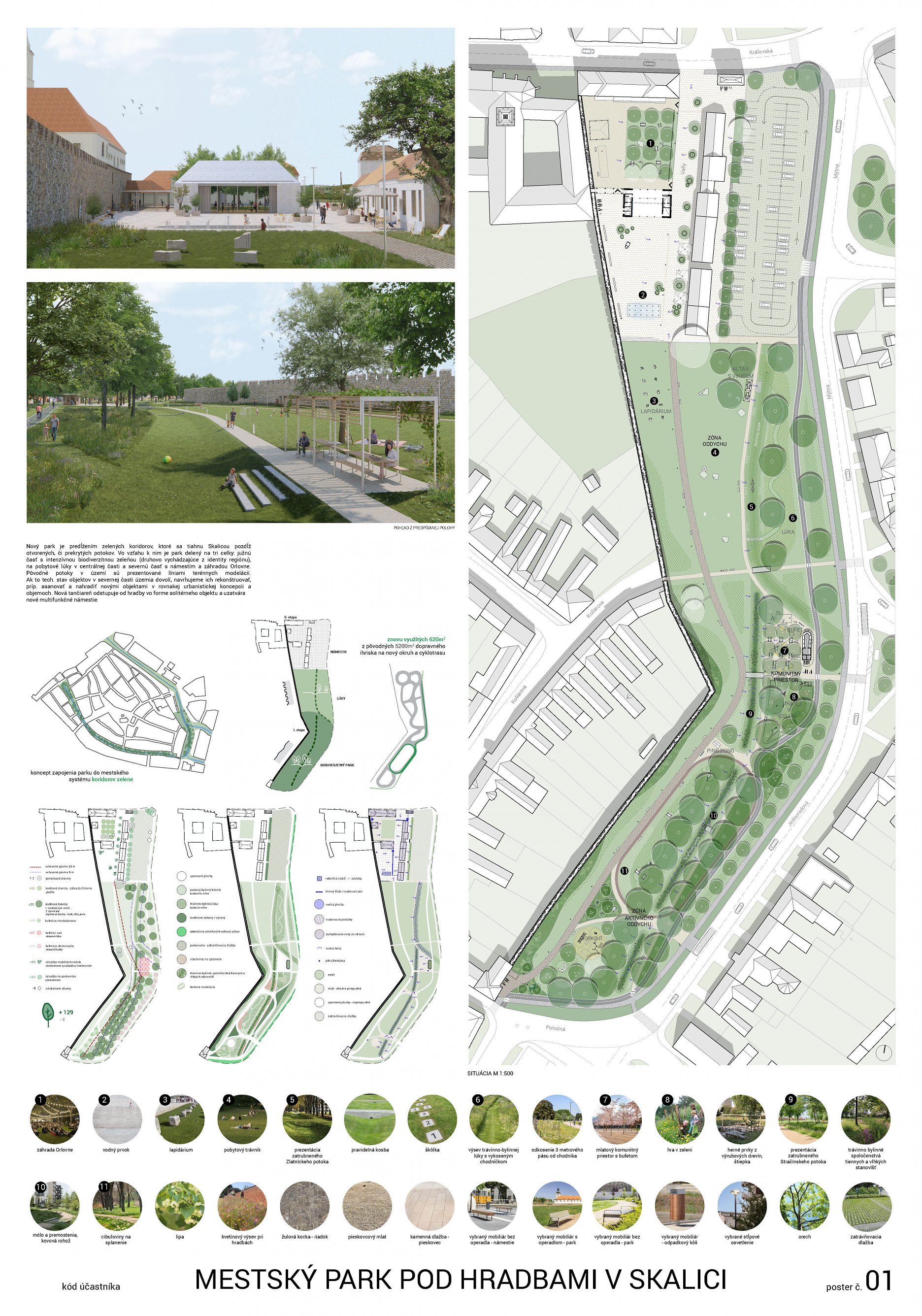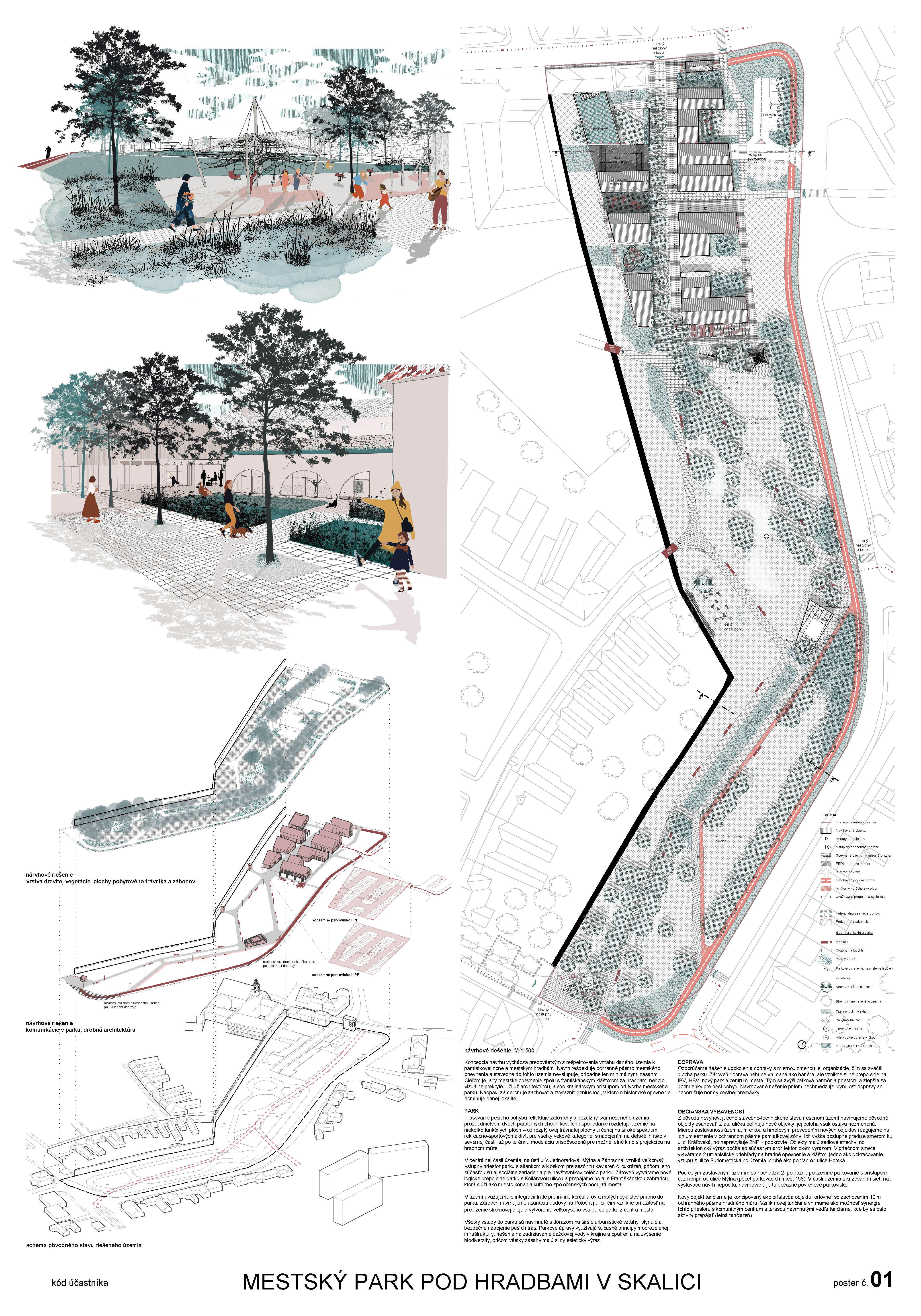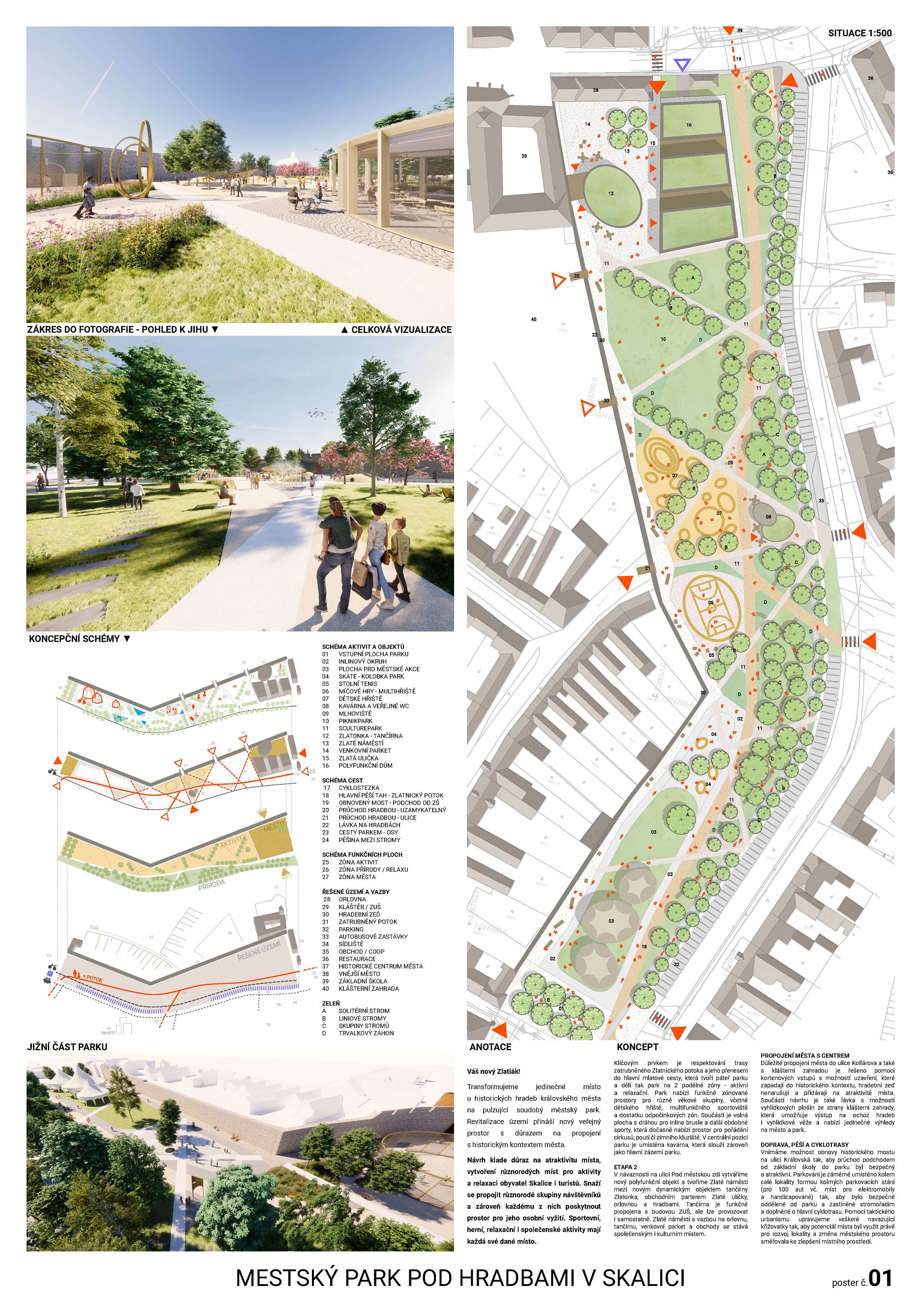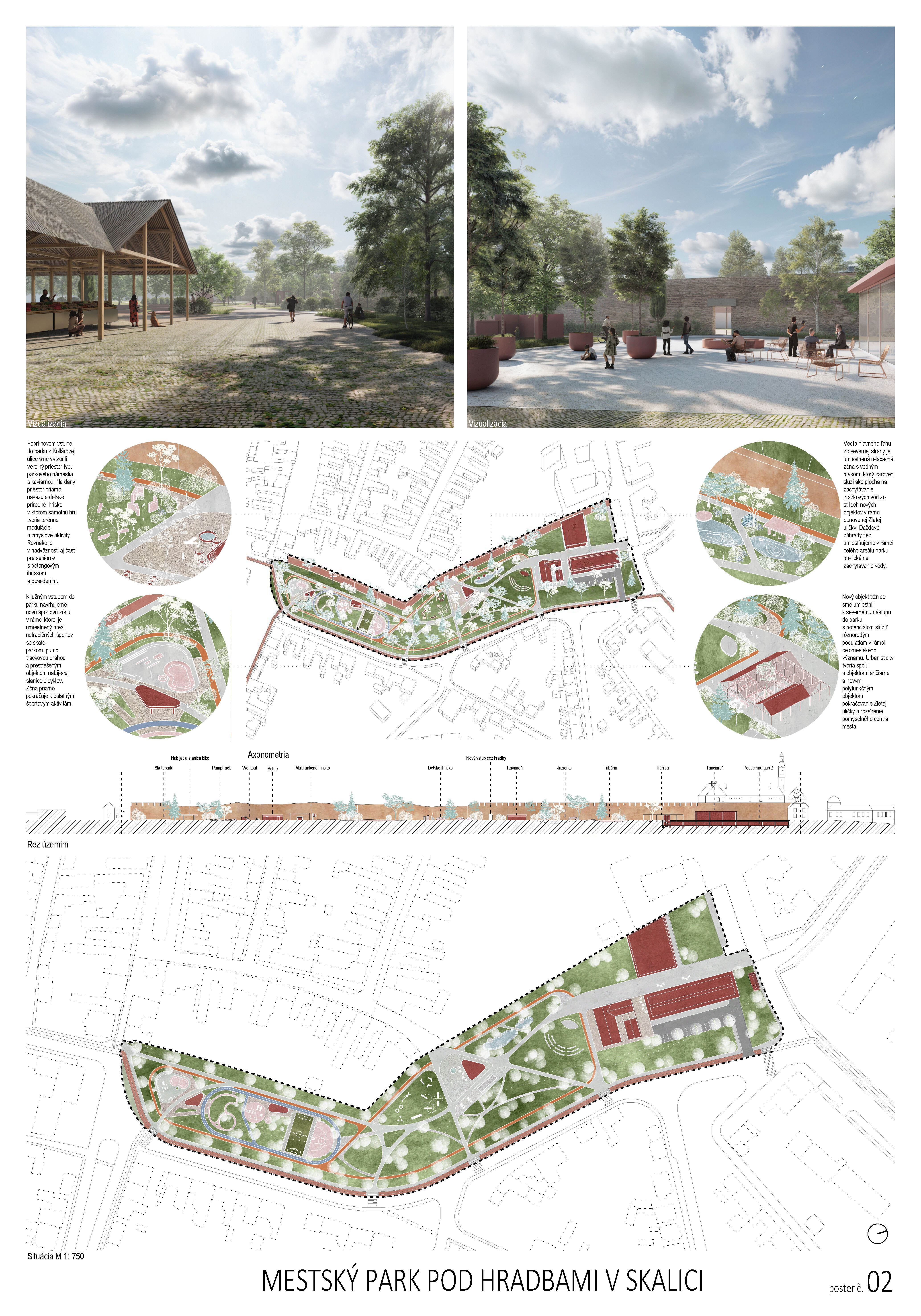 Výchozím principem návrhu je dôsledný rešpekt k historickej hradbe, ktorá je hlavným nositeľom genia loci parku; hradba sa preto nikde neobestavuje. Tento princíp však autori čiastočne porušujú navrhovanou stromovou zeleňou v ochrannom pásme hradby v južnej časti. Navrhované prierazy hradby v miestach považovaných za urbanisticky nevyhnutné sú logické, avšak priechod pri ulici Kollárovej nepokračuje k novému „hlavnému“ vstupu do parku a prepojenie so ZUŠ chýba úplne. Urbanistické a architektonické riešenie „Zlatej uličky“ kombinuje nostalgiu so súdobým výrazom, no pôsobí nepresvedčivo; štítová poloha novostavieb popiera tradičnú parceláciu skalického jadra. Zásadným prvkom návrhu je dvojpodlažná podzemná garáž – veľkorysé, ale nákladné riešenie s ťažko koordinovateľnou etapizáciou. Porota oceňuje snahu o prehľadné väzby a starostlivo riešené vstupy (na severe „Zlatou uličkou“, v zlome parku nový hlavný vstup).