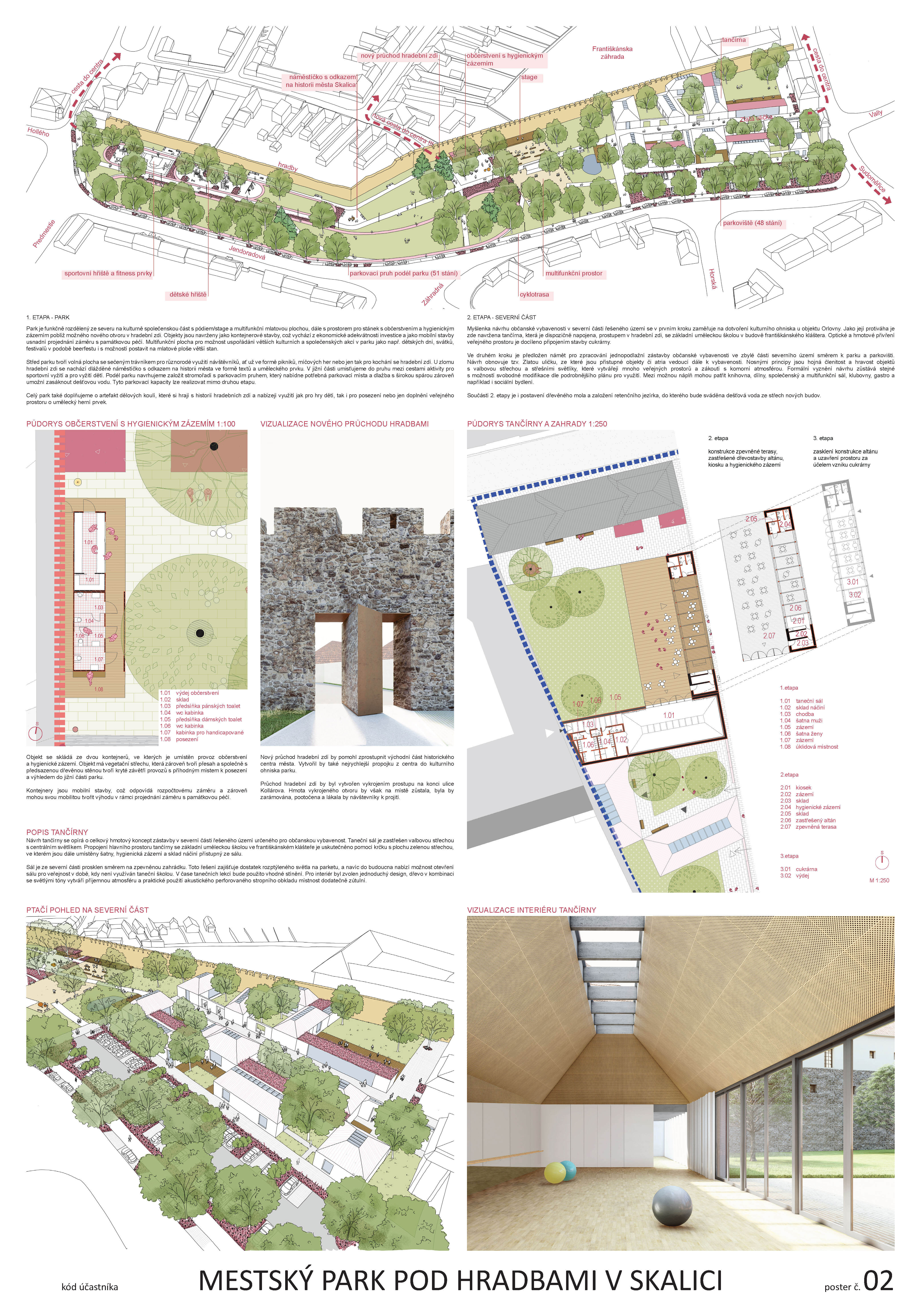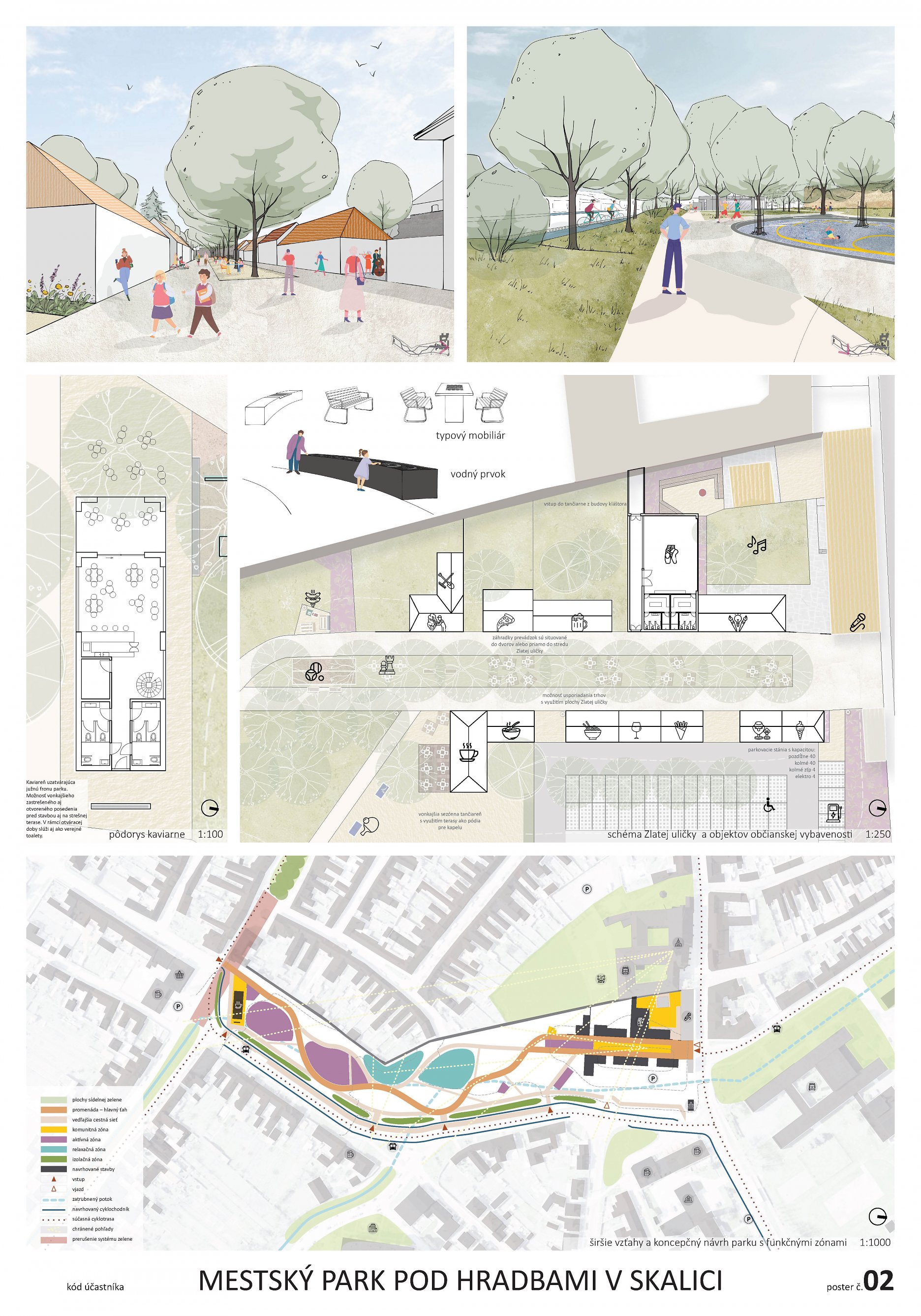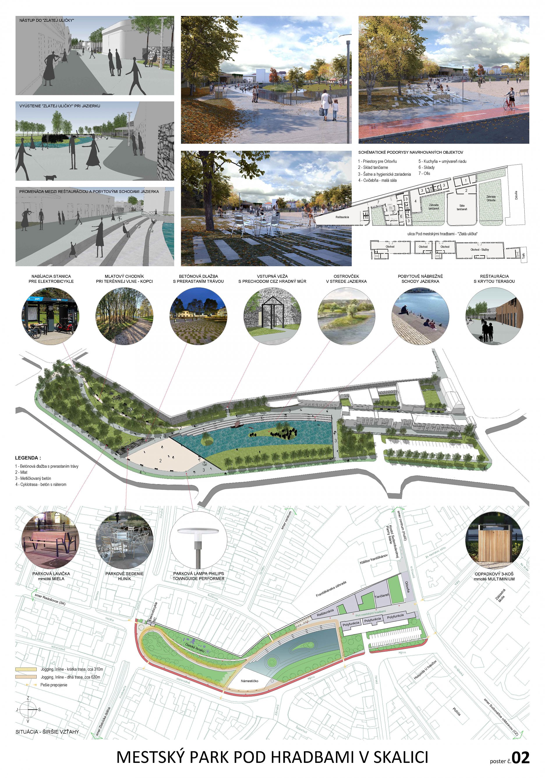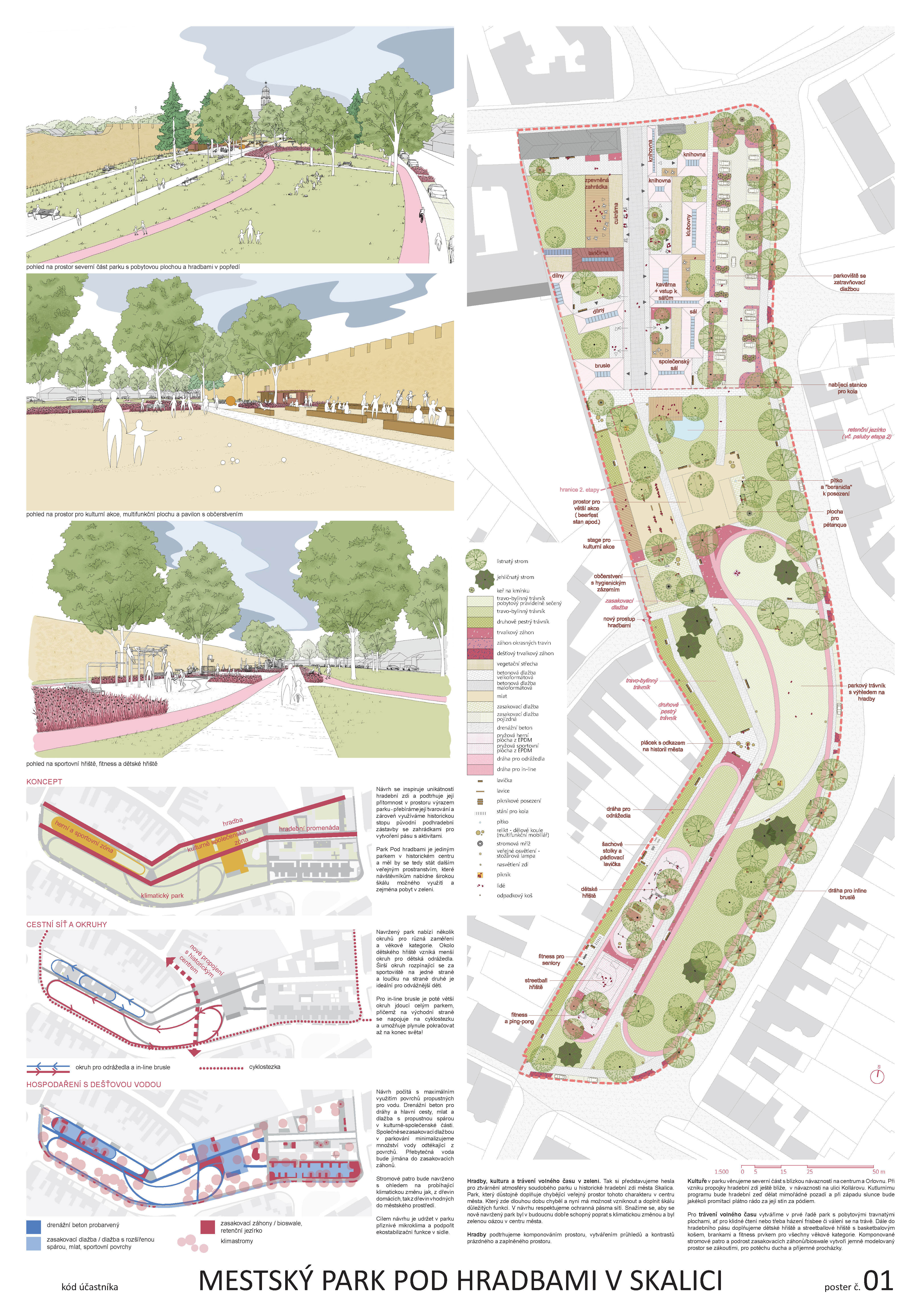 Výchozím principem návrhu je dôsledný rešpekt k historickej hradbe, ktorá je hlavným nositeľom genia loci parku; hradba sa preto nikde neobestavuje. Tento princíp však autori čiastočne porušujú navrhovanou stromovou zeleňou v ochrannom pásme hradby v južnej časti. Navrhované prierazy hradby v miestach považovaných za urbanisticky nevyhnutné sú logické, avšak priechod pri ulici Kollárovej nepokračuje k novému „hlavnému“ vstupu do parku a prepojenie so ZUŠ chýba úplne. Urbanistické a architektonické riešenie „Zlatej uličky“ kombinuje nostalgiu so súdobým výrazom, no pôsobí nepresvedčivo; štítová poloha novostavieb popiera tradičnú parceláciu skalického jadra. Zásadným prvkom návrhu je dvojpodlažná podzemná garáž – veľkorysé, ale nákladné riešenie s ťažko koordinovateľnou etapizáciou. Porota oceňuje snahu o prehľadné väzby a starostlivo riešené vstupy (na severe „Zlatou uličkou“, v zlome parku nový hlavný vstup).