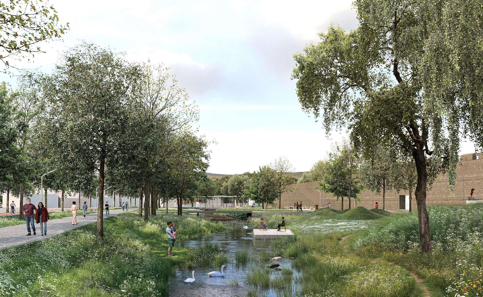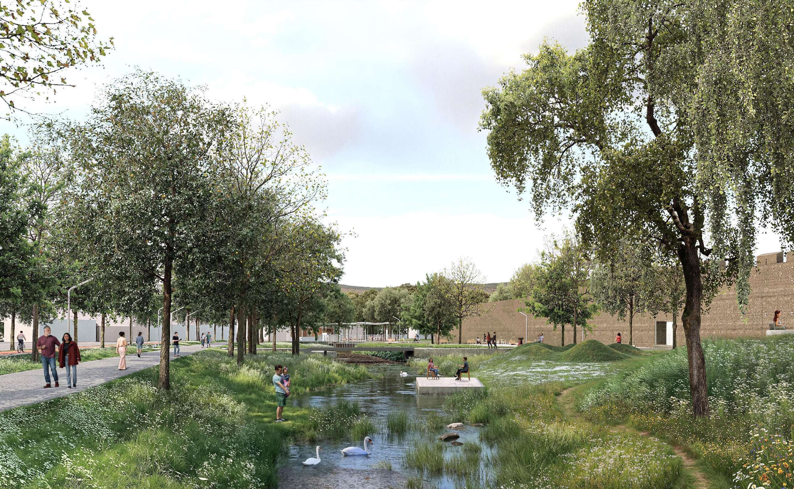 Územie je rozdelené na „biodiverzitný“ park, lúčne plochy a zónu so zástavbou a parkovaním; líniové prvky (trasy, stromoradia, osvetlenie) výslednú koncepciu kompaktňujú.