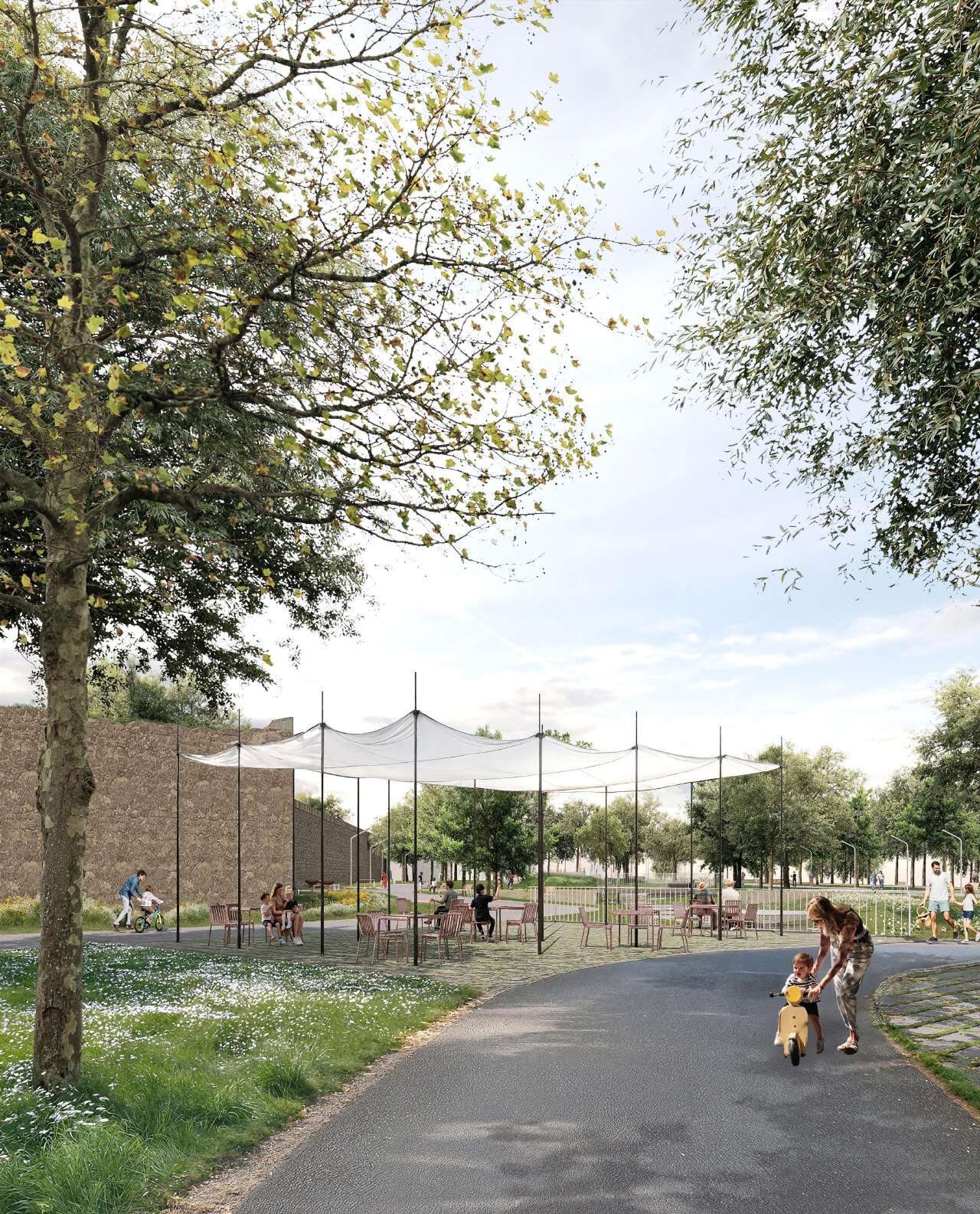 Základom návrhu je lineárny park v organických líniách, podčiarknutý dlhými lavičkami paralelnými s chodníkmi; hoci sú vizuálne pôsobivé, neposkytujú priestor na komunitné sedenie. Dominantu tvorí kruhový priestor s amfiteátrom a letným kinom, ktorý prerušuje lineárnu kompozíciu. Návrh uvažuje s pestrými dočasnými objektmi („cirkusovo“ ladené pavilóny), avšak ich funkcia i výraz pôsobia rozpačito. Stromová masa je sústredená predovšetkým po obvode, takže hradby ostávajú čitateľné; vysoký podiel nízkej zelene však vytvára v niektorých úsekoch vizuálnu bariéru. Porota kladne hodnotí terénne depresie na zadržanie dažďovej vody.