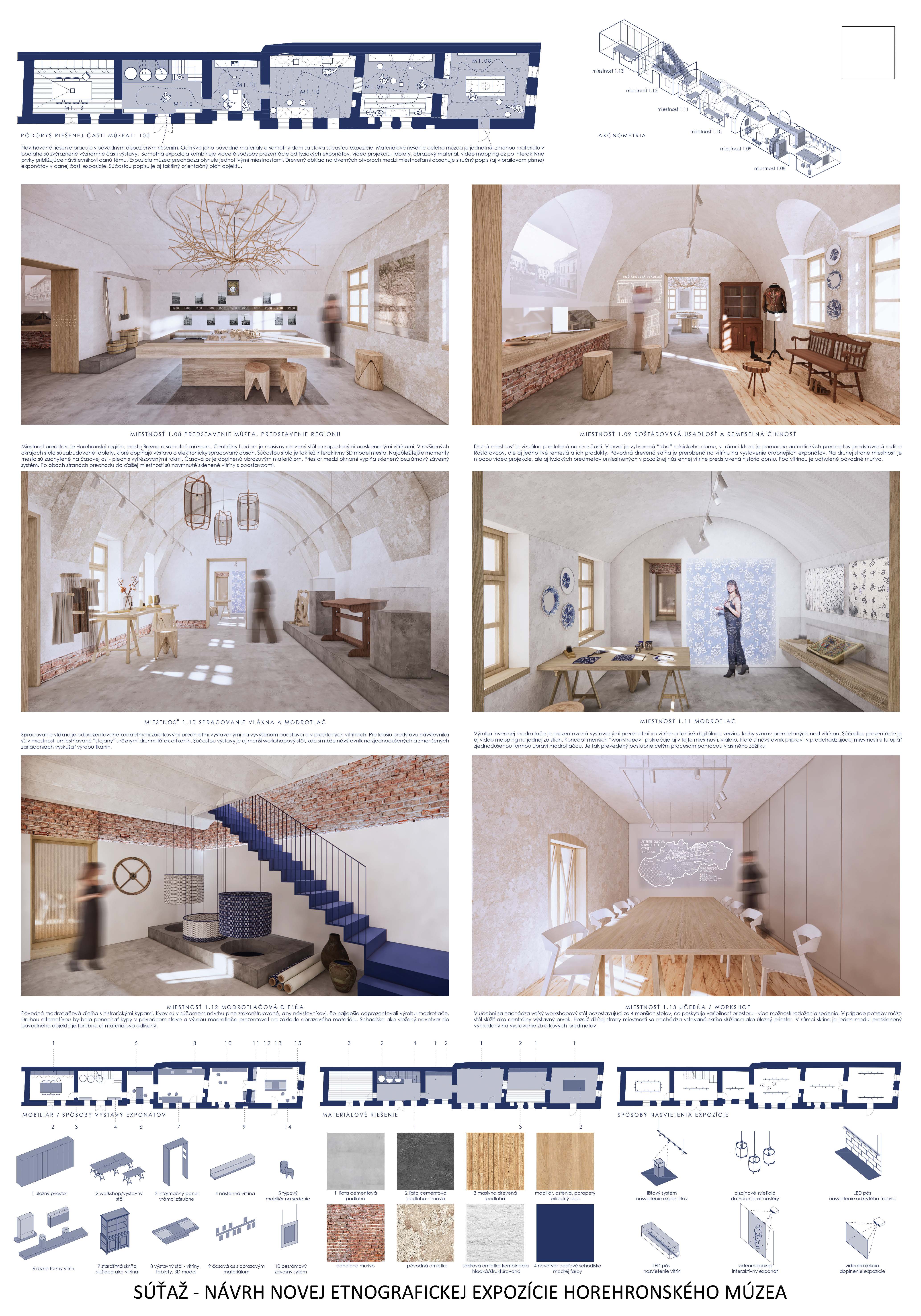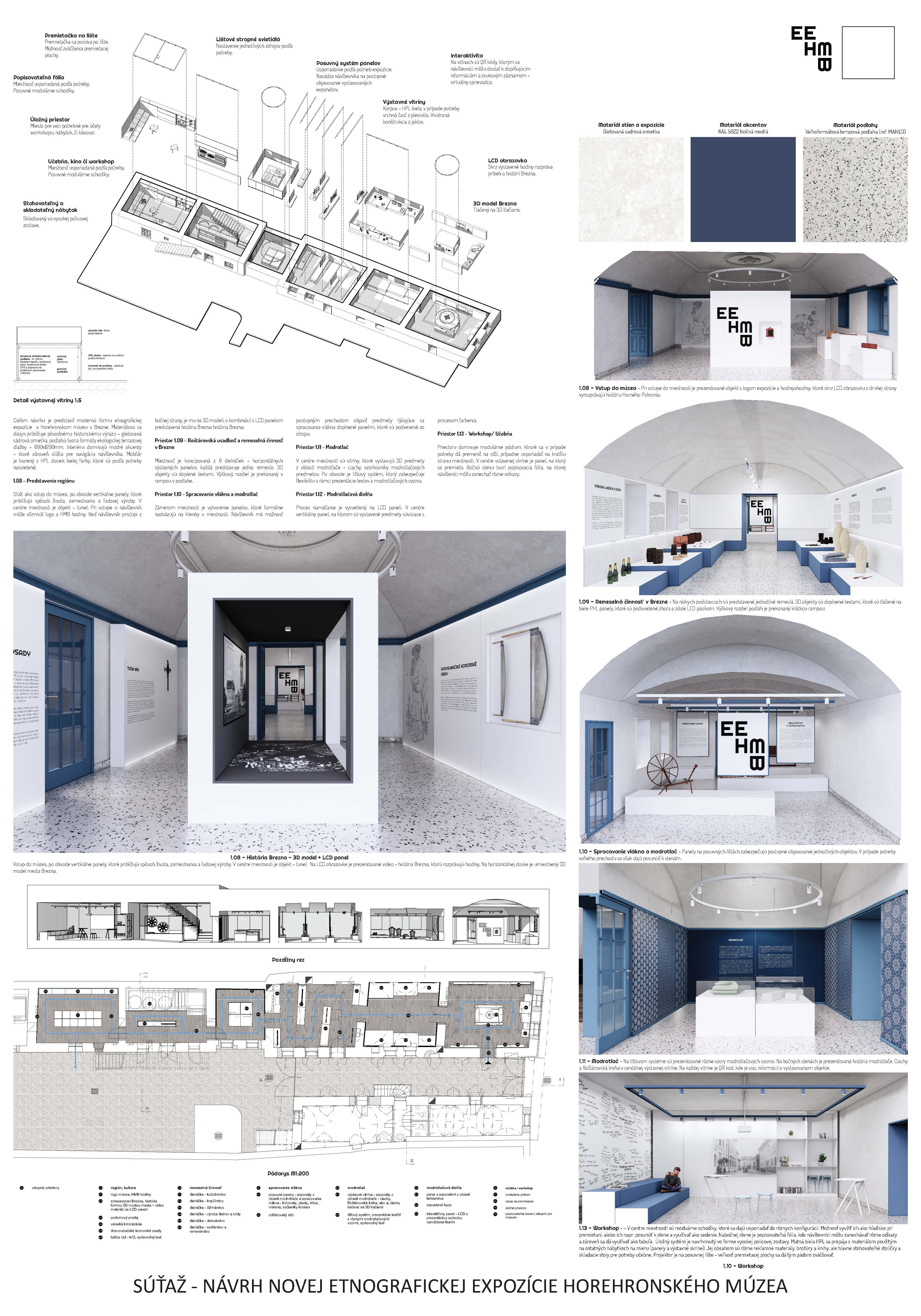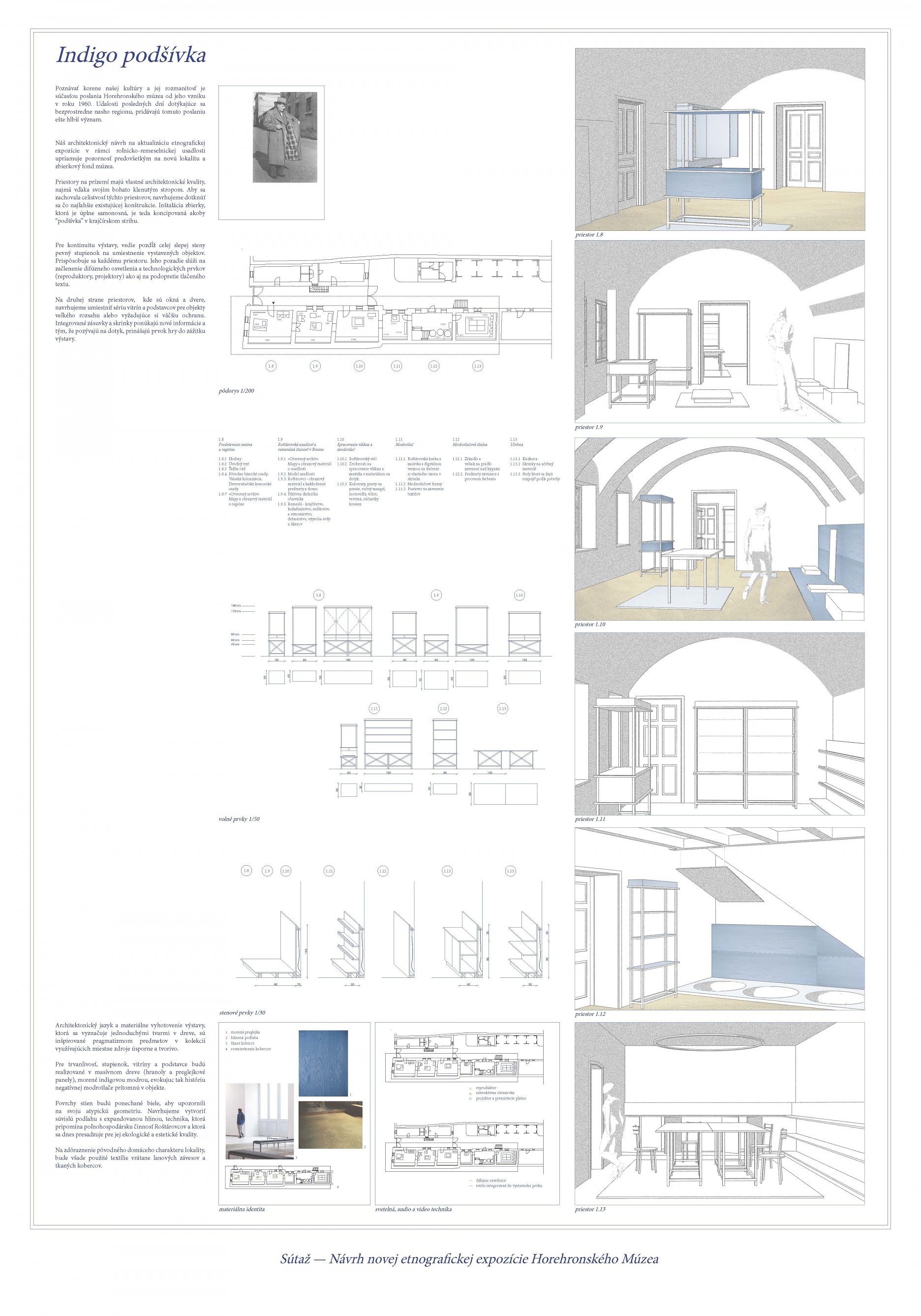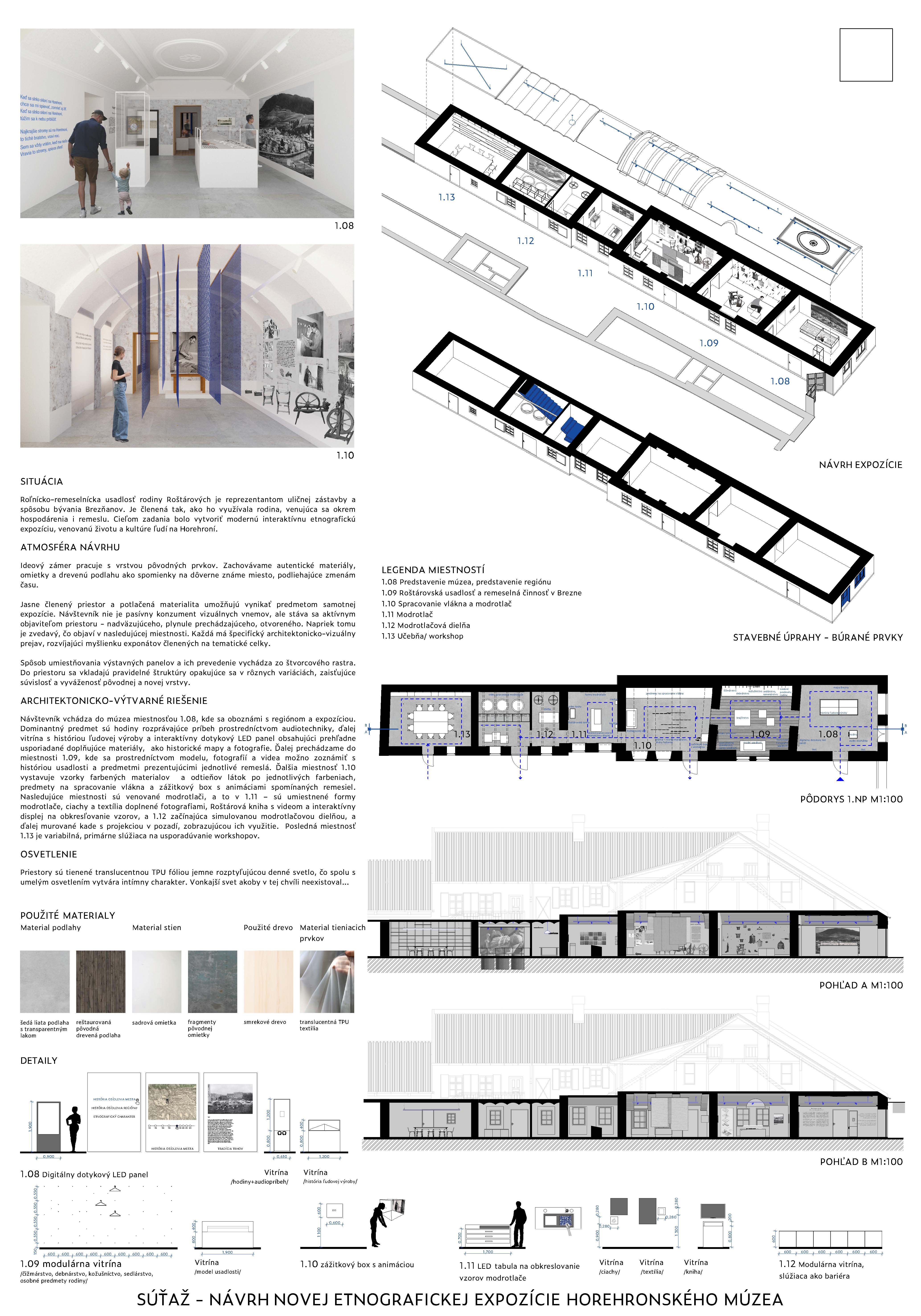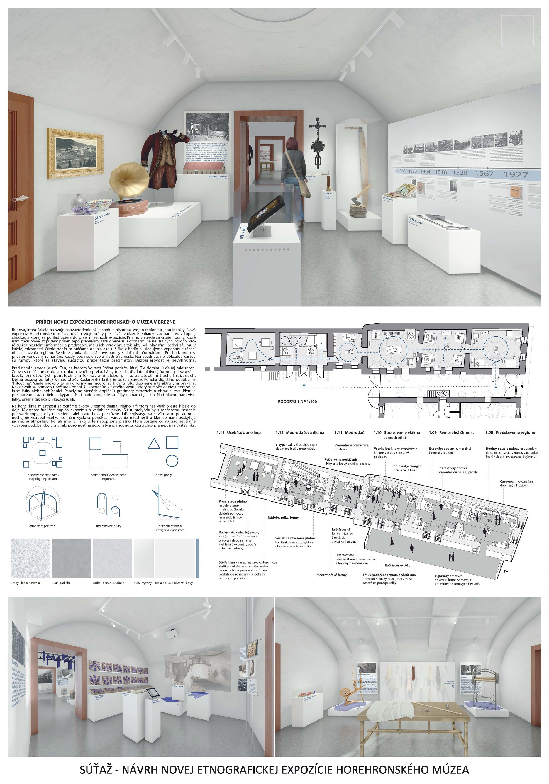 Komplexný dobre zvládnutý návrh pracujúci s výrazným dizajnom vitrín. Autorka neriešila len vizuál samotnej expozície, ale aj predpolie a dvor. Porota oceňuje v rámci návrhu expozície subtílnosť vitrín, ktoré dovoľuje použitý korten, no zároveň pochybuje o filozofickej/kontextuálnej vhodnosti tohto materiálu v etnografickej expozícií Horehronského múzea. Porota sa zhodla na tom, že zvolené architektonické riešenie vstupnej miestnosti nie je jednoznačne čitateľné, vitríny pôsobia „univerzálne” a poloha zbierkových predmetov je nejasná. Porota však oceňuje vizuálne pôsobenie fotografií v modro-bielom prevedení v kontexte s textilnou inštaláciou prezentujúcou modrotlač. Silnou stránkou návrhu je aj to, že autorka pracovala s myšlienkou kombinácie materiálov v podlahe. Porote sa tiež páčilo, že nové schodisko je tvarovo jasným odkazom na historické kypy a umožňuje im vystúpiť z tieňa pôvodného schodiska. Predmetný návrh je kvalitne spracovaný, ale svojou univerzálnosťou a nižšou mierou interaktivity dostatočne nepresvedčivý.