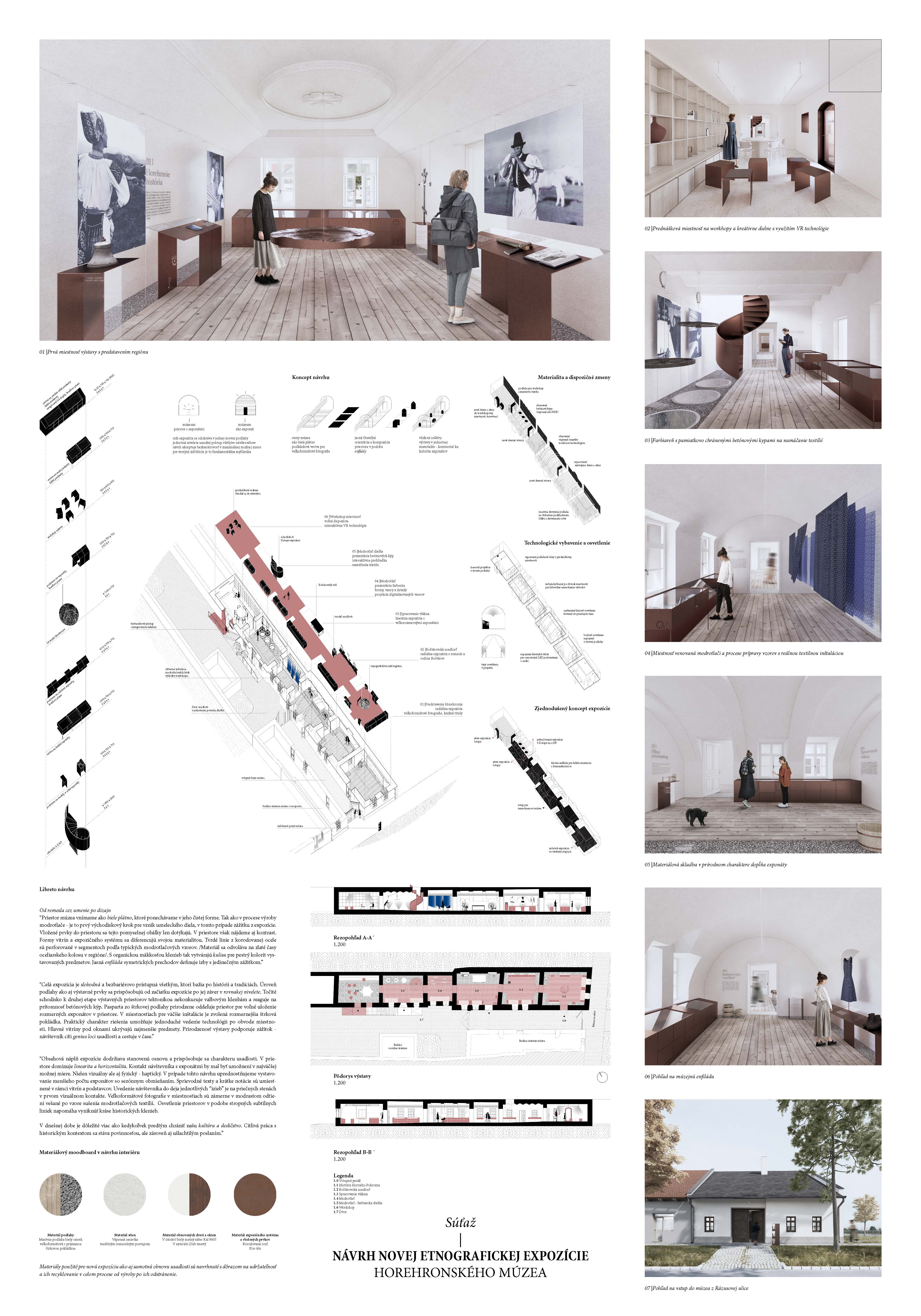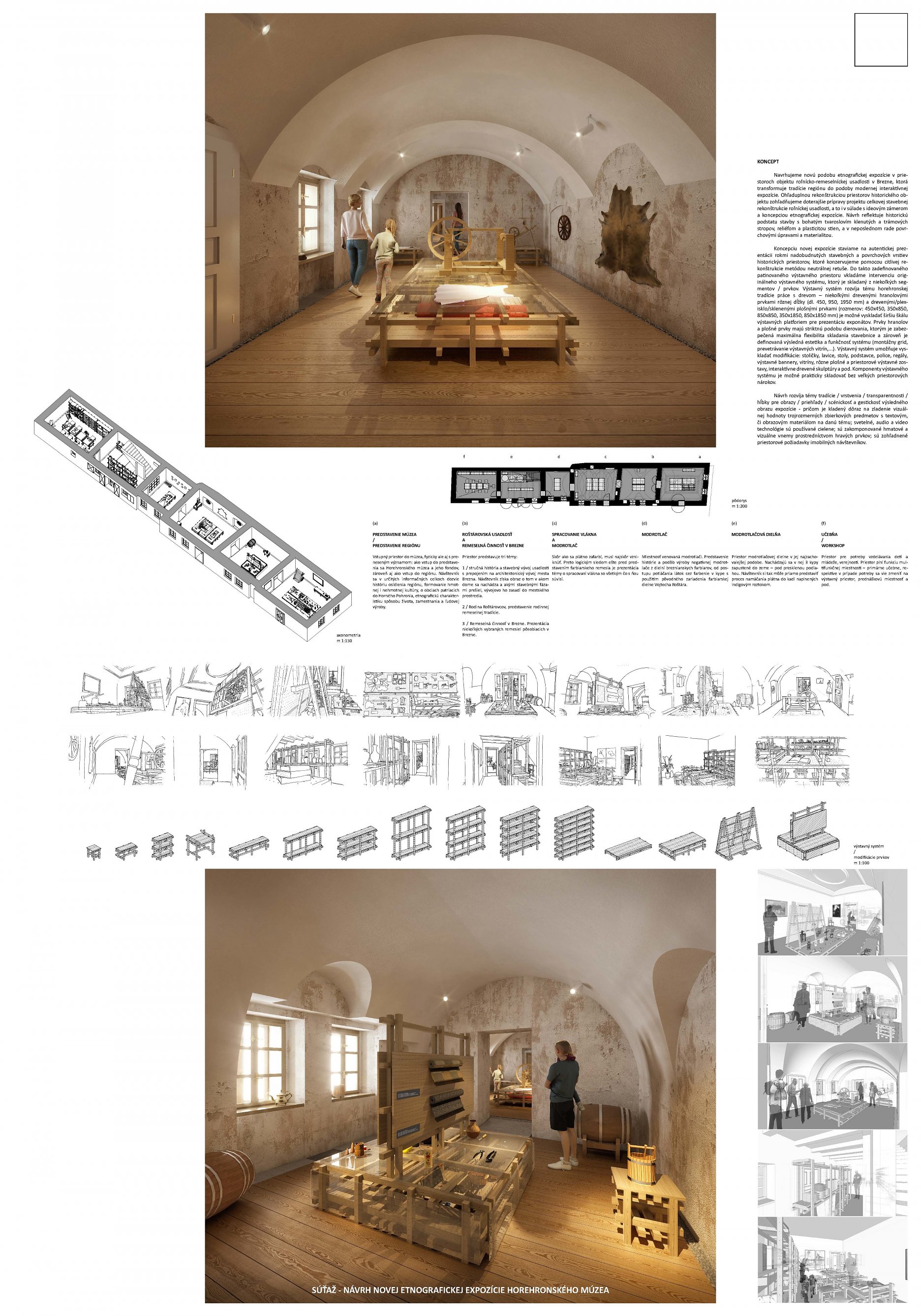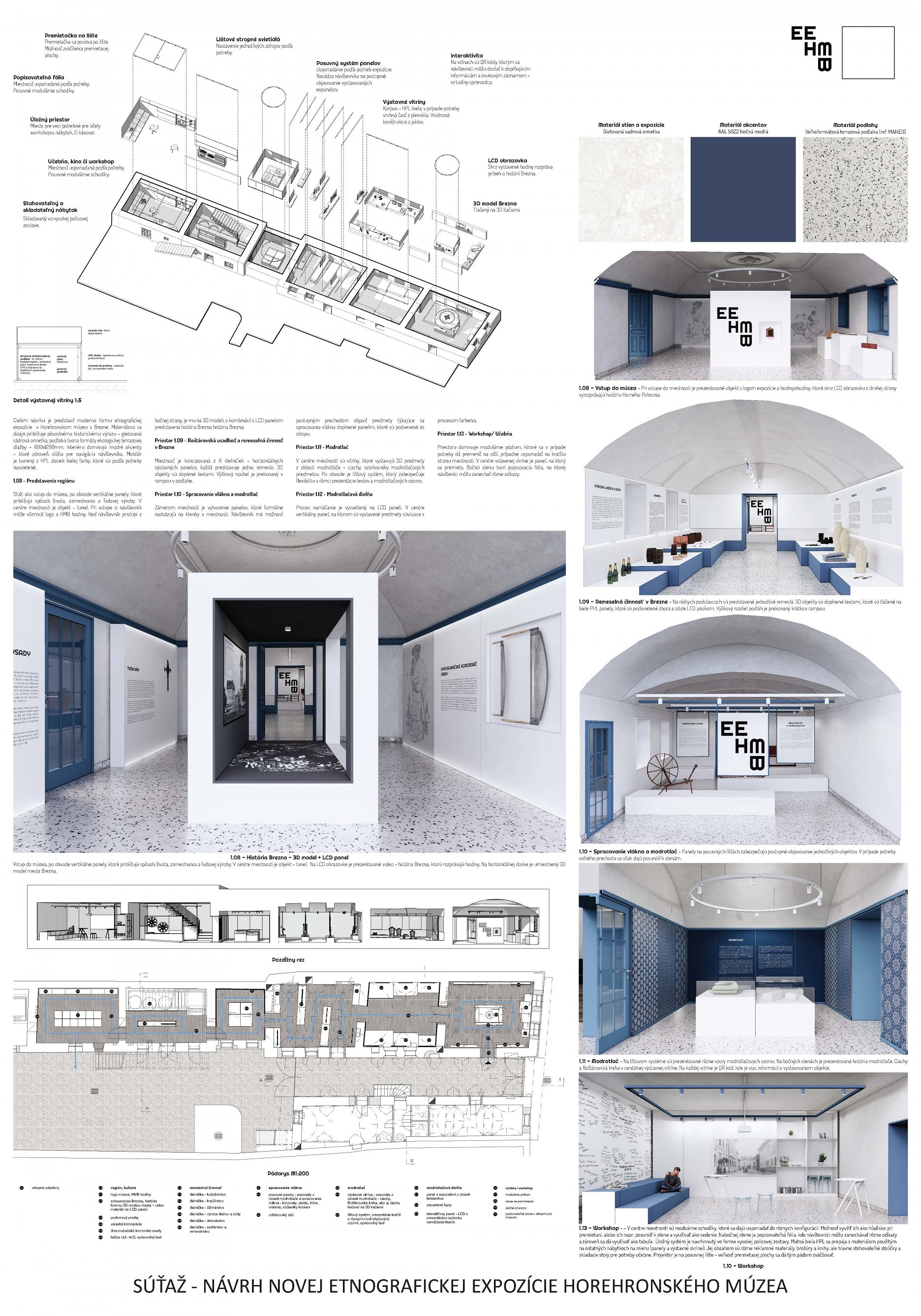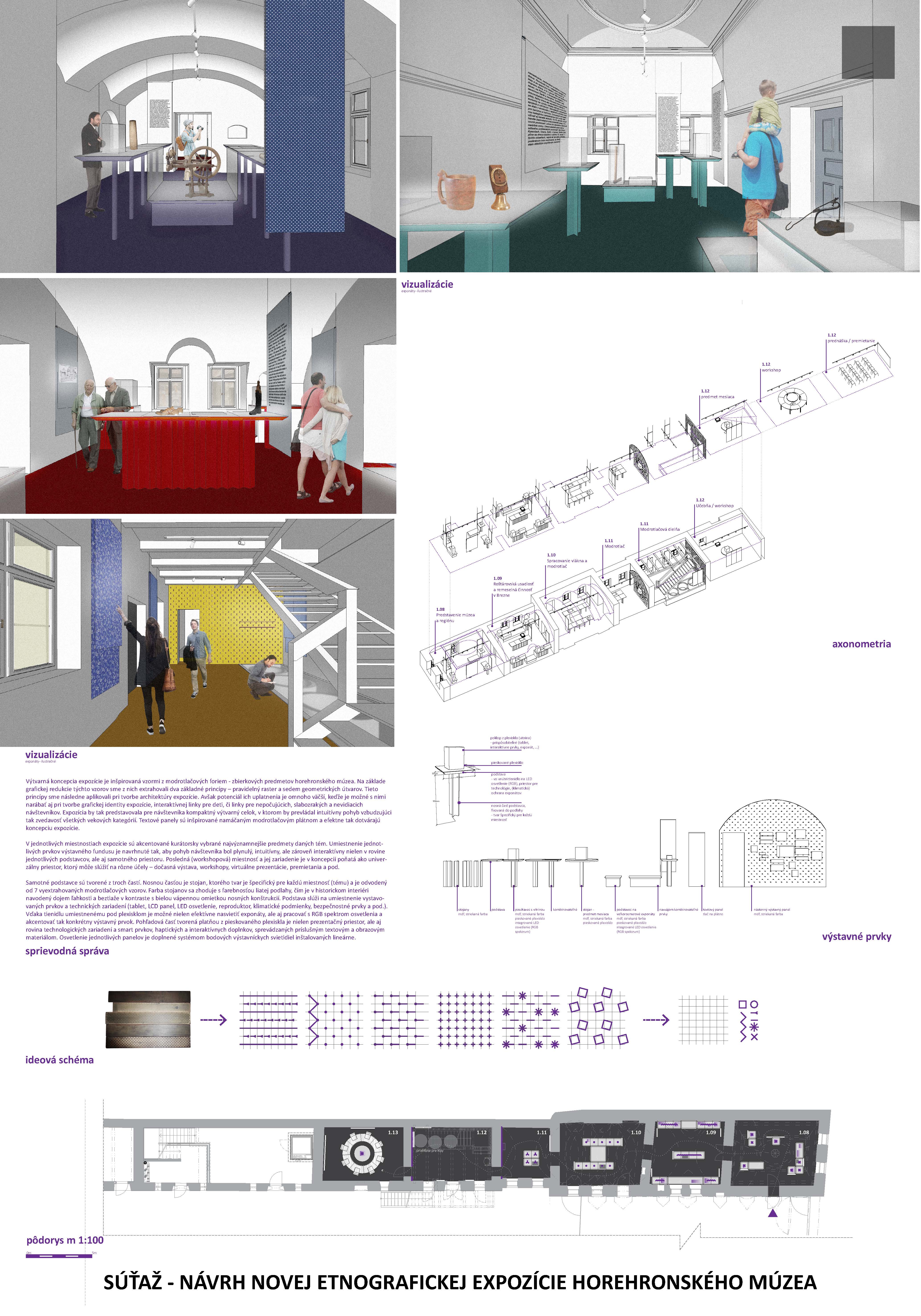 Komplexný dobre zvládnutý návrh pracujúci s výrazným dizajnom vitrín. Autorka neriešila len vizuál samotnej expozície, ale aj predpolie a dvor. Porota oceňuje v rámci návrhu expozície subtílnosť vitrín, ktoré dovoľuje použitý korten, no zároveň pochybuje o filozofickej/kontextuálnej vhodnosti tohto materiálu v etnografickej expozícií Horehronského múzea. Porota sa zhodla na tom, že zvolené architektonické riešenie vstupnej miestnosti nie je jednoznačne čitateľné, vitríny pôsobia „univerzálne” a poloha zbierkových predmetov je nejasná. Porota však oceňuje vizuálne pôsobenie fotografií v modro-bielom prevedení v kontexte s textilnou inštaláciou prezentujúcou modrotlač. Silnou stránkou návrhu je aj to, že autorka pracovala s myšlienkou kombinácie materiálov v podlahe. Porote sa tiež páčilo, že nové schodisko je tvarovo jasným odkazom na historické kypy a umožňuje im vystúpiť z tieňa pôvodného schodiska. Predmetný návrh je kvalitne spracovaný, ale svojou univerzálnosťou a nižšou mierou interaktivity dostatočne nepresvedčivý.