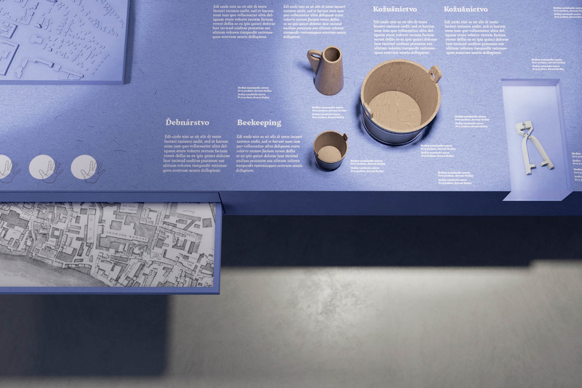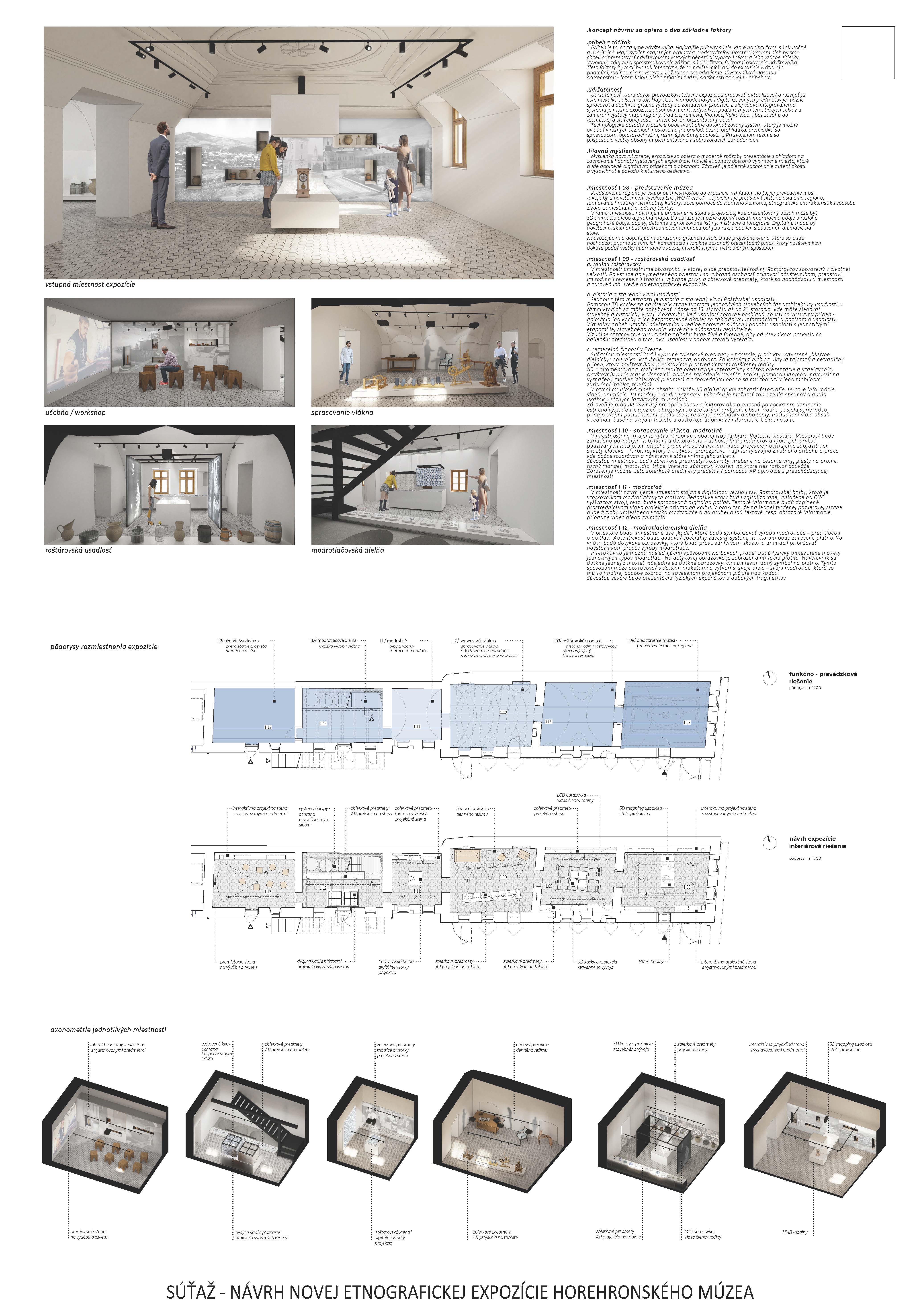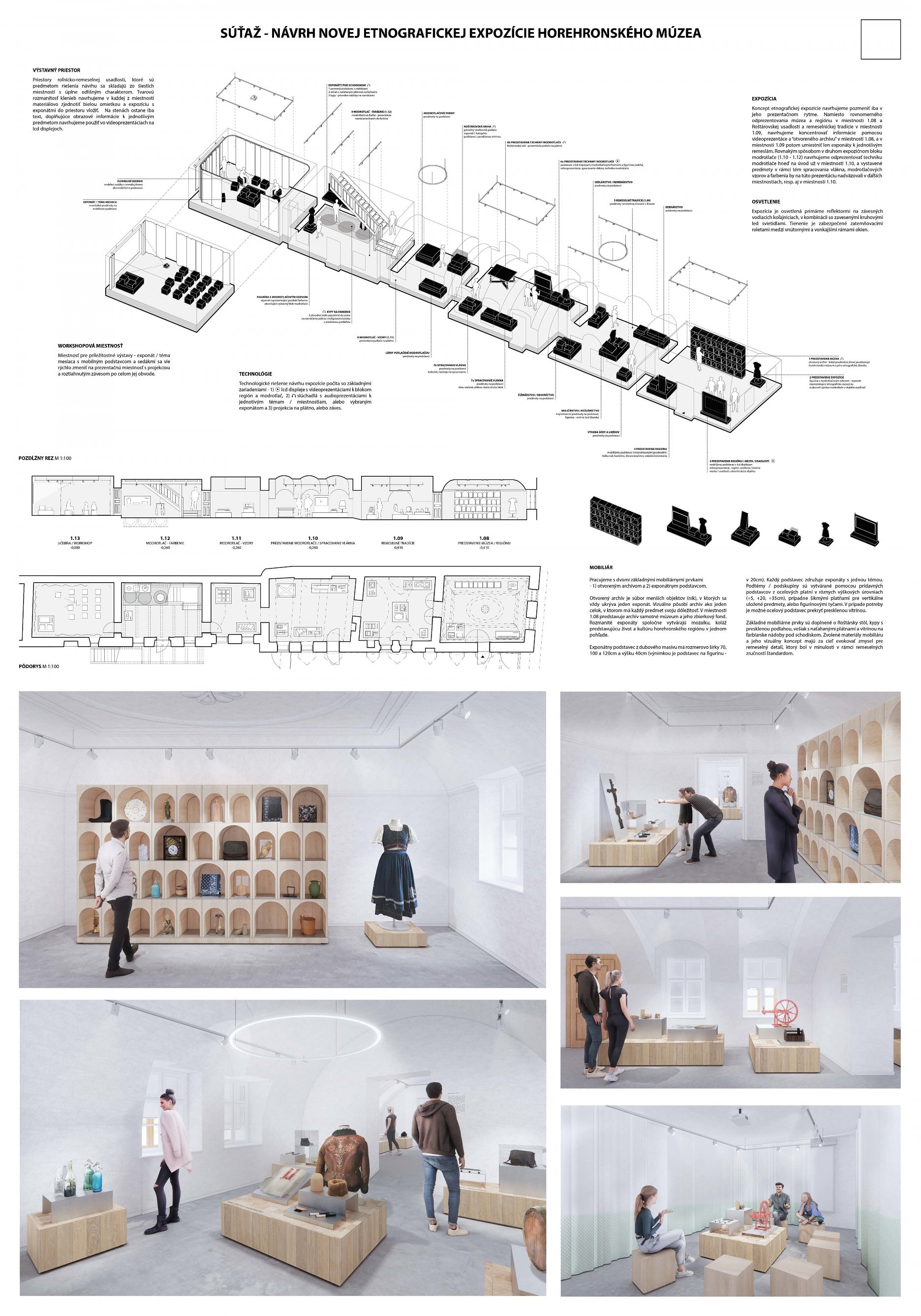 V súťažnom návrhu umiestnenom na prvom mieste autori predstavili presvedčivé a konzistentné architektonické riešenie s jasným konceptom a silným vizuálom. Toto riešenie nesúce súčasný výraz sa však zároveň správa citlivo k jestvujúcim historickým stavebným substanciám. Autori do objektu vniesli výrazný prvok pracovného stola, ktorý ponúka veľké možnosti interakcie založenej na realite priameho dotyku/výsuvu/posuvu/posluchu. Pri súčasných trendoch nie je nutné ponechávať zbierkové predmety za sklom a tento stôl ponúka ich voľné umiestenie, príp. výmenu podľa potrieb Horehronského múzea. Porota oceňuje možnosti vnímania expozícií imobilnými návštevníkmi. V ďaľšej fáze porota odporúča rozpracovať farebnosť pracovného stola v kontexte zbierkových predmetov a histórie objektu, kde by mal byť odkaz na modrotlač najsilnejší v miestnosti modrotlače a modrotlačovej dielne.